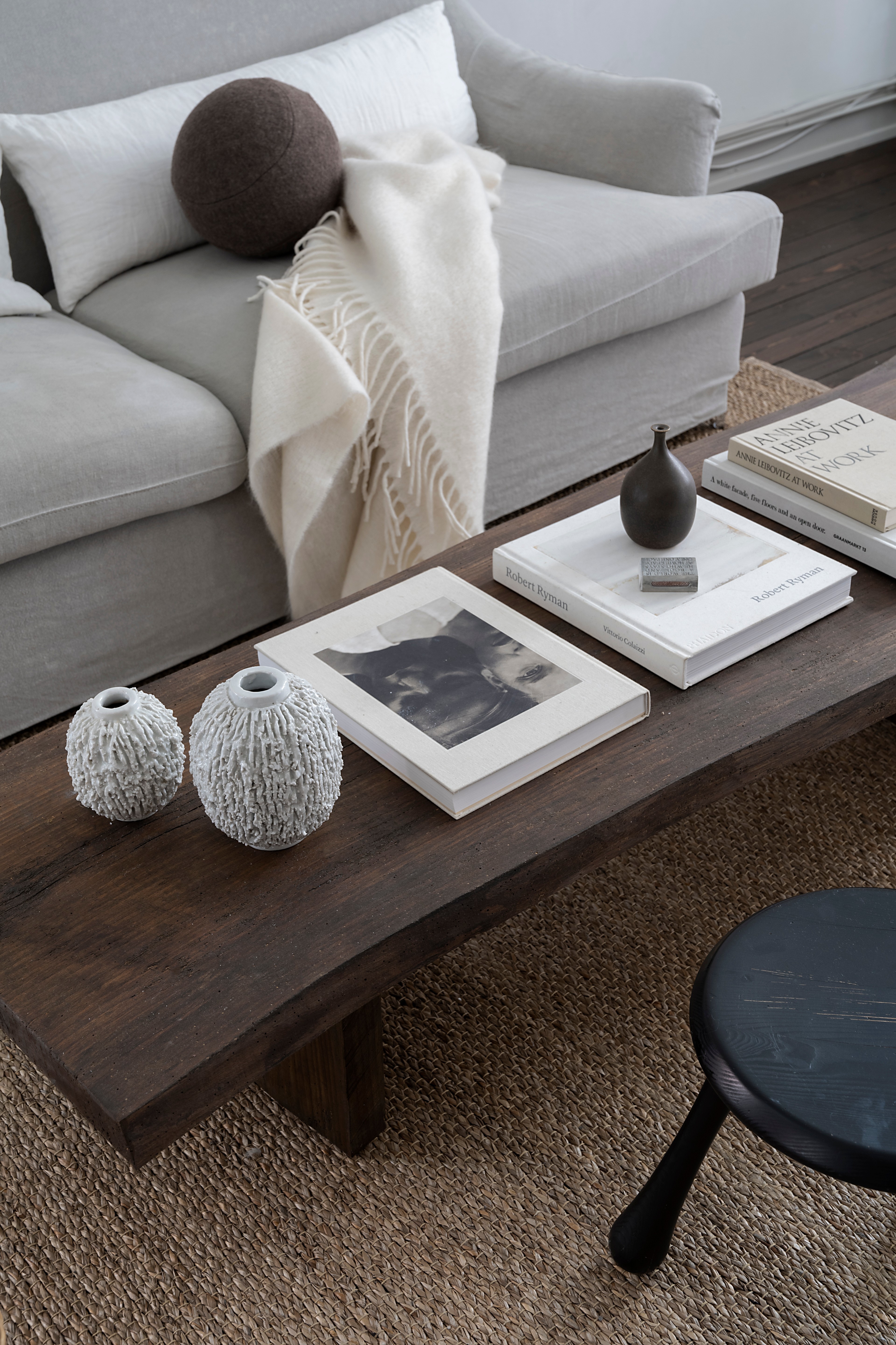 To complement the rustic walls, Lovisa has consistently chosen woven linen curtains, but in different tones in the different rooms. In the living room and office, woven linen curtains hang in off-white, while the bedroom, with its slightly darker and warmer color, the color sand drapes the window. In all rooms, the curtains are mainly decorative, and hang parked at the sides of the bay windows in black curtain rods. Lovisa says that the textile feel was the most important thing in the choice of curtains and suspension, rather than the function of being able to pull them back and forth.