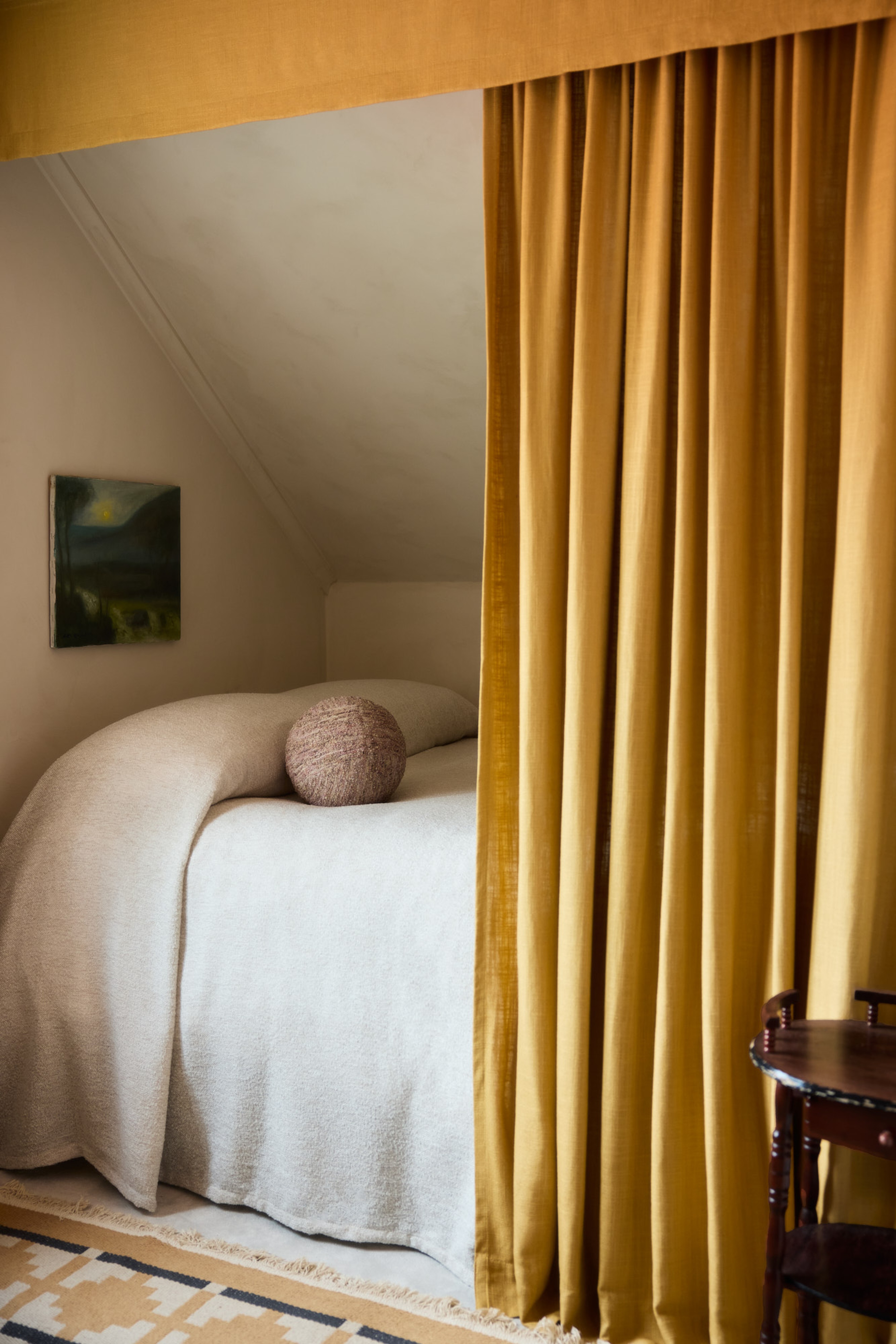 The children’s rooms have been designed with care, with Louise aiming to create personal and cozy nooks for each child. In one room, the bed has been transformed into a snug hideaway under the slanted ceiling, framed by a combination of valances and curtains in mustard and sand tones. These colors are echoed in rugs with traditional Röllakan patterns and other details that bring warmth and playfulness to the space. In the adjacent room, terracotta and pink tones dominate, with a soft, wavy valance and pink linen curtains adding a welcoming and personal touch.