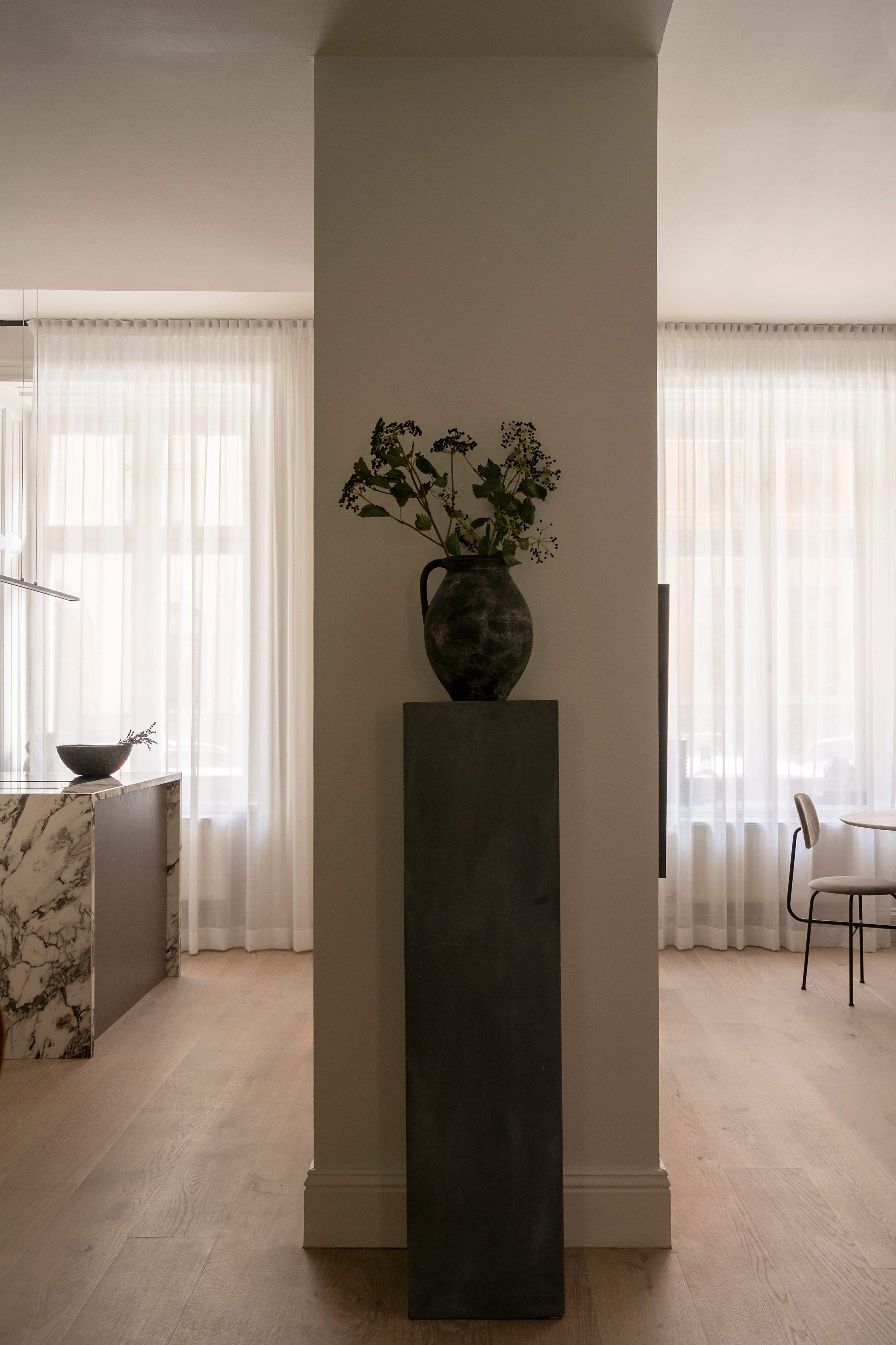 Att valet föll på just hotellgardinerna genomgående i hela lägenheten skapar en enhetlighet i inredningen, längs med en hel vägg i vardagsrum och kök och i kombination med en mörkläggande sammetsgardin i sovrummen. Matilda har låtit gardinerna sväva över golvet, av praktiska anledningar då tre av fem familjemedlemmar i dagsläget (2 katter + Bob, 1år) rör sig på golvnivå, även om hon själv älskar känslan av ett tungt släp.