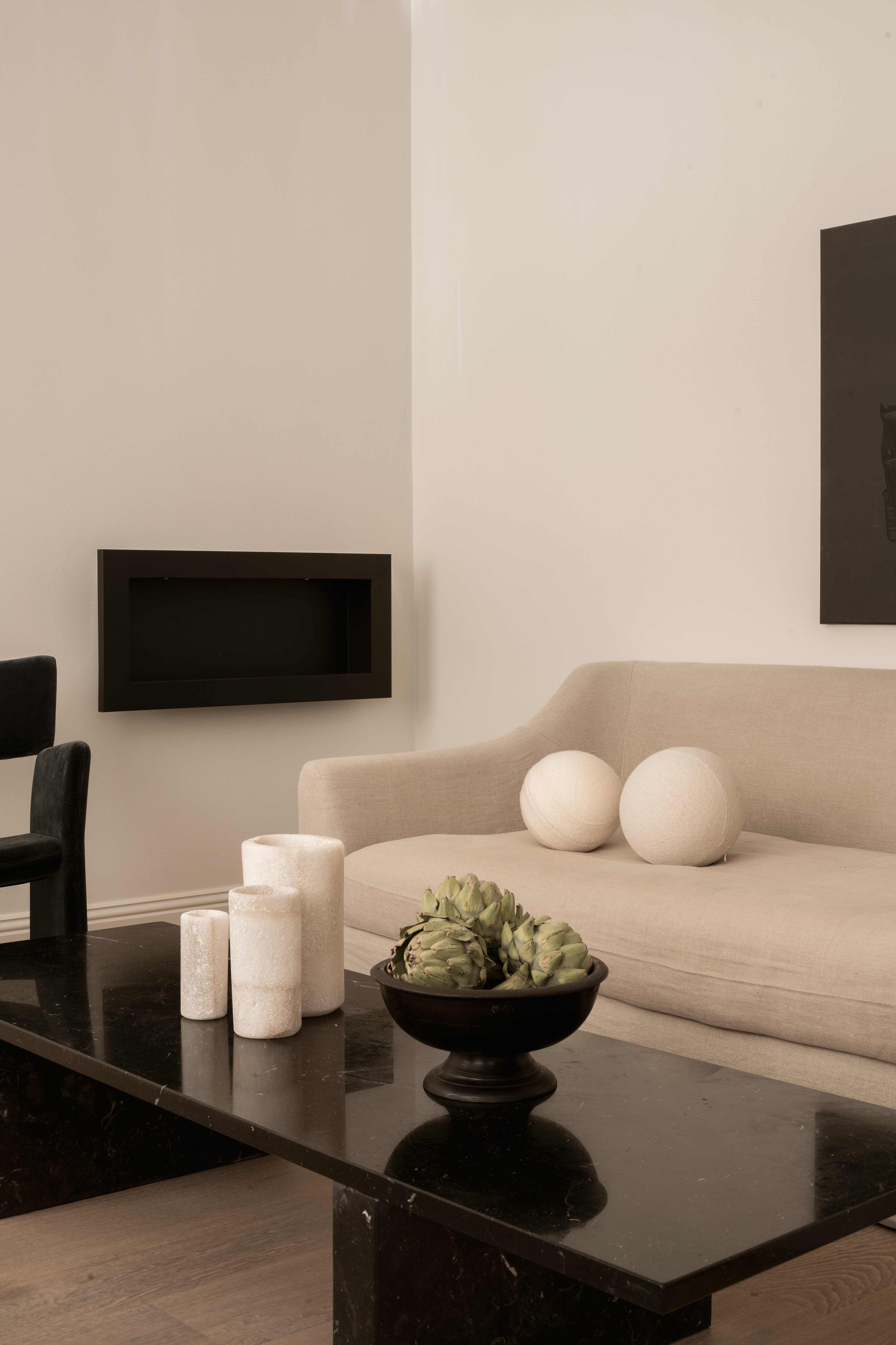 Kontrasterna mellan det mörka och det ljusa är ett genomgående tema i inredningen, och när det blev dags för gardiner så valde man faktiskt att ta ner existerande vita gardinskenor för att ersätta dessa med svarta skenor. Det svarta plockas även upp i soffbordet, även detta ett vintagefynd, som med sin avlånga form tar stor visuell plats utan att begränsa passagerna i rummet.