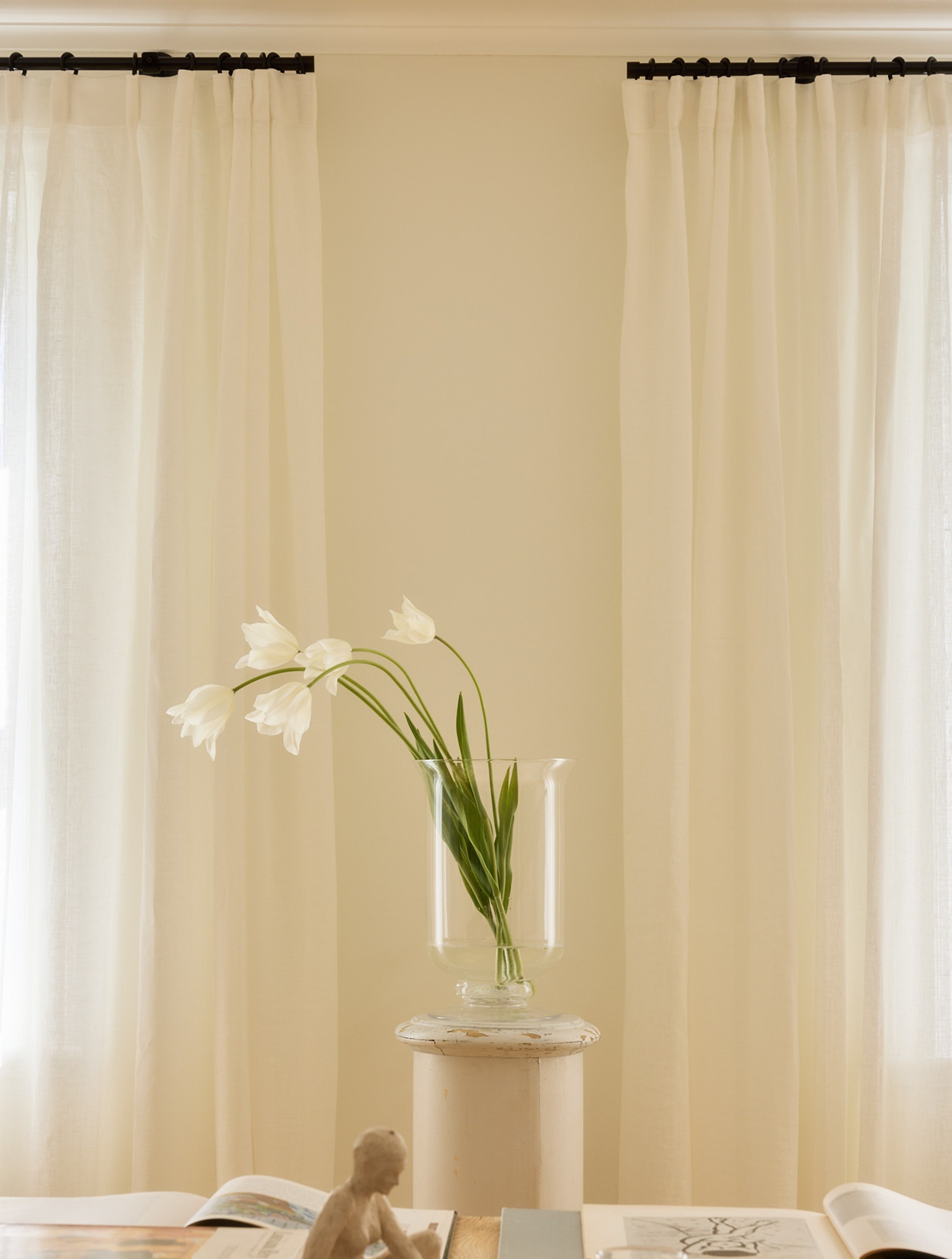 En gardinstång ger den tunna linnegardinen en tydligare närvaro i rummet. Tyget vilar mjukt över stången och skapar en klassisk, något mer dekorativ silhuett där varje veck blir en del av uttrycket. Resultatet är en inramning som känns ombonad, balanserad och medvetet stylad.