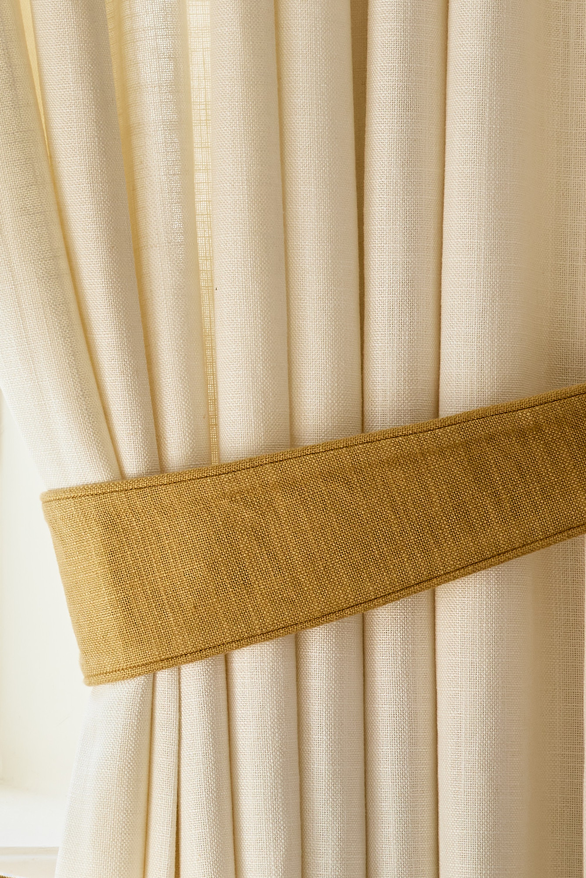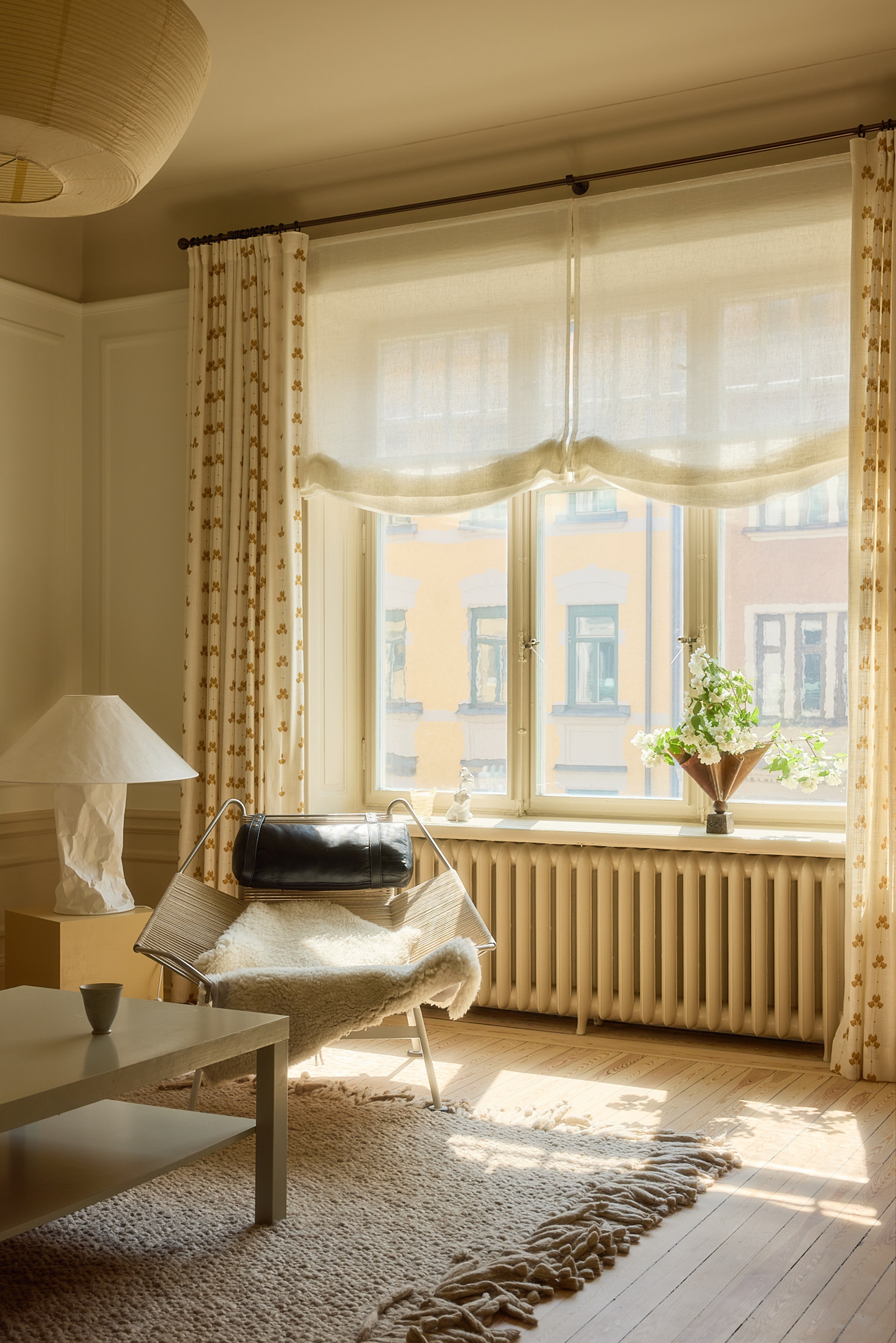 Ett gardinomtag förändrar rummets uttryck på ett enkelt sätt utan att byta gardin. Genom att dra undan tyget släpps mer ljus in samtidigt som fönstrets proportioner markeras.