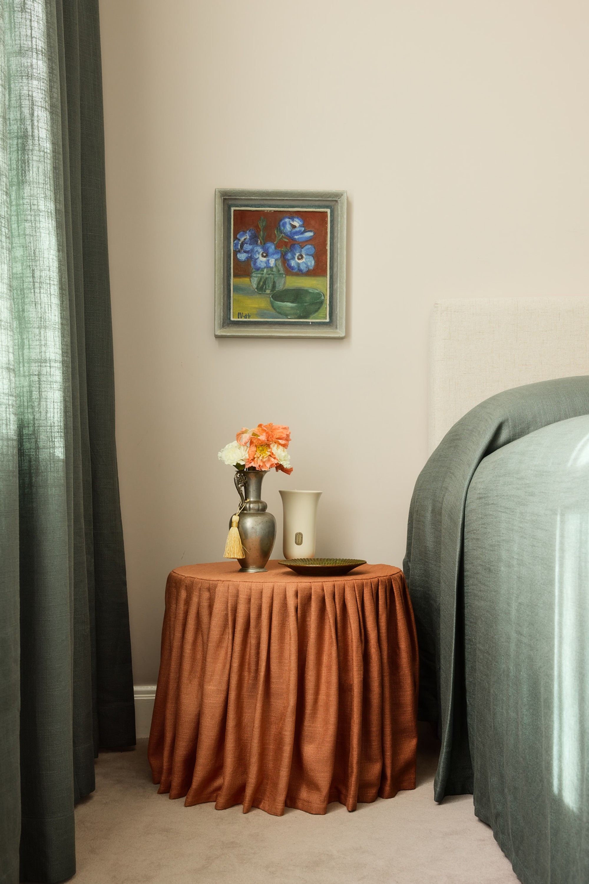 Att koordinera gardiner och överkast i samma ton eller mönster skapar ett sammanhållet uttryck och en tydlig riktning i inredningen. Det kan vara en exakt matchning eller en ton som plockar upp en färg i gardinen.