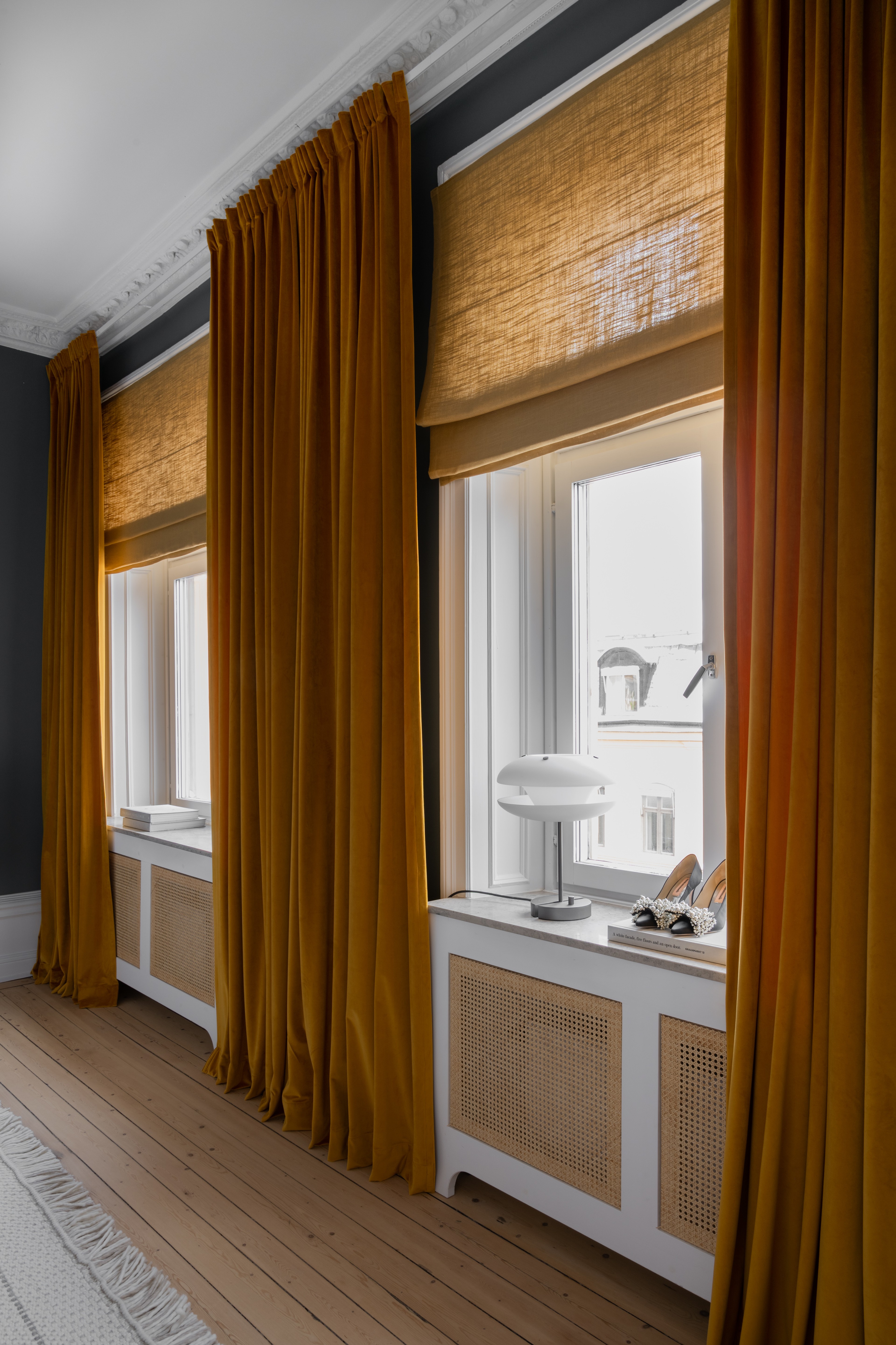Att jobba med kontrastfärger är inget som Jana är blyg för, och den starka senapsfärgen i sammetsgardinerna kan vara den ultimata partnern till den dova petroleum-nyansen av blått på väggarna. Färgerna tar verkligen fram det mesta ur varandra, och trots sin skarpa kontrast så är känslan balanserad. Att jobba med motsatsfärger är ett enkelt sätt att ta ut svängarna, kika på ett färghjul så ser du själv!