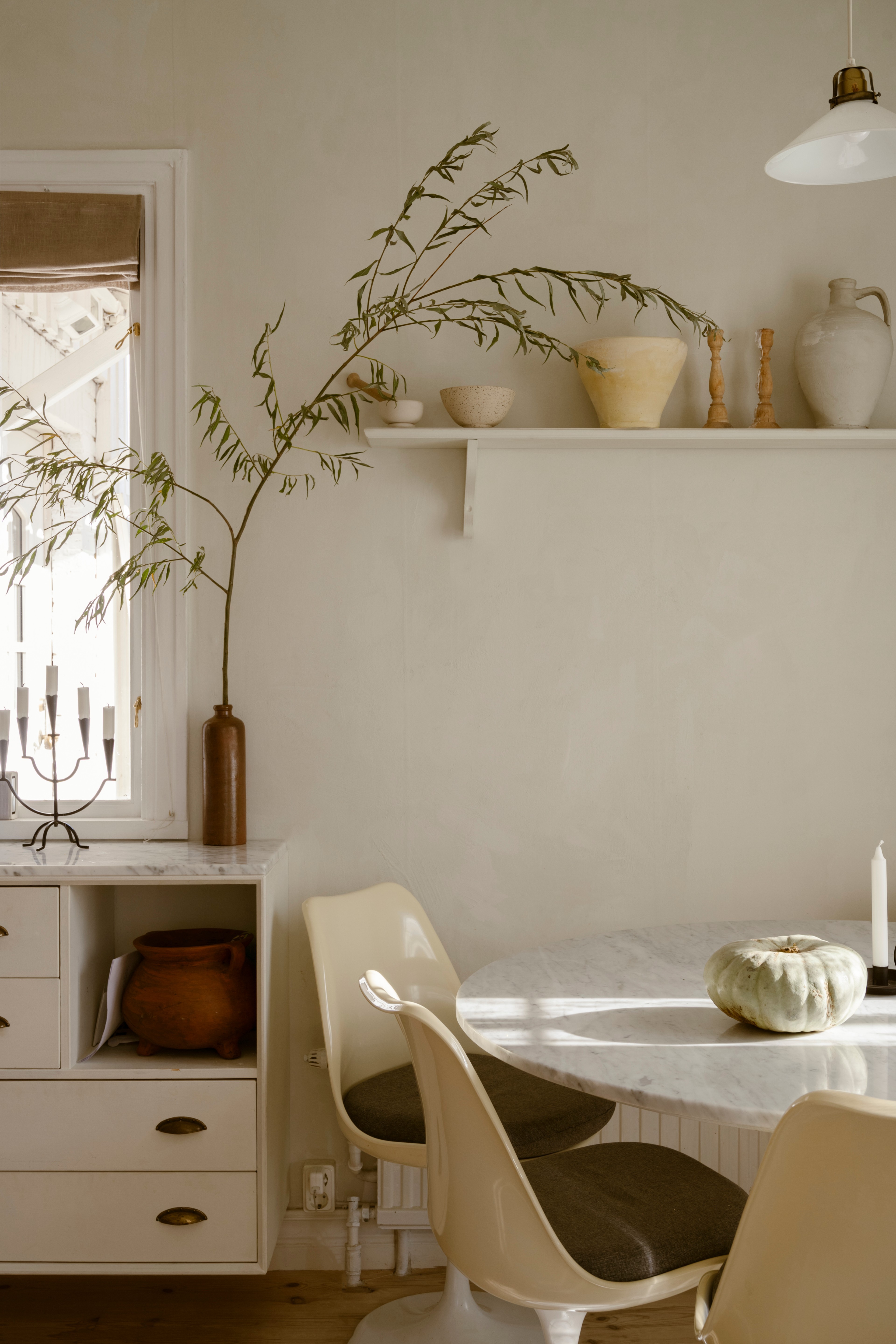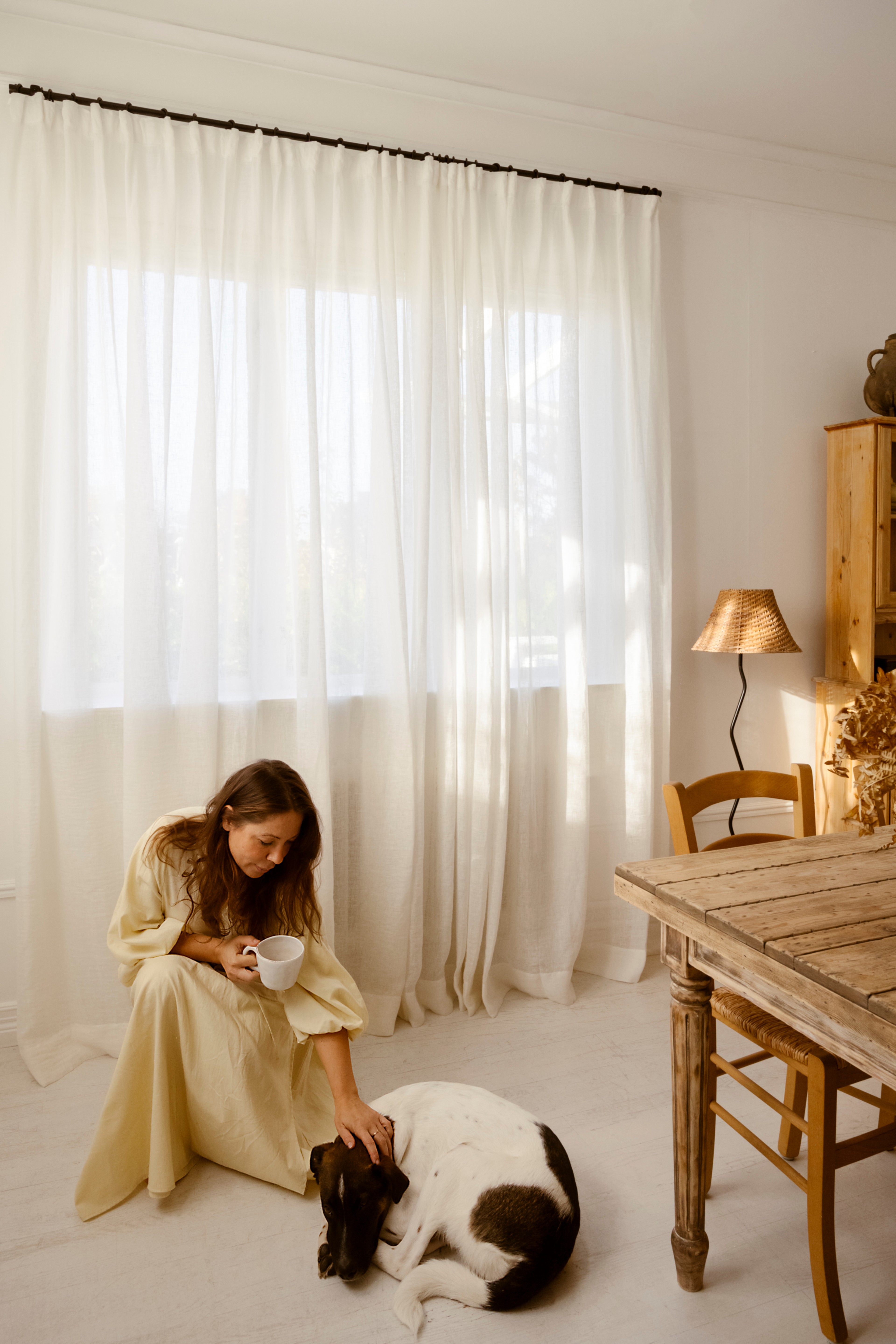 Drömmen att vara nära naturen har alltid varit närvarande hos Lina, och speglar sig även inredningen, där material som trä, linne och sten sätter tonen. Matsalen, som denna dag dränks i solsken, omges av tunna linnegardiner i vitt som sirlar ljuset till vackra mönster på golvet. För att förstärka den avslappnade och naturliga stilen hos Lina, så har gardinerna ett generöst släp mot golvet.