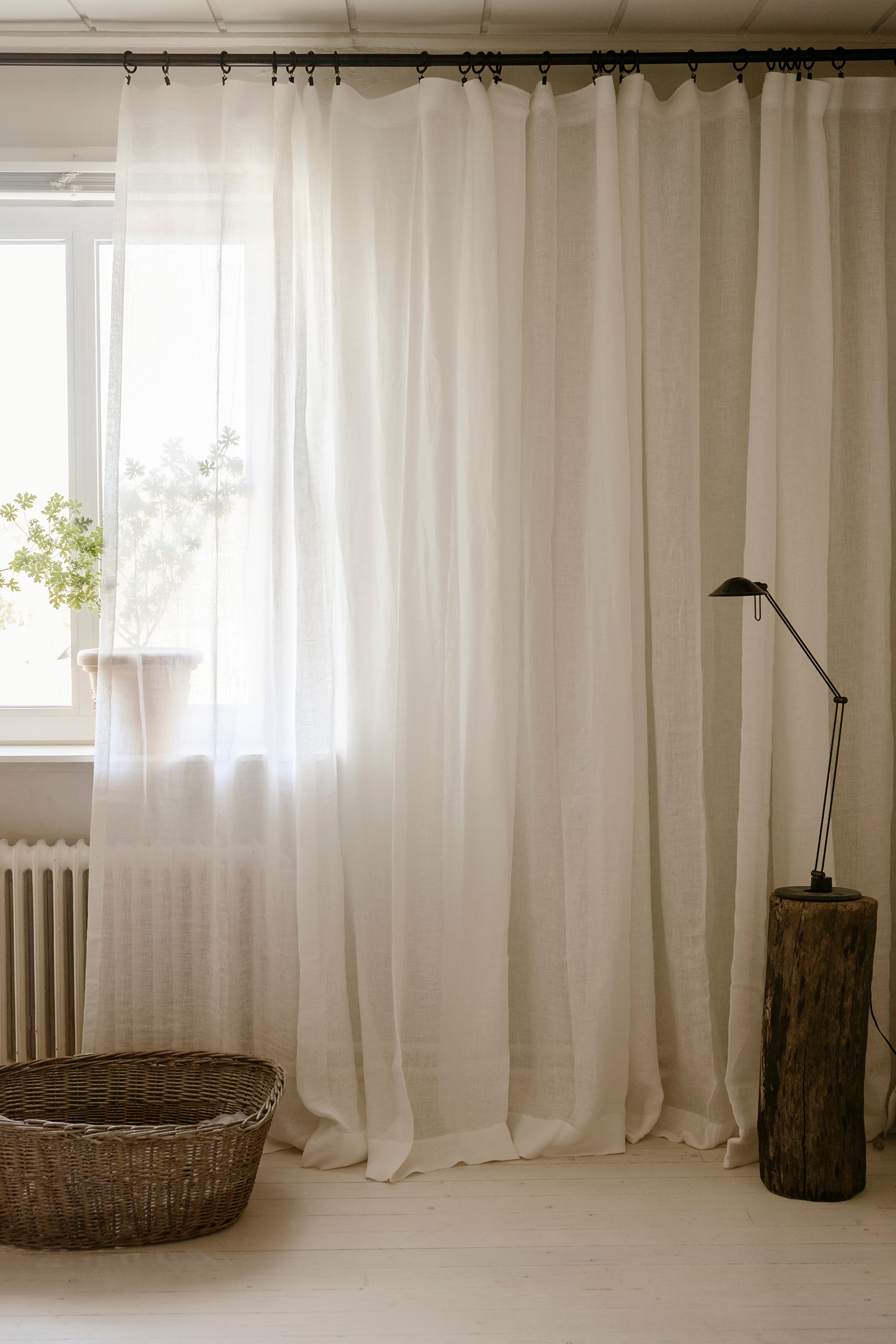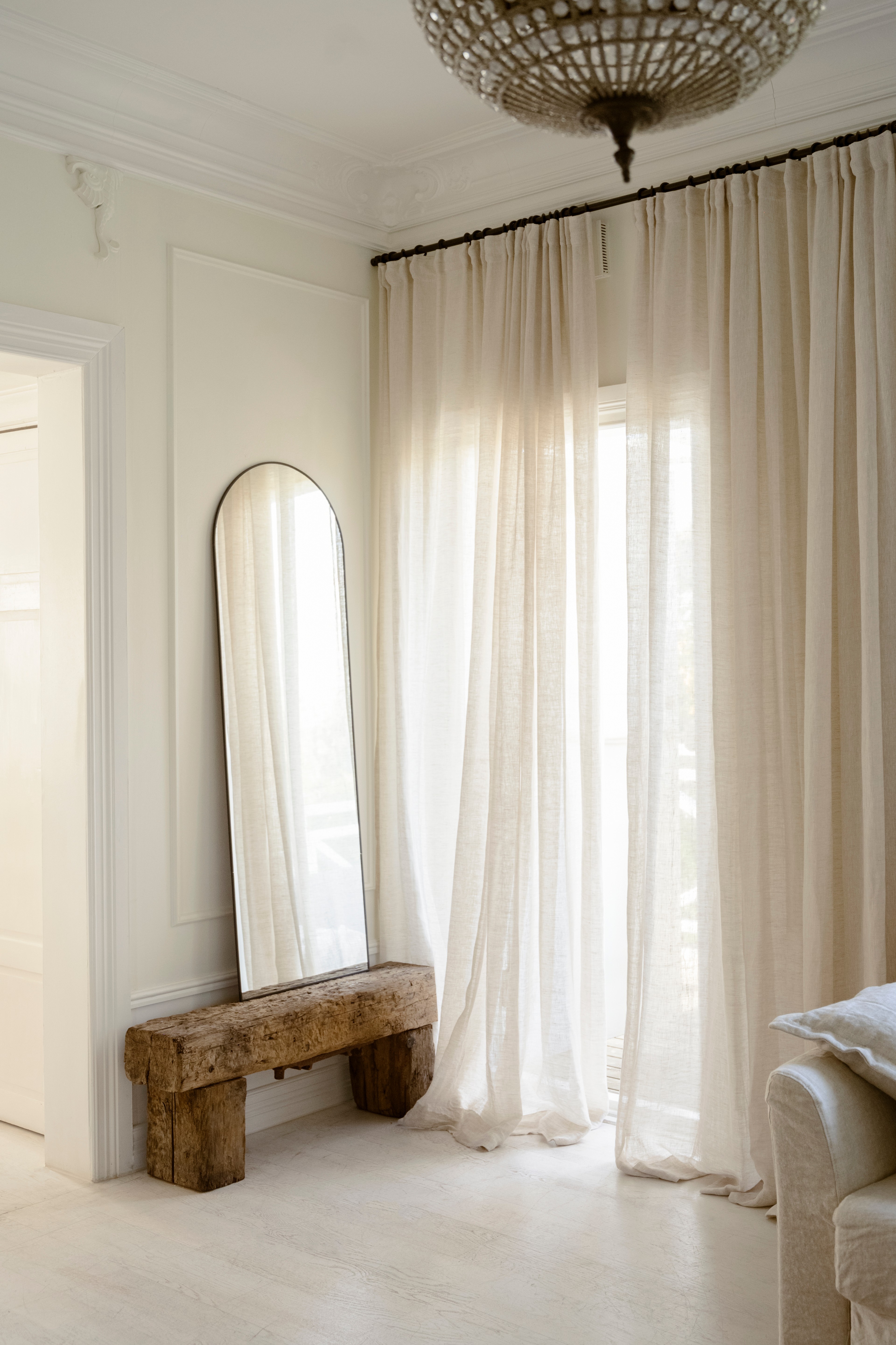 Vardagsrummet som ligger i anslutning till matsalen har, precis som matsalen, svarta gardinstänger. Ett enkelt knep för att knyta samman de två rummen. Här hänger tunna linnegardiner i sand, med ett ännu mer generöst släp (ca 5cm), och den sandfärgade tonen ger värme och bjuder in till samling. Det svarta i gardinstången har Lina plockat upp i andra inredningsdetaljer, vilket ger en elegant kontrast mot den naturliga känslan i textilierna.
