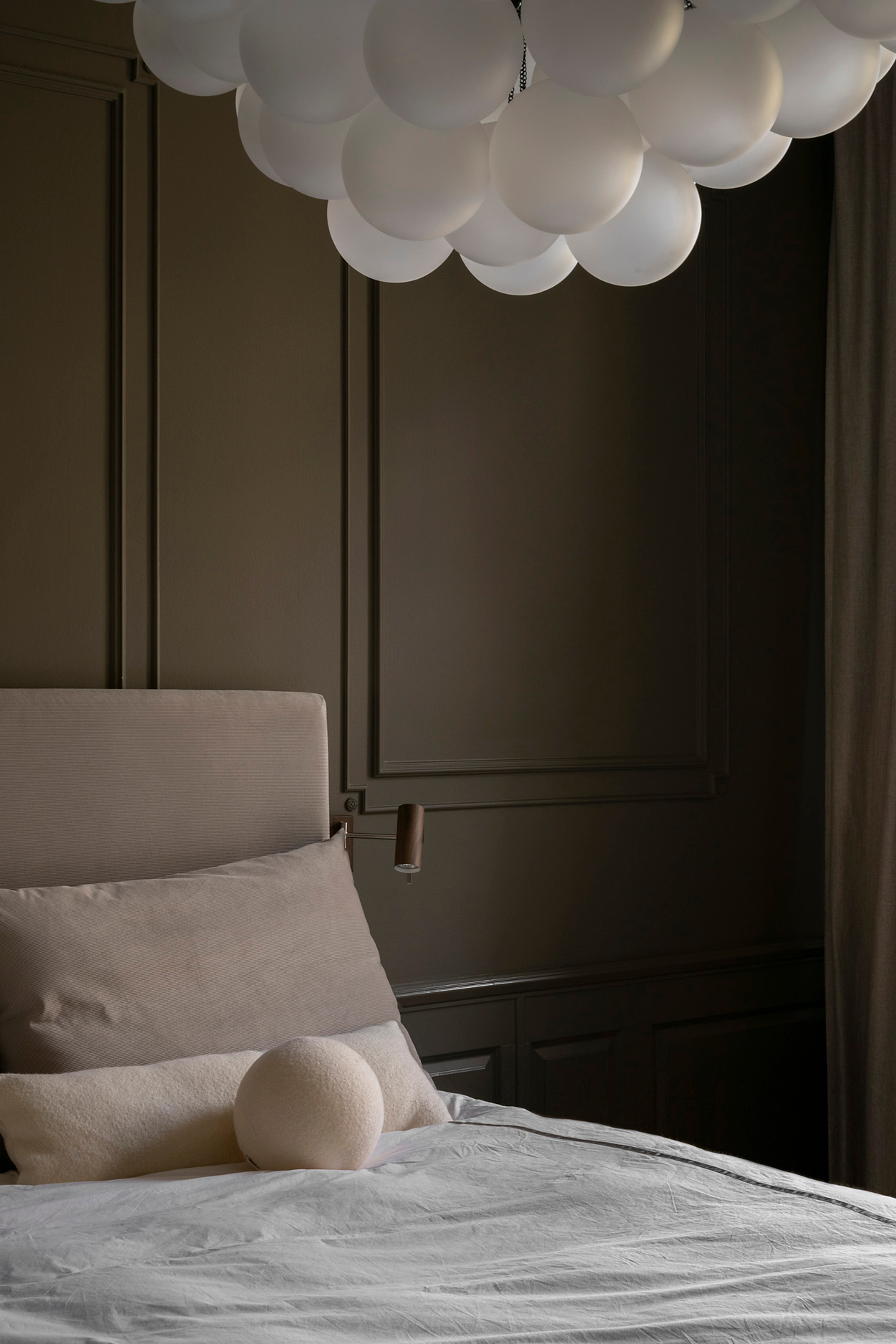Sovrummet är målat i en mörk nyans (Louise avslöjade att detta dock snart kommer att ändras!) och för att få till den optimala hotelldrömmen saknades bara en sak – mörkläggningsgardiner! För att knyta ihop sovrummet med vardagsrummet så har Louise valt mörkläggningsgardiner i samma tyg, vävd linne sand, men där ett mjukt foder sytts fast på baksidan.