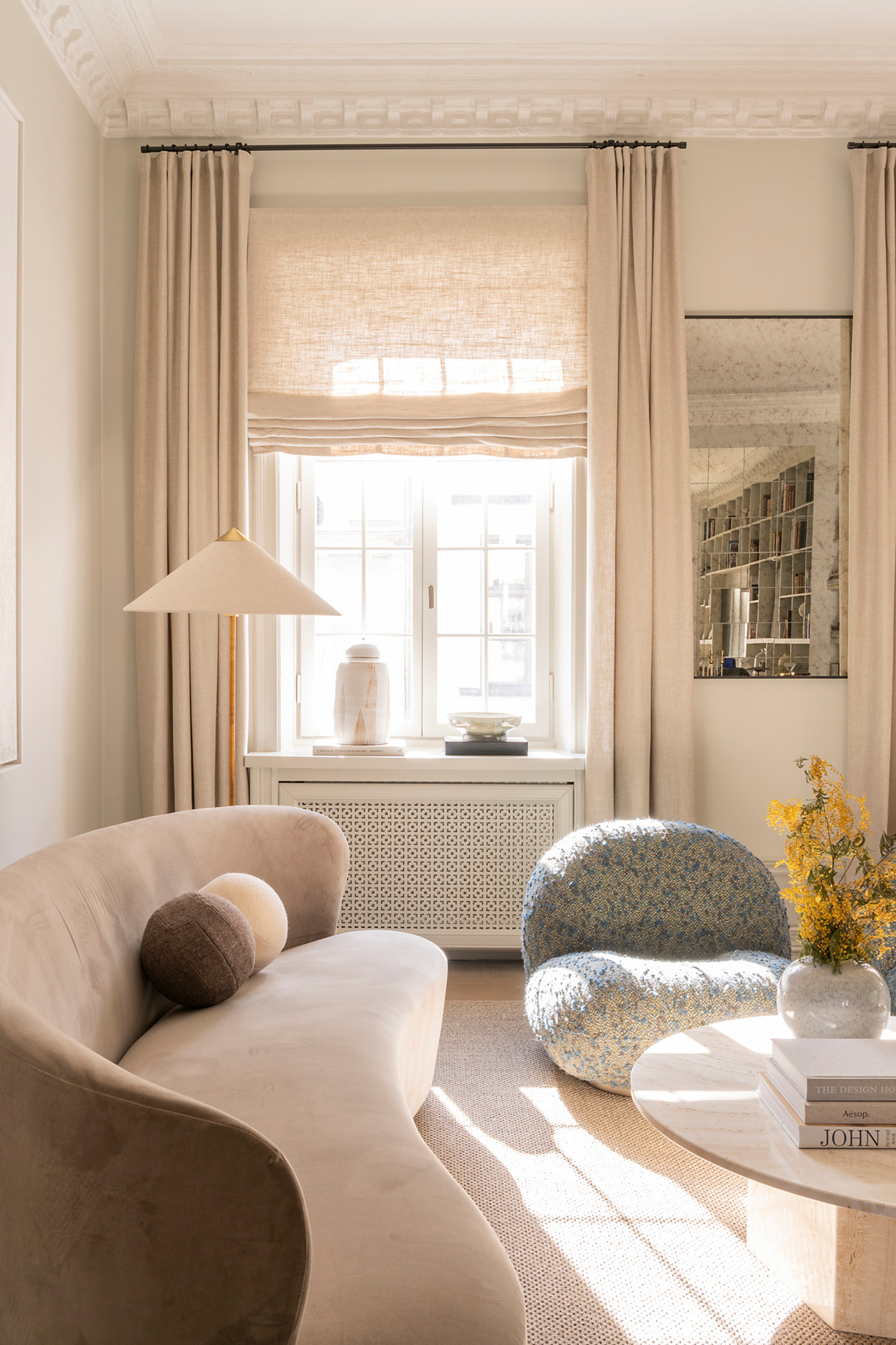 I det ljusa vardagsrummet så hänger hissgardiner i vävd linne, något som Louise valt att komplettera med långa längder i samma tyg. Hissgardiner är ett perfekt alternativ för fönster som inte lämpar sig för gardinlängder, men det är lätt att glömma att dessa även kan kombineras för en klassisk och väldigt ombonad look! Gardinstängerna hängs så högt upp mot taket som möjligt för att förstärka den ståtliga takhöjden, och hissgardinerna har placerats för att följa fönstrets ytterkarm i ovankant.
