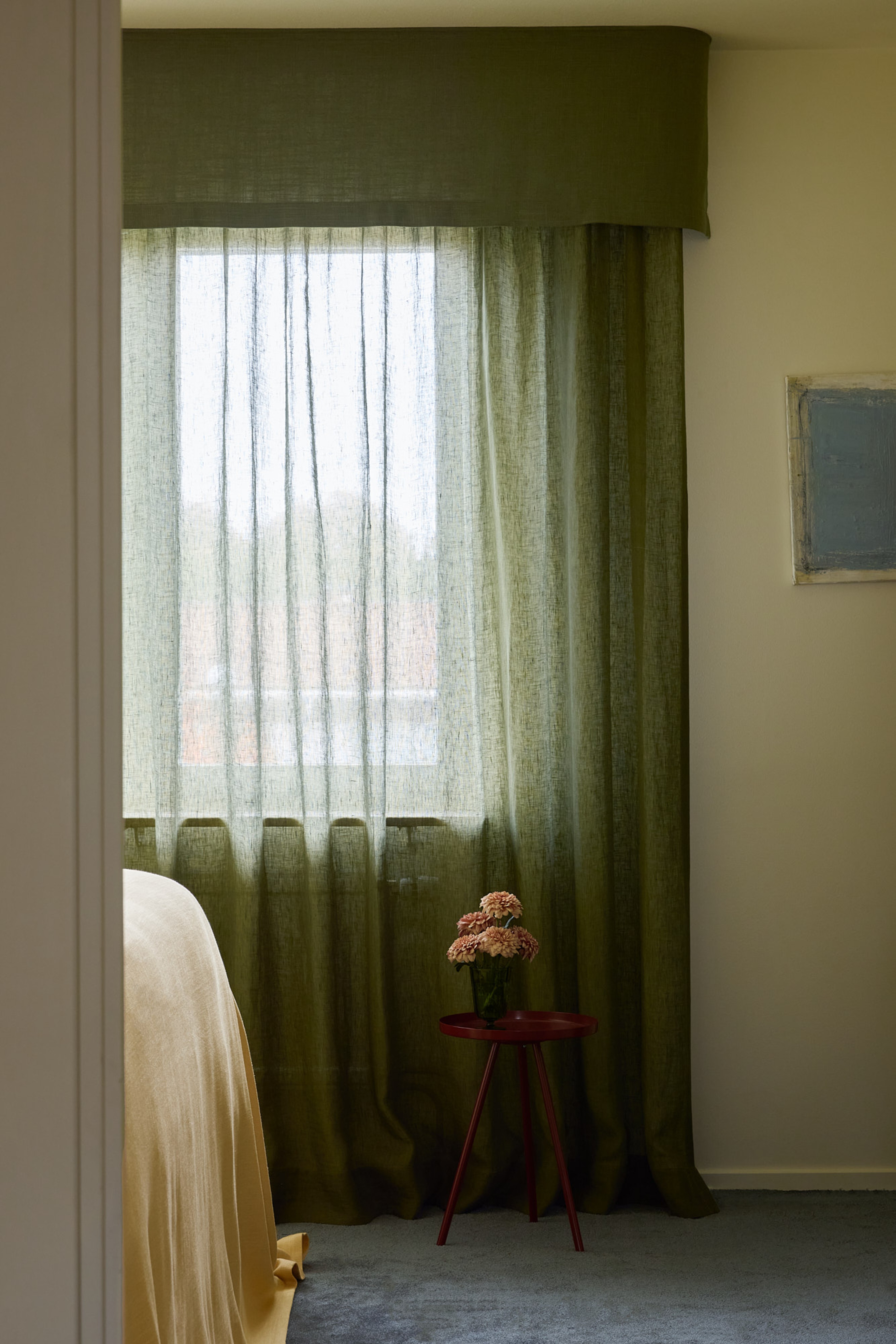 I master bedroom har en gardinkappa i vävd linne i khaki kombinerats med tunna linnegardiner i samma ton. Resultatet visar hur flera färger kan samspela utan att rummet tappar sin ro. De khakifärgade gardinerna möter en dovt blå heltäckningsmatta, ett bord i djup burgundy och ett överkast i havregult, vävt linne, en palett som tillsammans skapar en varm och harmonisk helhet.
