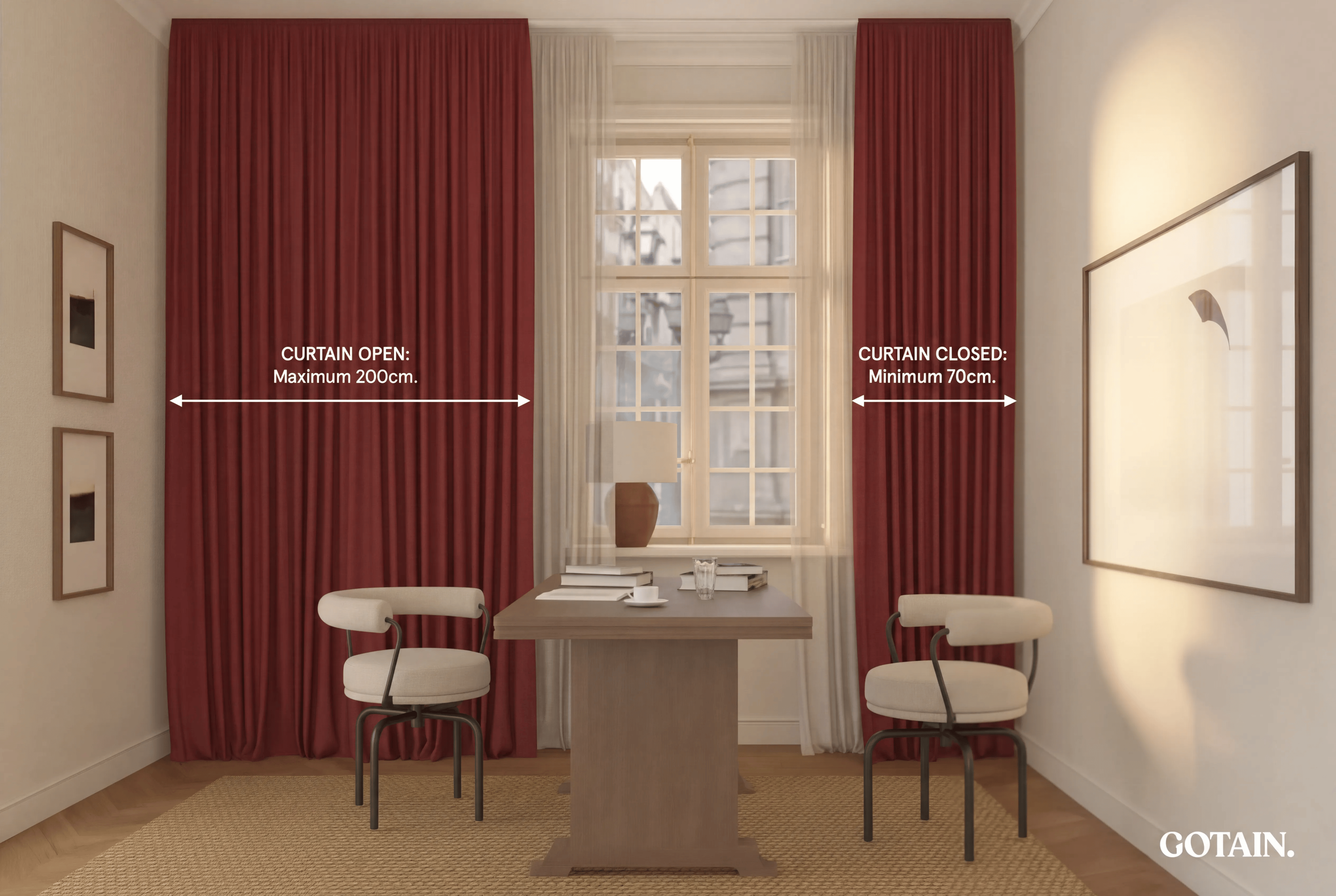 Dubbelbredd (ovan): En dubbelbredd gardin blir som mest 200cm bred (utdragen) och som minst 70cm (ihopdragen). Vi rekommenderar att låta dem täcka en bredd av ca 140-160cm för finast gardinvågor.