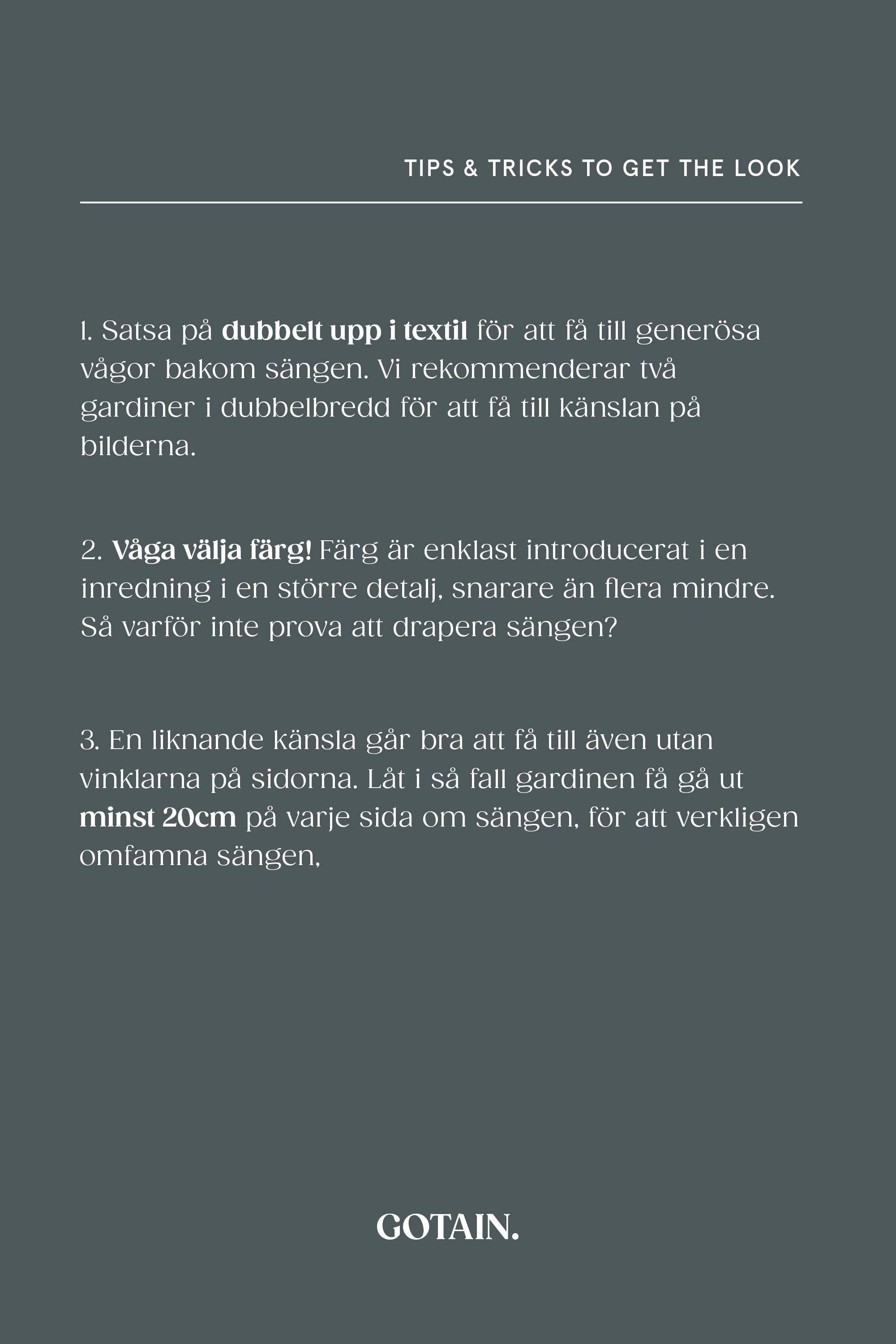 Elegant är en diskret och modern look som med sitt tidlösa uttryck kan anpassas till en mängd sovrumsstilar beroende på val av gardin och färg. De vinklade hörnen klär in sängen och förstärker dess position i rummet, utan att ta upp extra utrymme. Denna look skapar en lugn och sofistikerad atmosfär som sömlöst smälter in med din befintliga inredning.