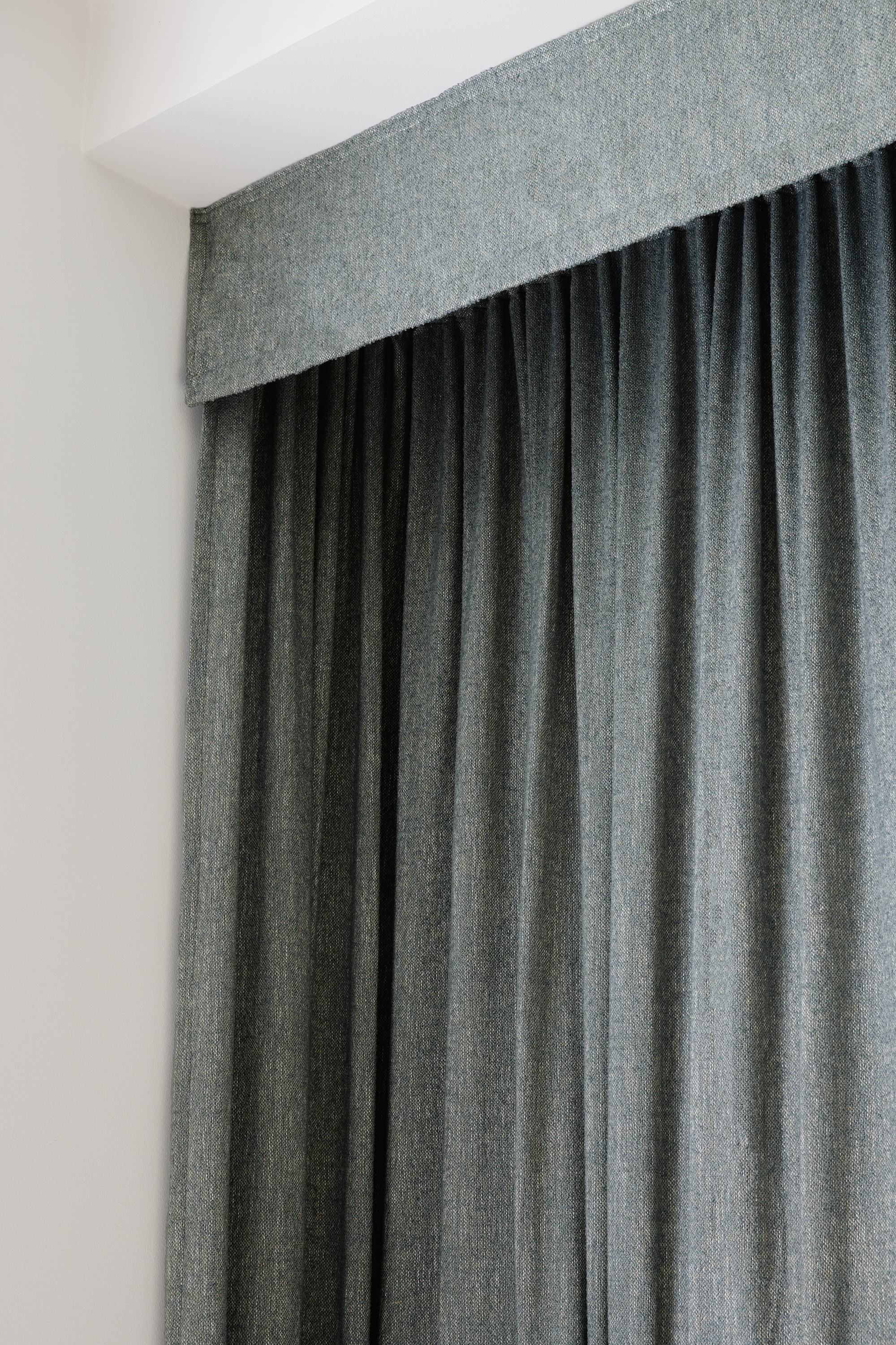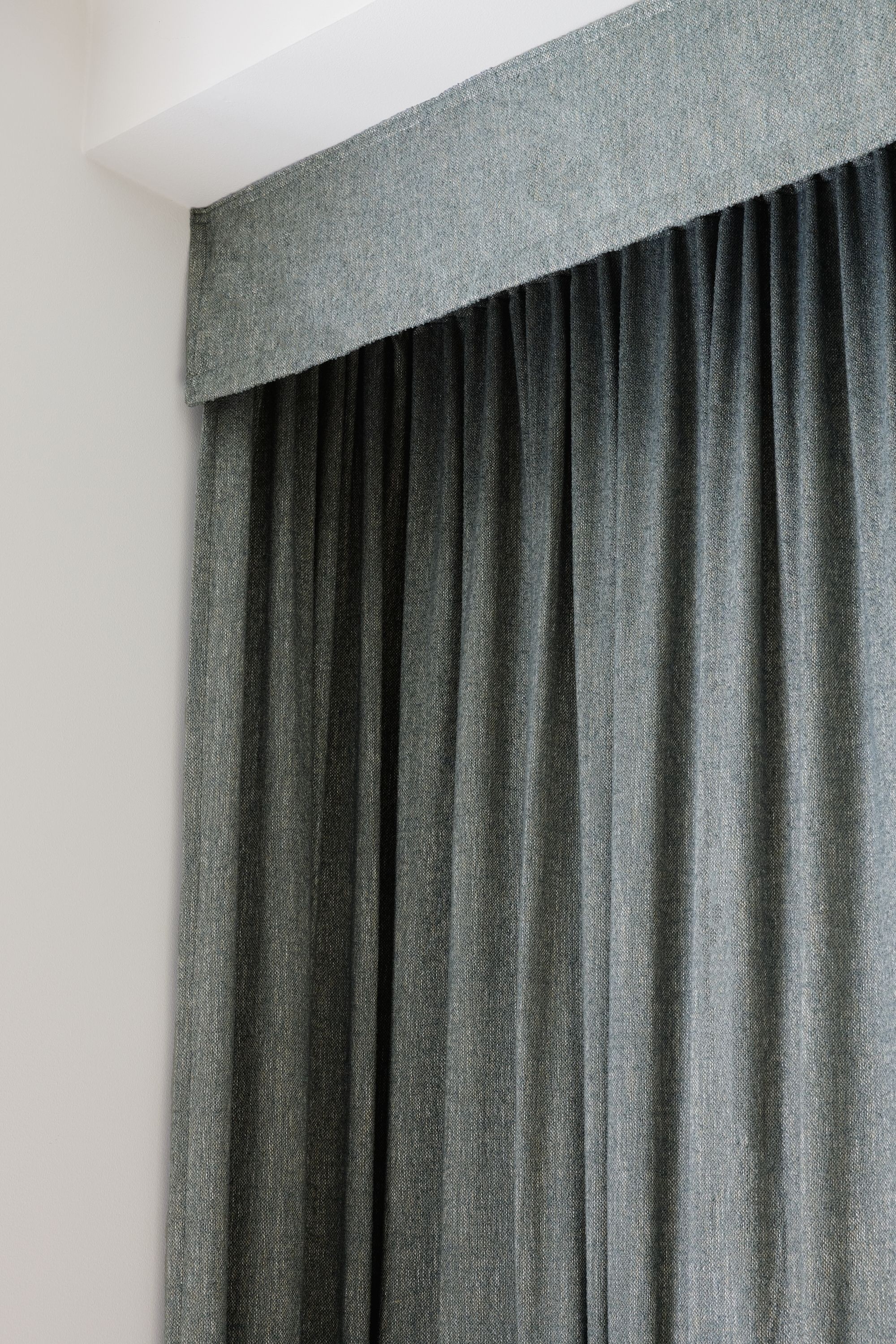 Framför skenan så monteras en rak gardinkappa i samma tyg (gardinkappan säljs i ett komplett kit med kappa och skena), som placeras 10cm från den inre skenan.