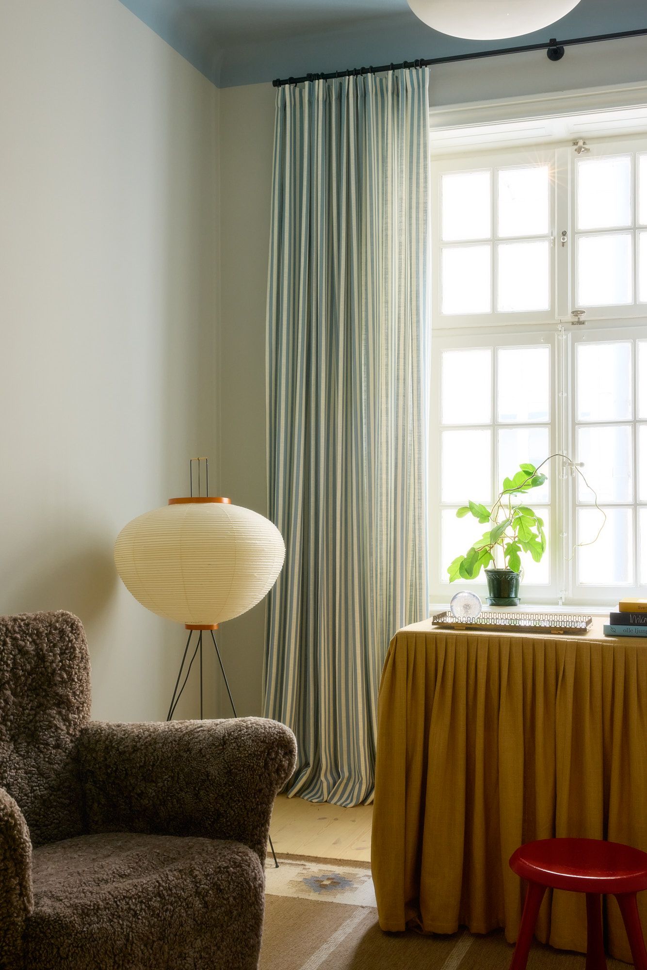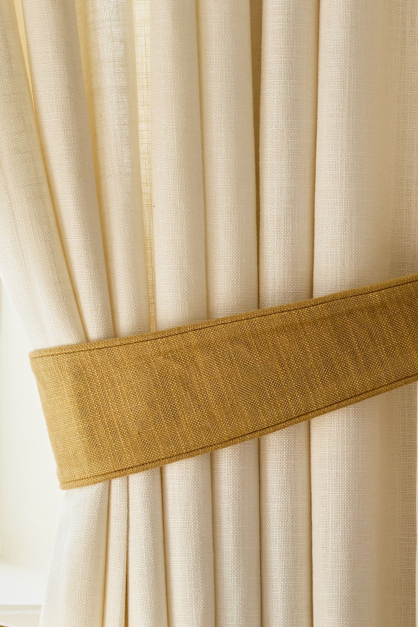 A curtain tieback updates the look easily without changing the textile. Drawing the fabric aside allows more light in while defining the proportions of the window.