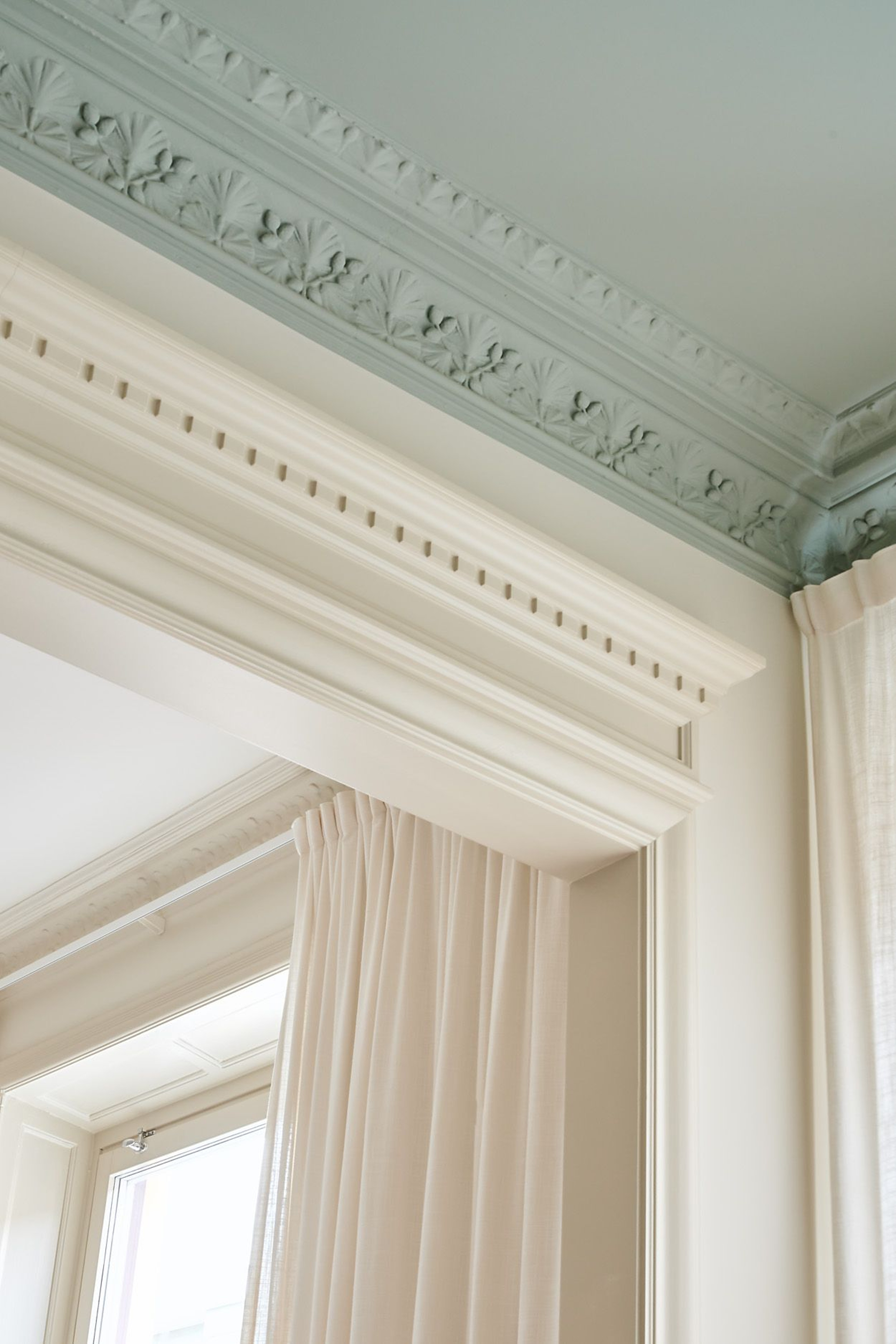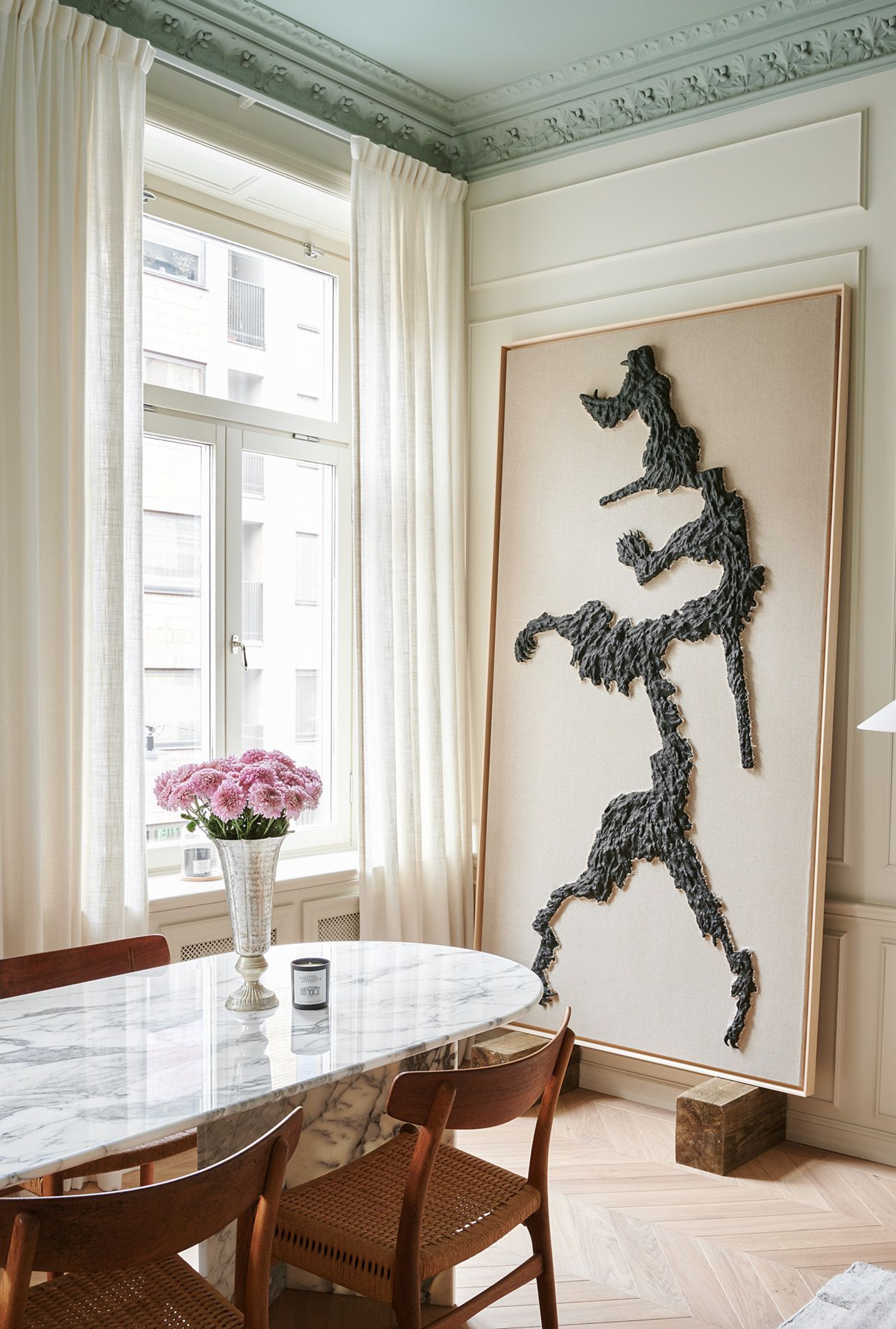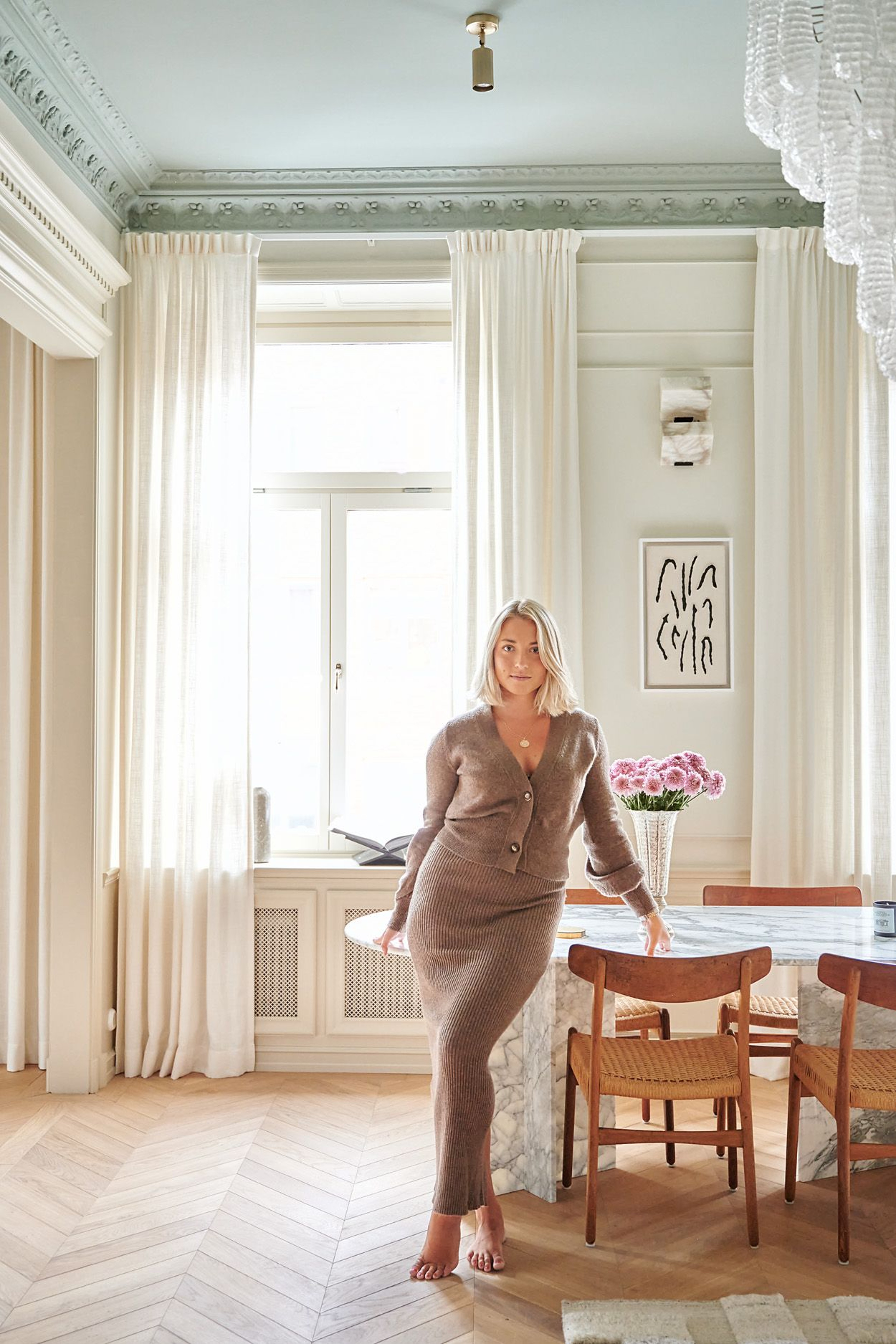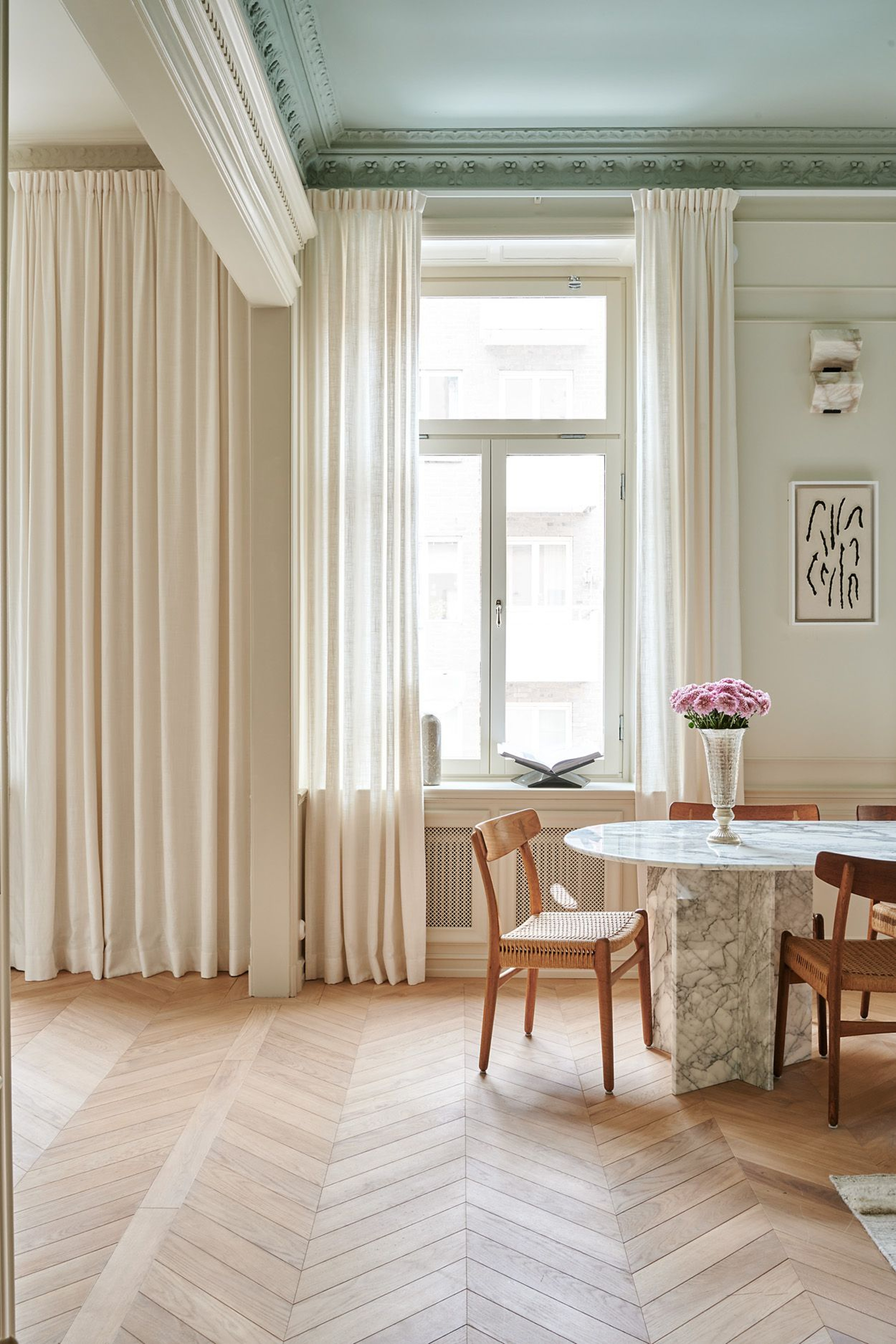 Elin works as a blogger and influencer, but also runs Elin Skoglund Interior where she helps private customers with everything from interior design to renovations, and we understand why! To connect the interior of the three areas into a large, social area, Elin has consistently chosen Gotain's woven linen curtains in off-white in both the kitchen, dining area and living room. Because of the fantastic decorations in the ceiling, the curtains hang on a wall-mounted rail, with extra long brackets to hang freely off the deep window sills in turn-of-the-century style.