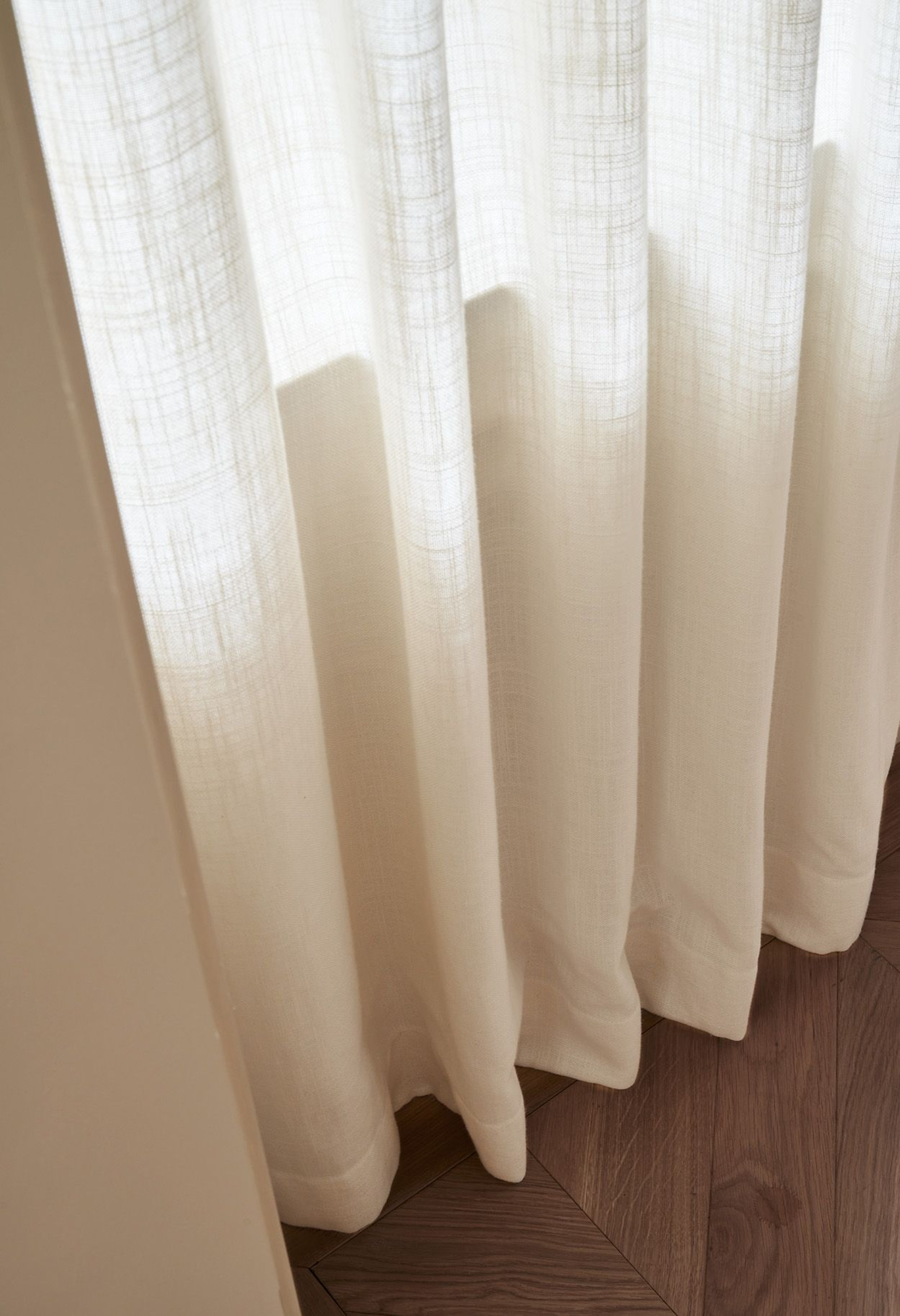 Elin has experimented with widths and heights to find a curtain solution that is compatible to her particular conditions, and we think the end result is absolutely fantastic! In the dining area, a total of four single width curtains hang in off-white woven linen, to embrace the windows without draping too much on the wall. Although this is currently the favorite look, she has chosen to place the wall-mounted curtain rail from wall to wall, to have the opportunity to be flexible in the curtain distribution, and the curtains can thus be moved along the entire width of the wall.