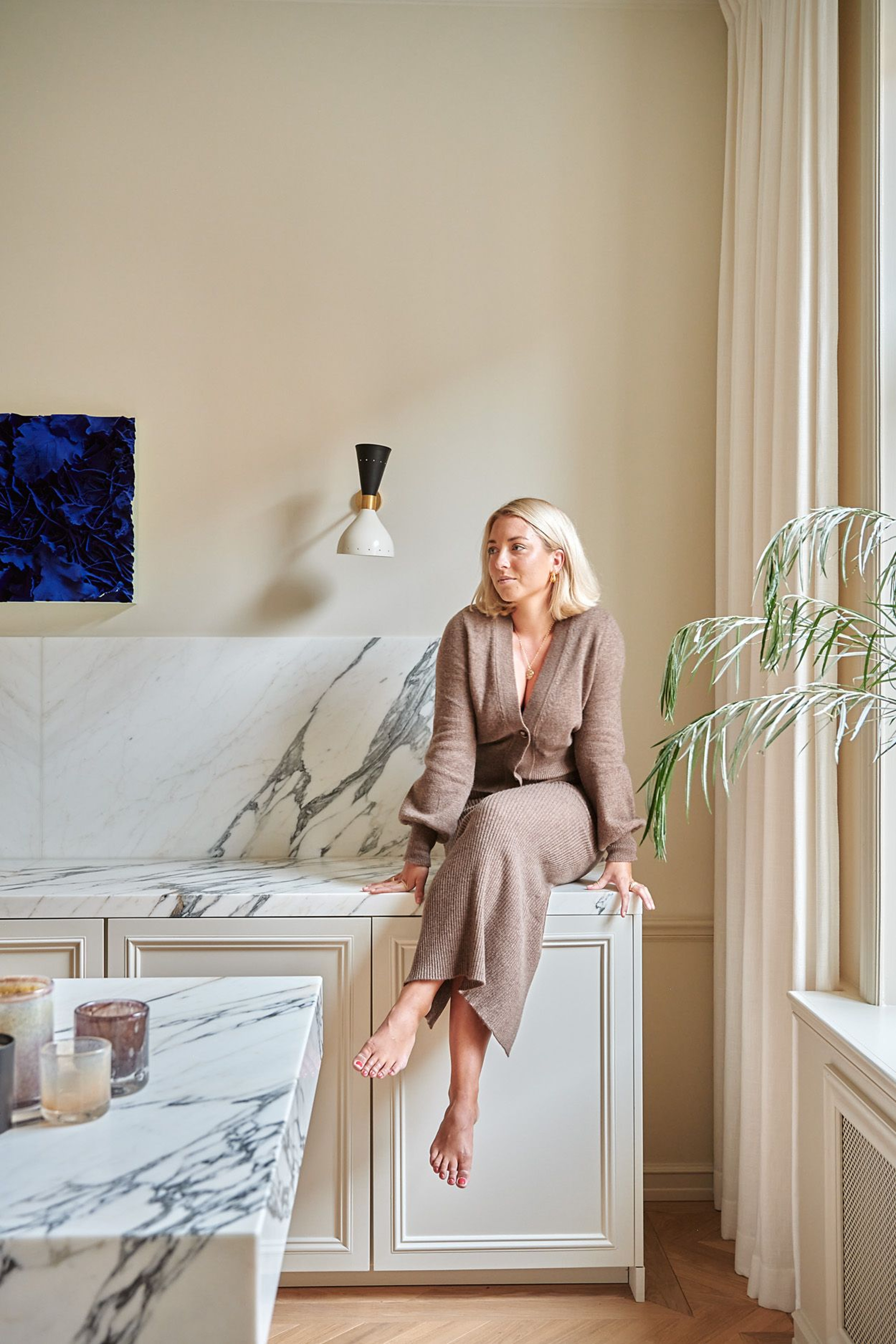 Elin and her partner have done a complete renovation of the apartment, with color and choice of materials that make us feel that we could just as easily have been in an apartment in Paris. The floor is beautiful a Chevron pattern and the ceilings are painted in a deep blue-green shade, with the kitchen's prominent marble island as a diamond in the middle of the apartment.