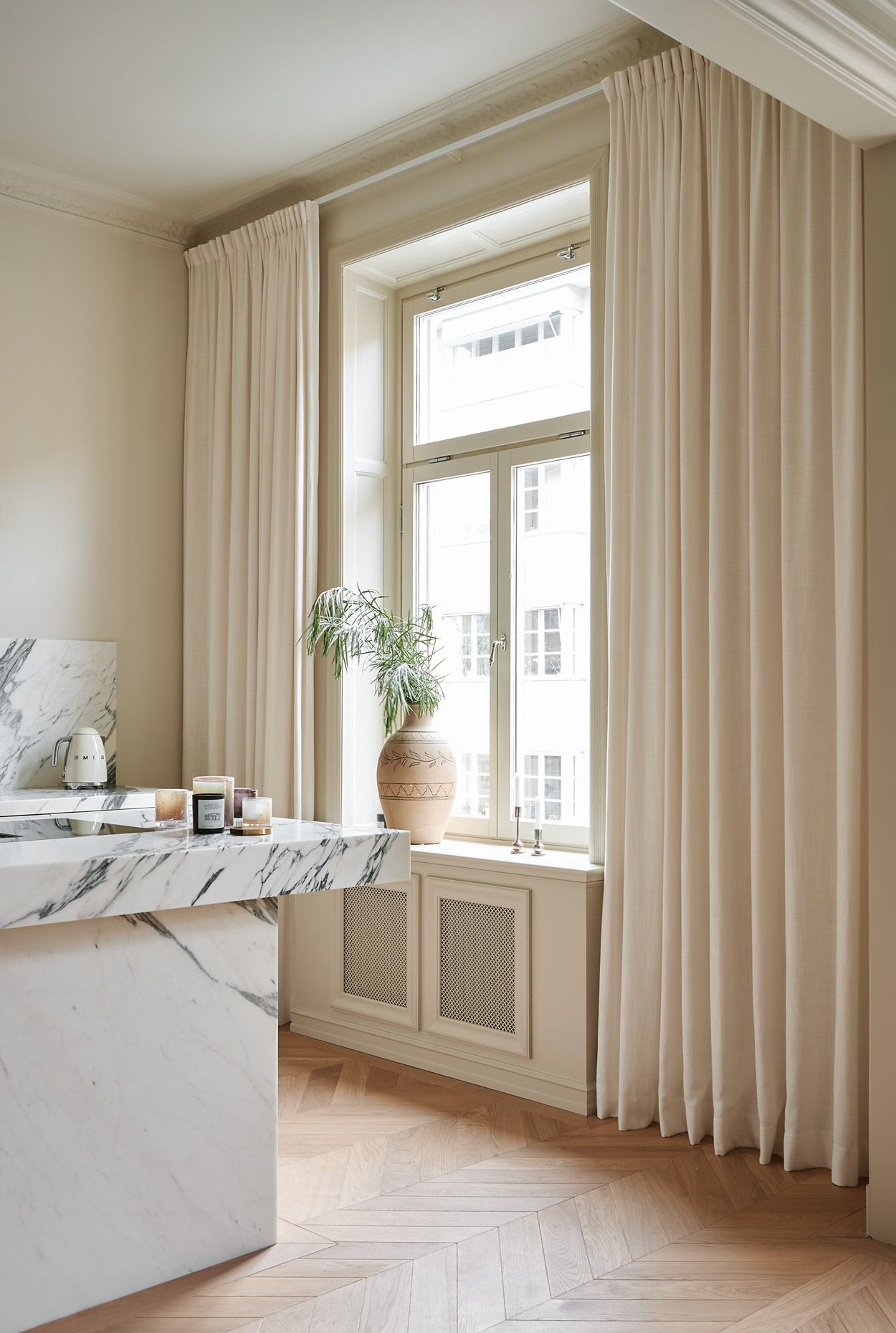 In the harmonious bedroom, curtains have been planned already during the renovation, which has made it possible to hide the curtain rails behind the stucco in the ceiling. For the pro, this is a concept called a cornice, and means that the stucco at the window has been deliberately placed further out in the room, to create a gap where two ceiling-mounted curtain rails are placed parallell to each other. Here hang two layers to get the feeling of a real hotel look, with a sheer and a blackout layer. Closest to the window we find Gotain's thin linen curtains in Sand, and out towards the room Gotain's darkening velvet curtain in the color beige set the tone. The curtains complement each other, and make it easy to switch between a darkening effect and only having a sheer layer for privacy.