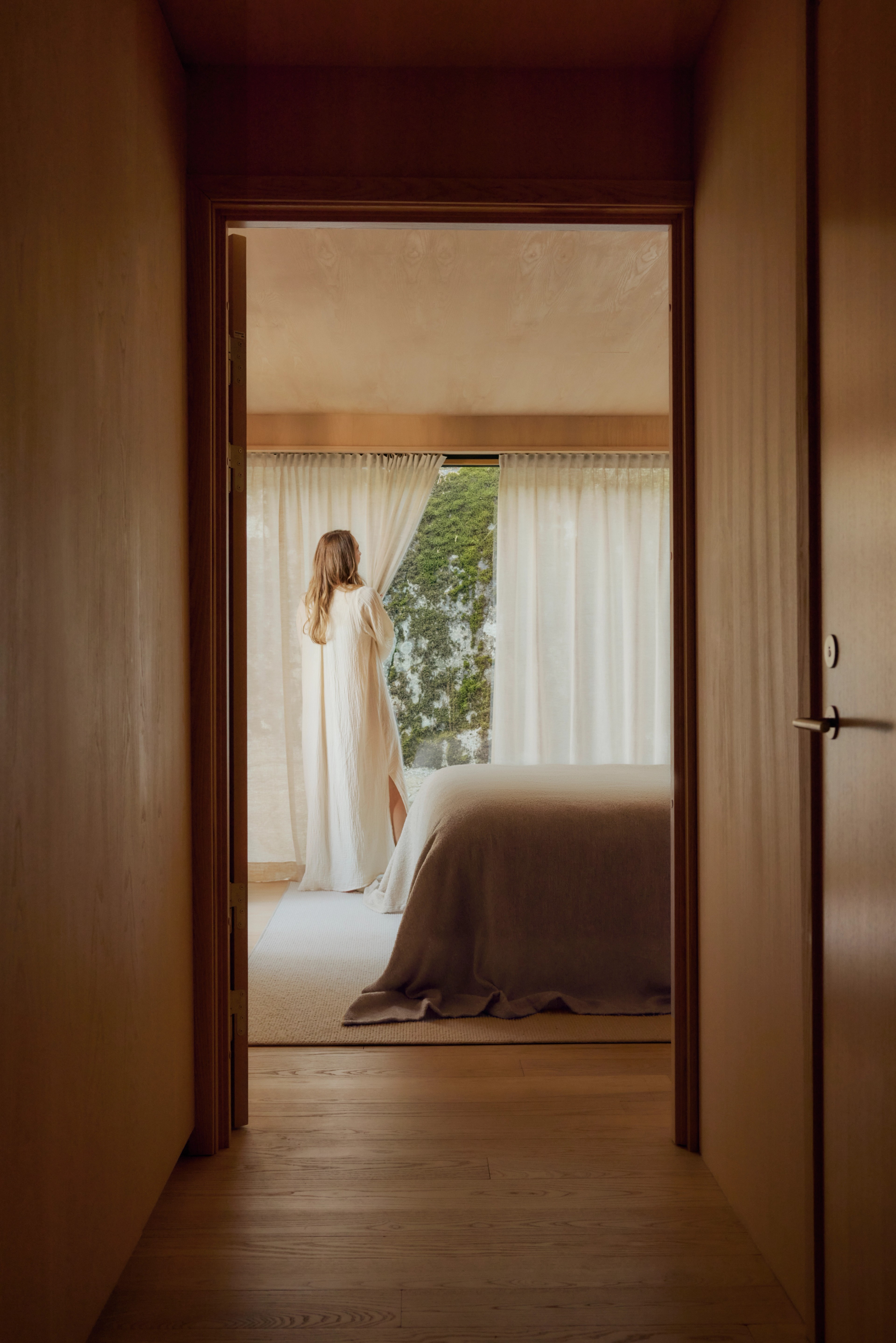 At the end of an oak-clad hallway on the upper floor are the bedrooms. Here, a large window covers an entire wall, functioning almost like a living forest painting to fall asleep and wake up to. The sheer linen fabric acts like a soft curtain against the stone behind it. In the bedroom, the sheer linen curtain is paired with a woven linen bedthrow in the same natural tone.