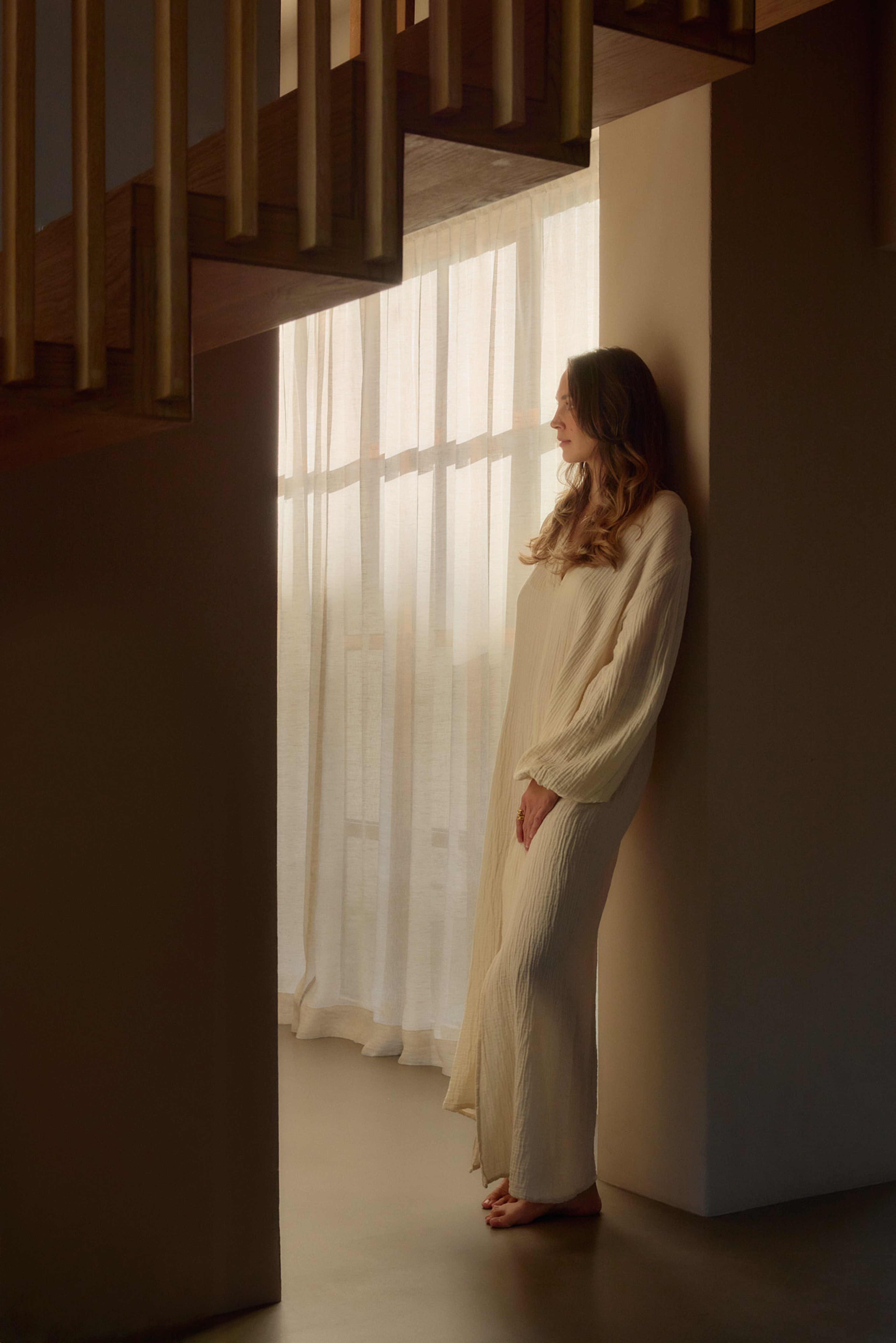 Throughout the home, Sheer linen curtains in the color Sand appear in the kitchen, living room, and bedrooms. Amanda explains that she had long had a clear vision of how she wanted the home to feel – almost like a cinematic scene, with doors and windows open and curtains gently floating in the air. The sheer linen curtains therefore became a natural choice. They also pair beautifully with the other natural materials throughout the home.