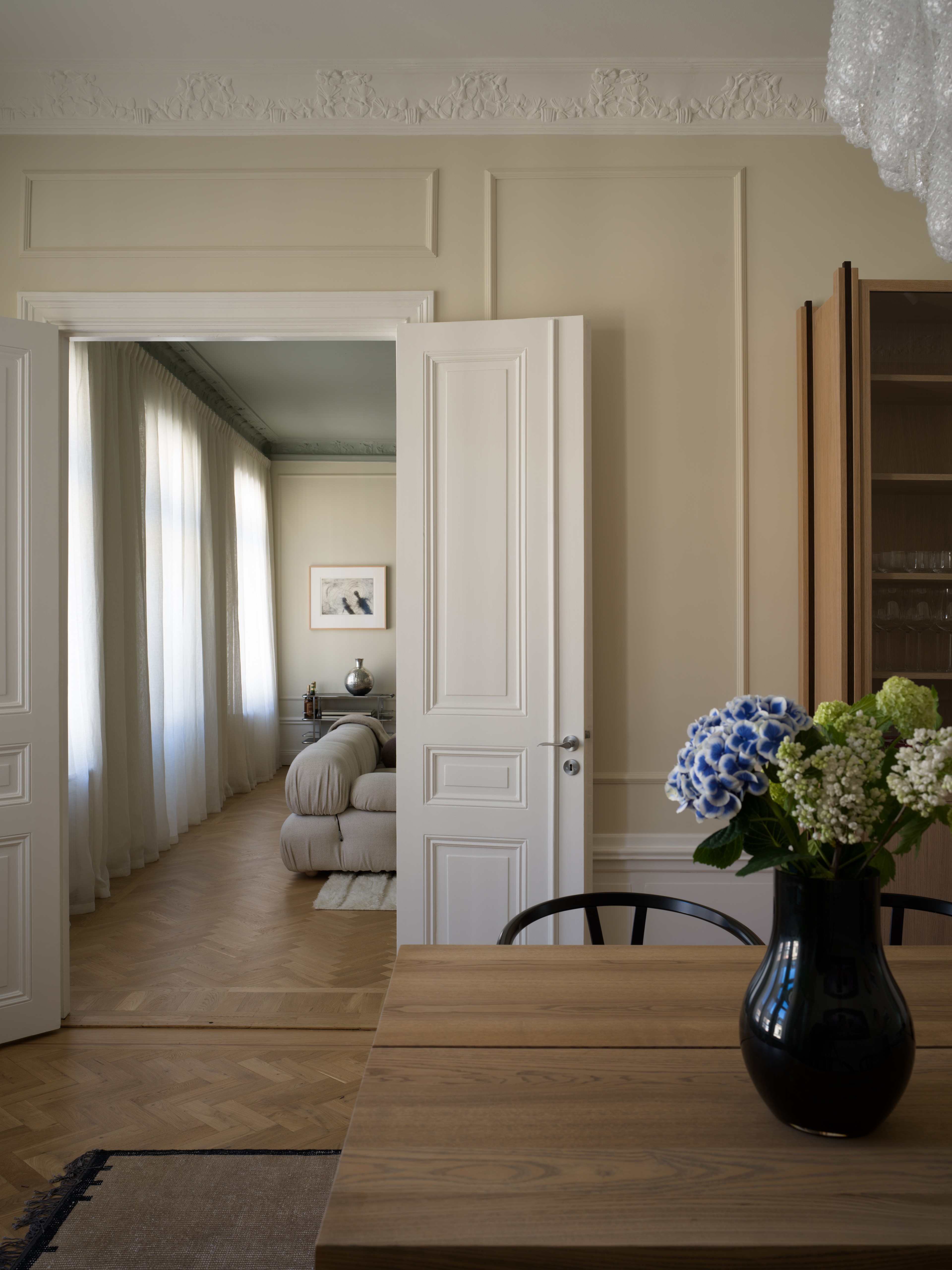 In the dining room, that is connect with the living room by a pair of grand turn of the century doors, thin linen curtains in white drape the windows. The thin linen curtains in particular are a perfect option to get the best of both worlds - both filter the strongest sun rays without compromising on light, and in creating a warm and inviting textile feeling.