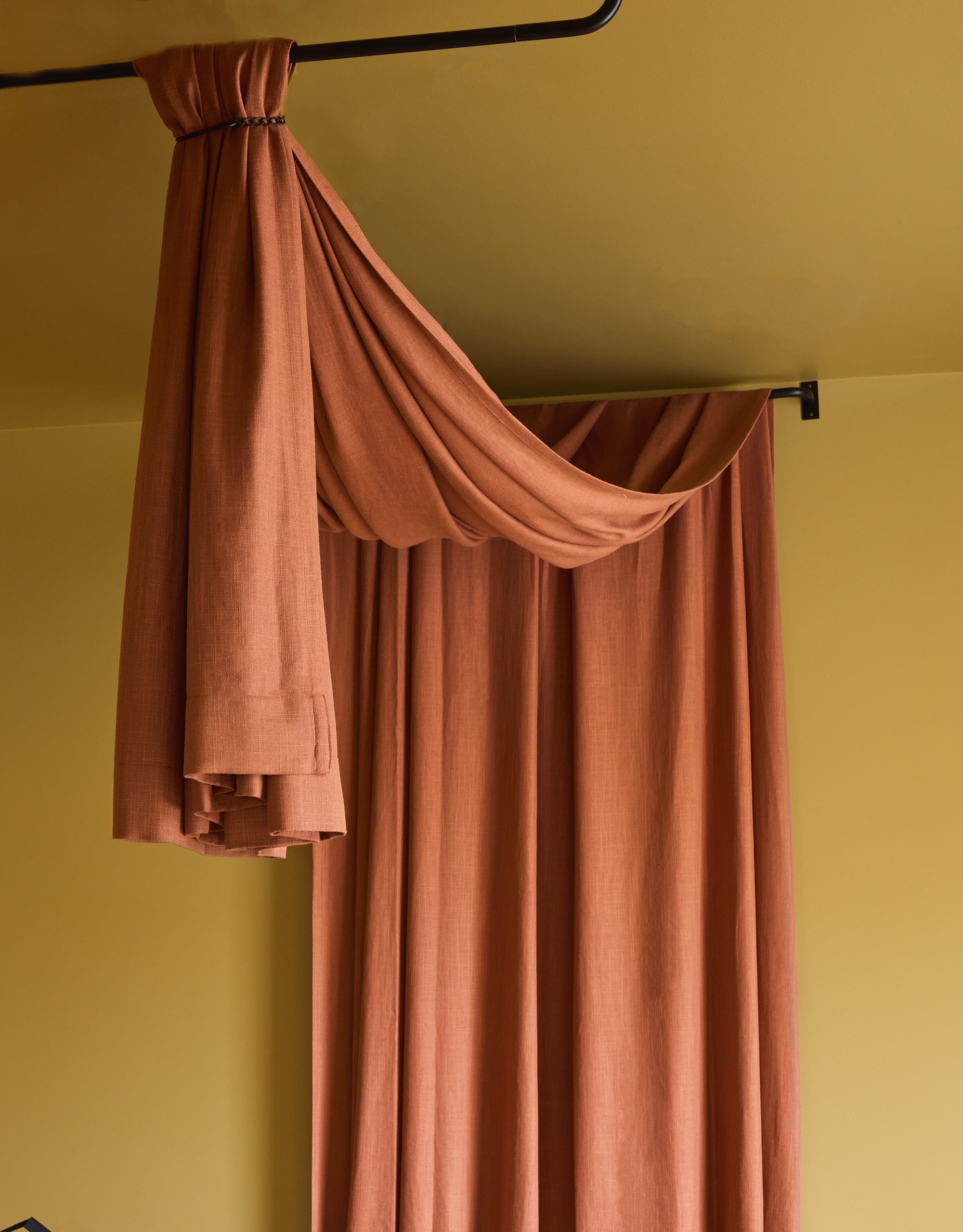 In this room, a woven linen curtain in double width hangs from a black curtain rod that has been cut into two parts and finished with French rod ends.