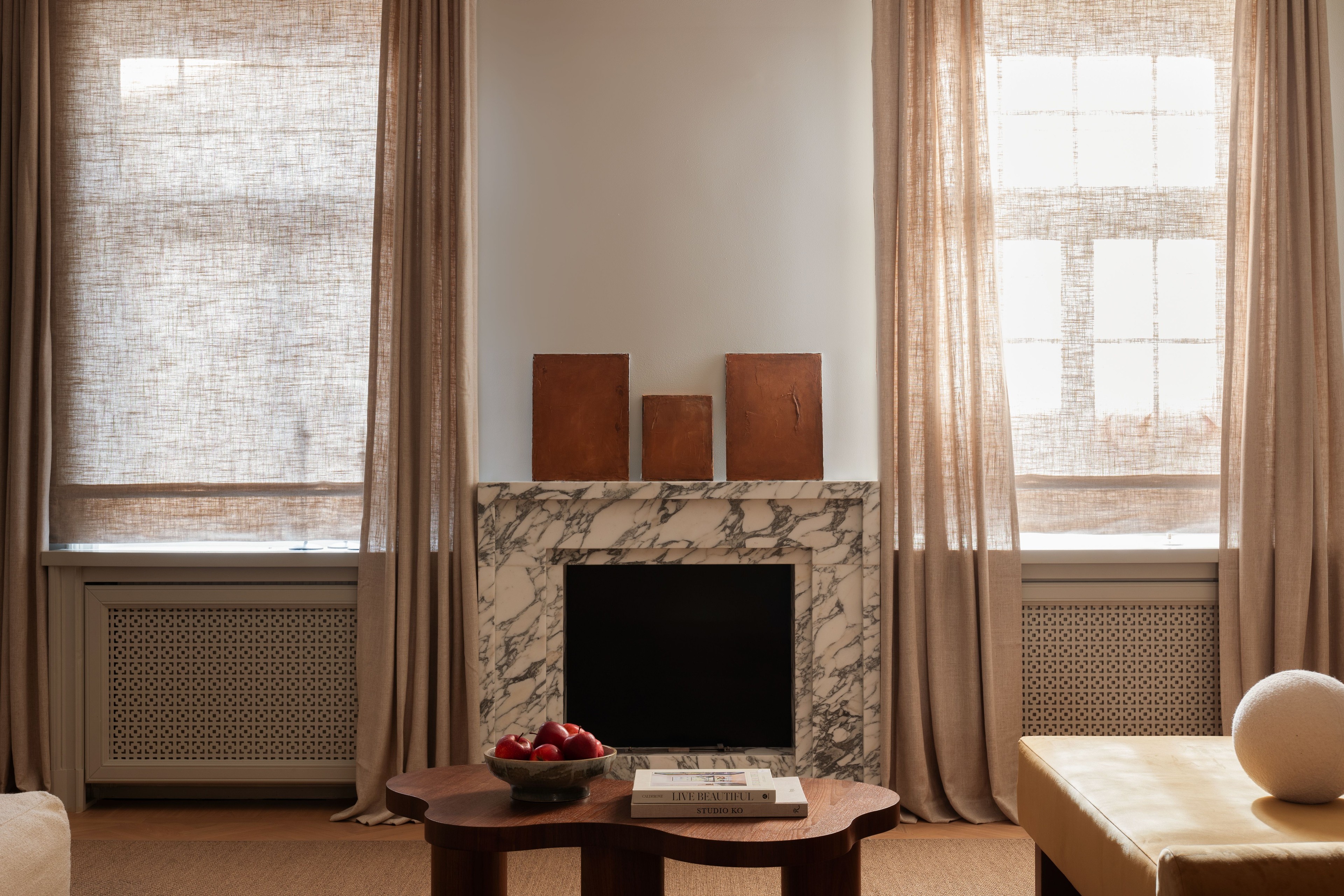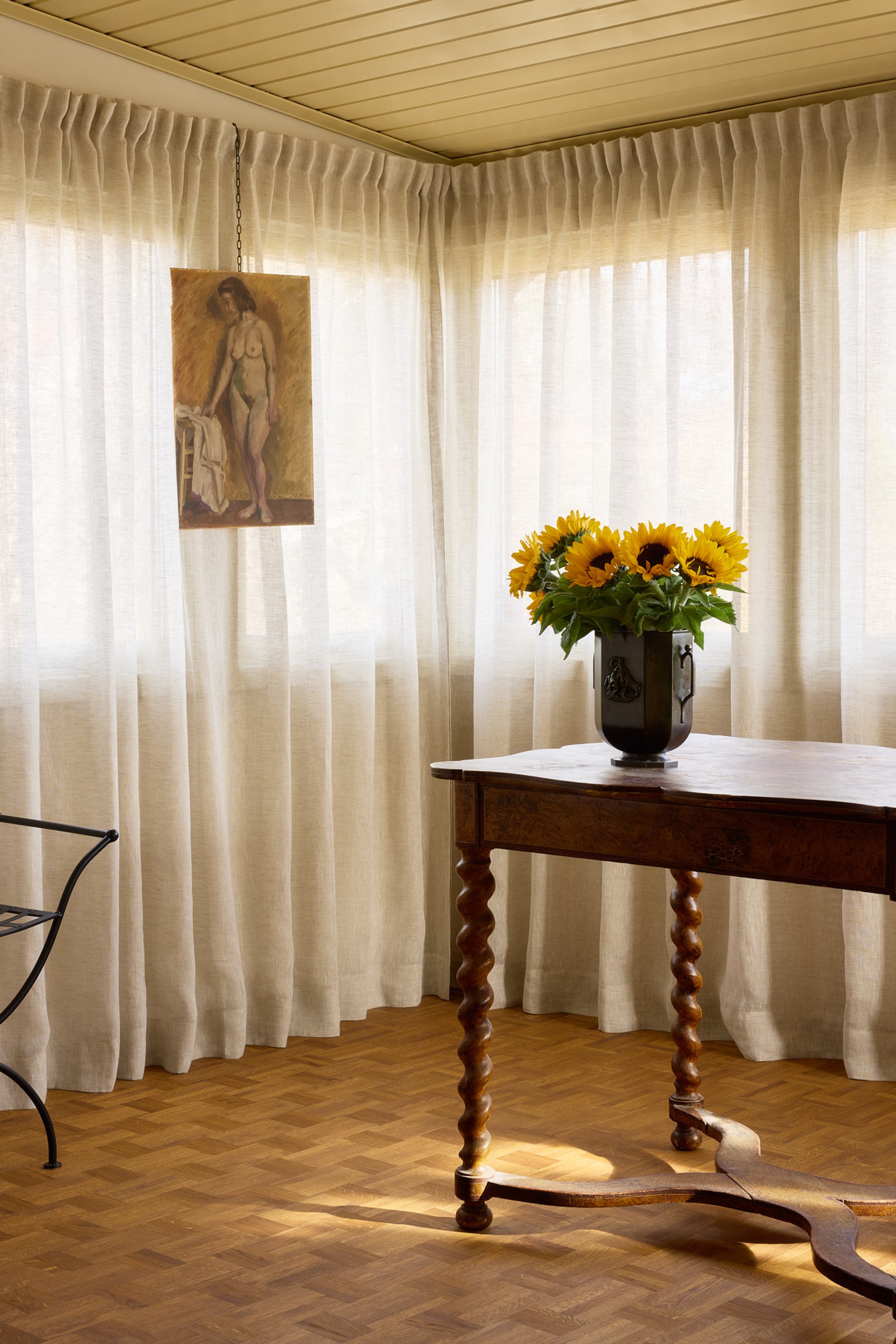 Sheer curtains on a track, hung from wall to wall, are a solution that transition seamlessly from summer into autumn. For a cozy atmosphere, draw the curtains and let them become part of the interior. Try, for instance, hanging a painting on fishing line in front of the curtains for a playful and personal detail.