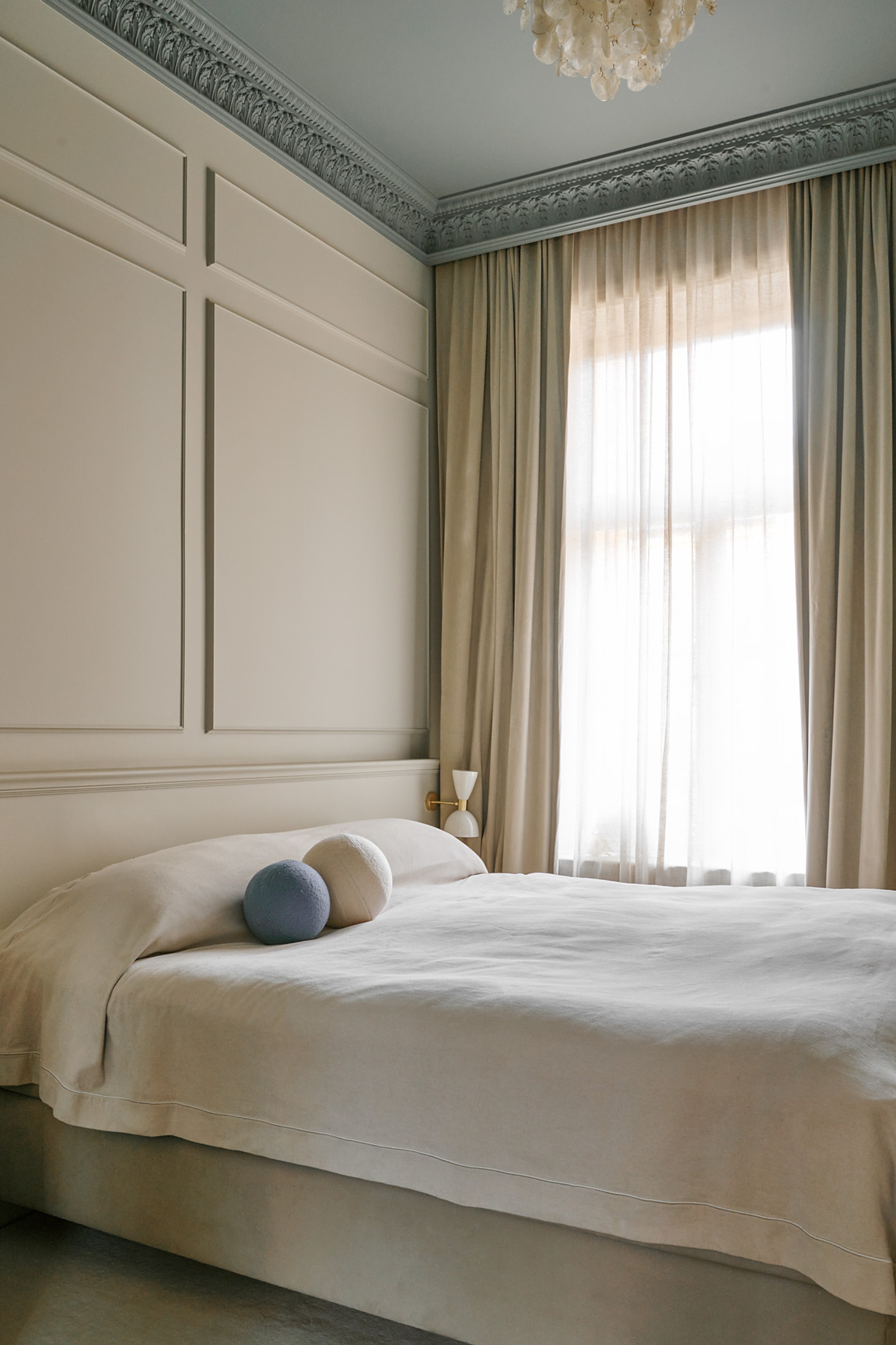 In the harmonious bedroom, curtains have been planned already during the renovation, which has made it possible to hide the curtain rails behind the stucco in the ceiling. For the pro, this is a concept called a cornice, and means that the stucco at the window has been deliberately placed further out in the room, to create a gap where two ceiling-mounted curtain rails are placed parallell to each other. Here hang two layers to get the feeling of a real hotel look, with a sheer and a blackout layer. Closest to the window we find Gotain's thin linen curtains in Sand, and out towards the room Gotain's darkening velvet curtain in the color beige set the tone. The curtains complement each other, and make it easy to switch between a darkening effect and only having a sheer layer for privacy.