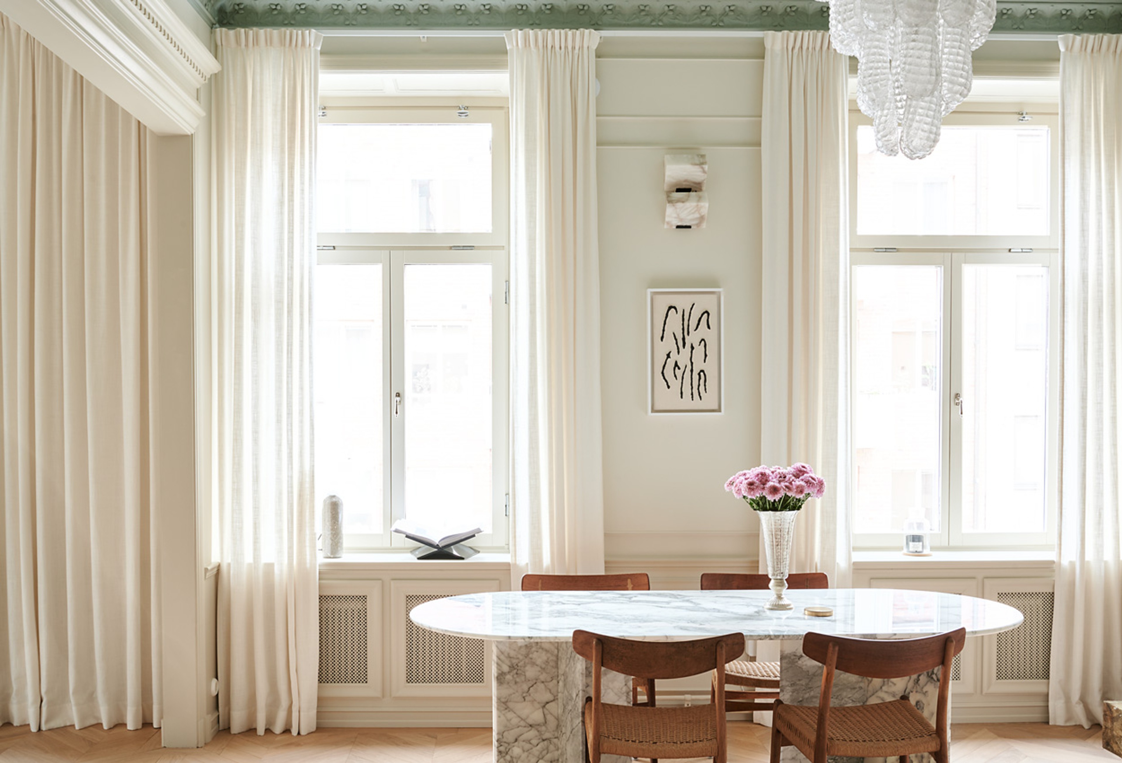 Elin works as a blogger and influencer, but also runs Elin Skoglund Interior where she helps private customers with everything from interior design to renovations, and we understand why! To connect the interior of the three areas into a large, social area, Elin has consistently chosen Gotain's woven linen curtains in off-white in both the kitchen, dining area and living room. Because of the fantastic decorations in the ceiling, the curtains hang on a wall-mounted rail, with extra long brackets to hang freely off the deep window sills in turn-of-the-century style.