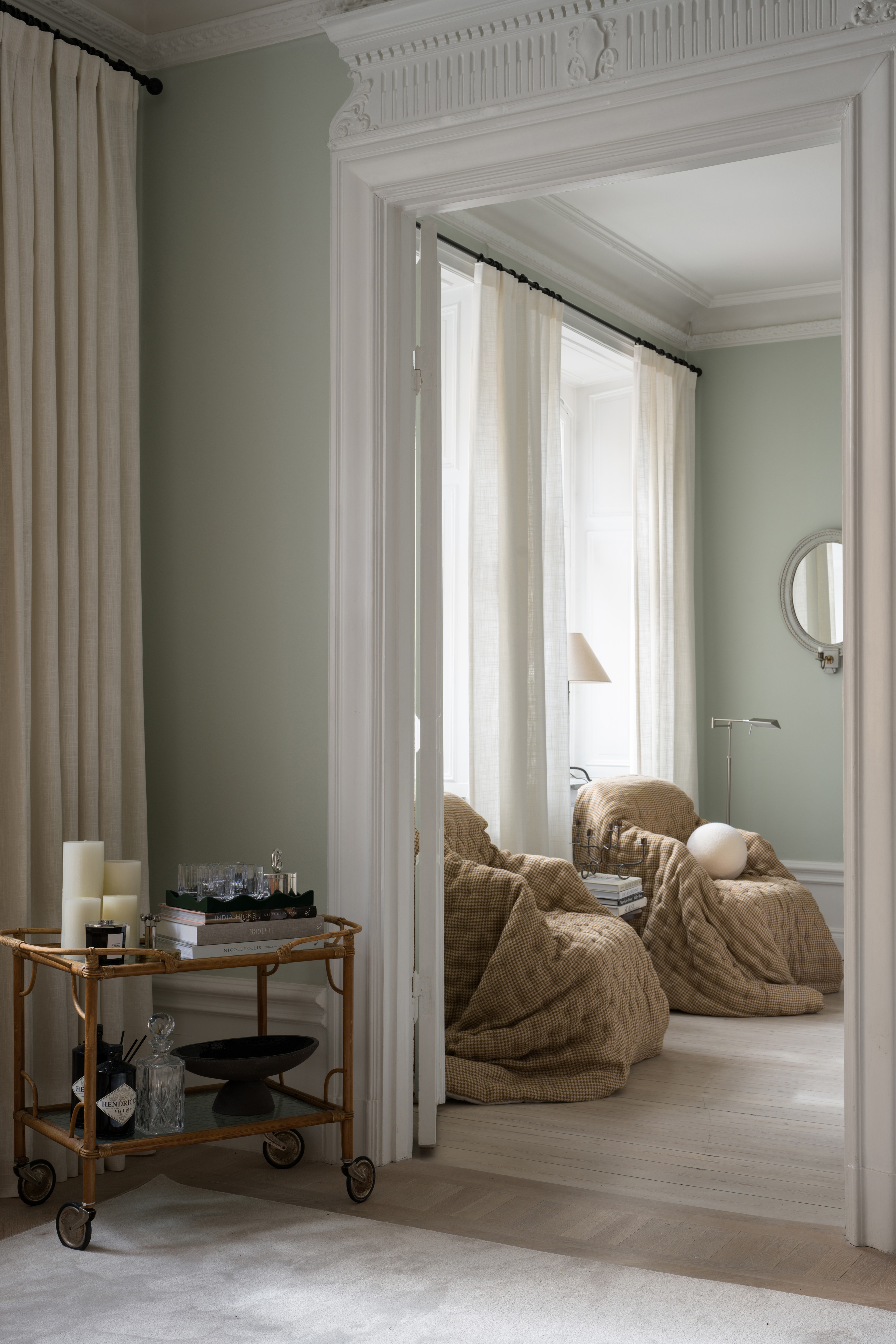When Filippa flies throught the door she tells us that the apartment was her parents to begin with, and that parts of the decor are still kept in their style. The soft turquoise green wall color which is a constant throughout the home and the armchairs to name a few examples. And this is how we experience the decor that made us fall head over heals, the distinct mix of new and old, antique and modern. To connect the two worlds Filippa has made the choice of curtains her theme throughout the home, with woven linen curtains in ivory draped from a black rod. A favorite combination if you ask us!