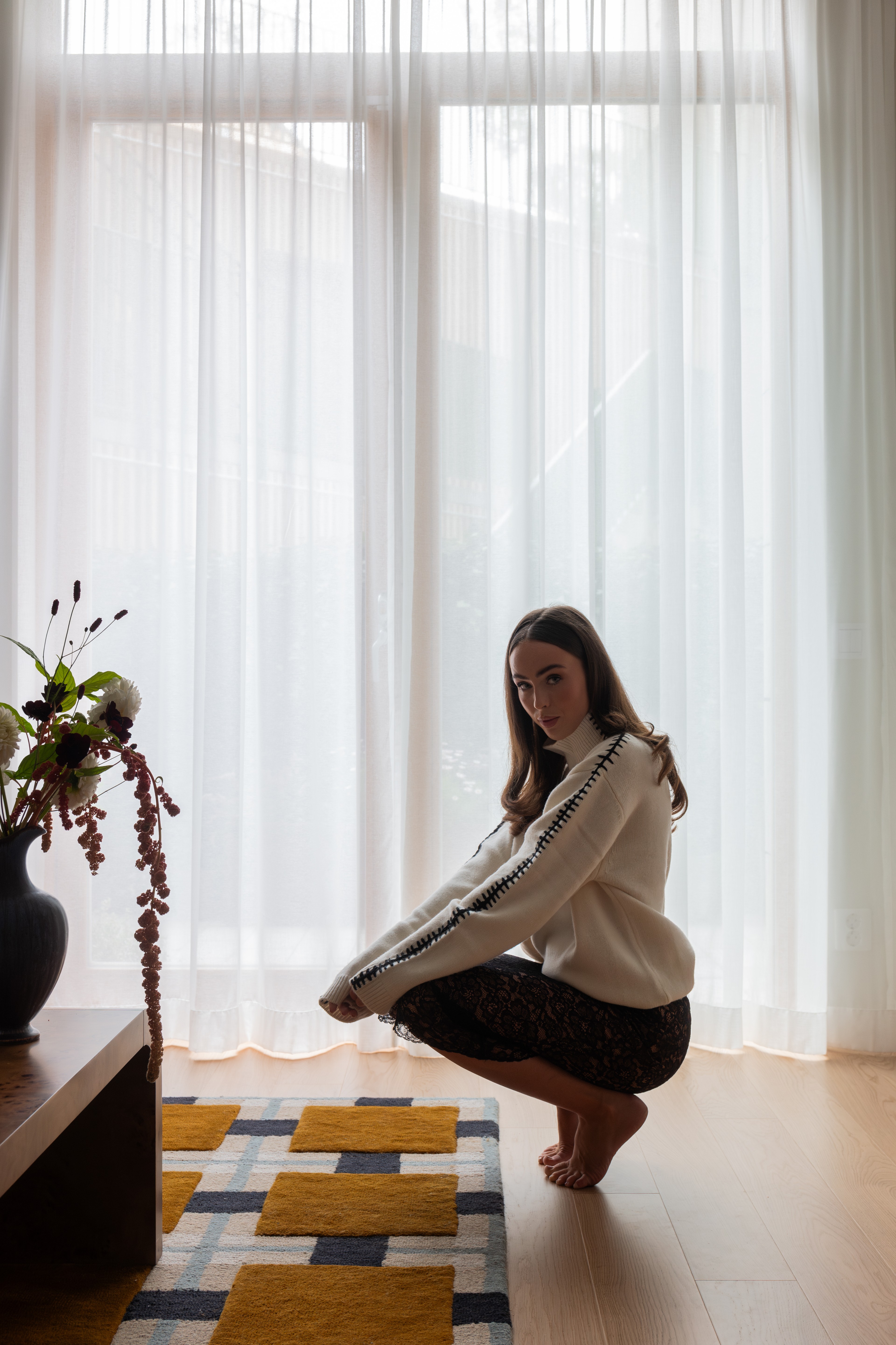 The bedroom is draped with hotel voile curtains in combination with ivory colored blackout curtains in woven linen, as a timeless back drop perfect for Lisa's creative side to play with color and shapes. We have brought a selection of pillows for the photoshoot, but when we put the mustard colored pillows on the bed we all catch our breath. The Gotnoir pattern with a mustard colored base are a perfect match with Lisa's green details!
