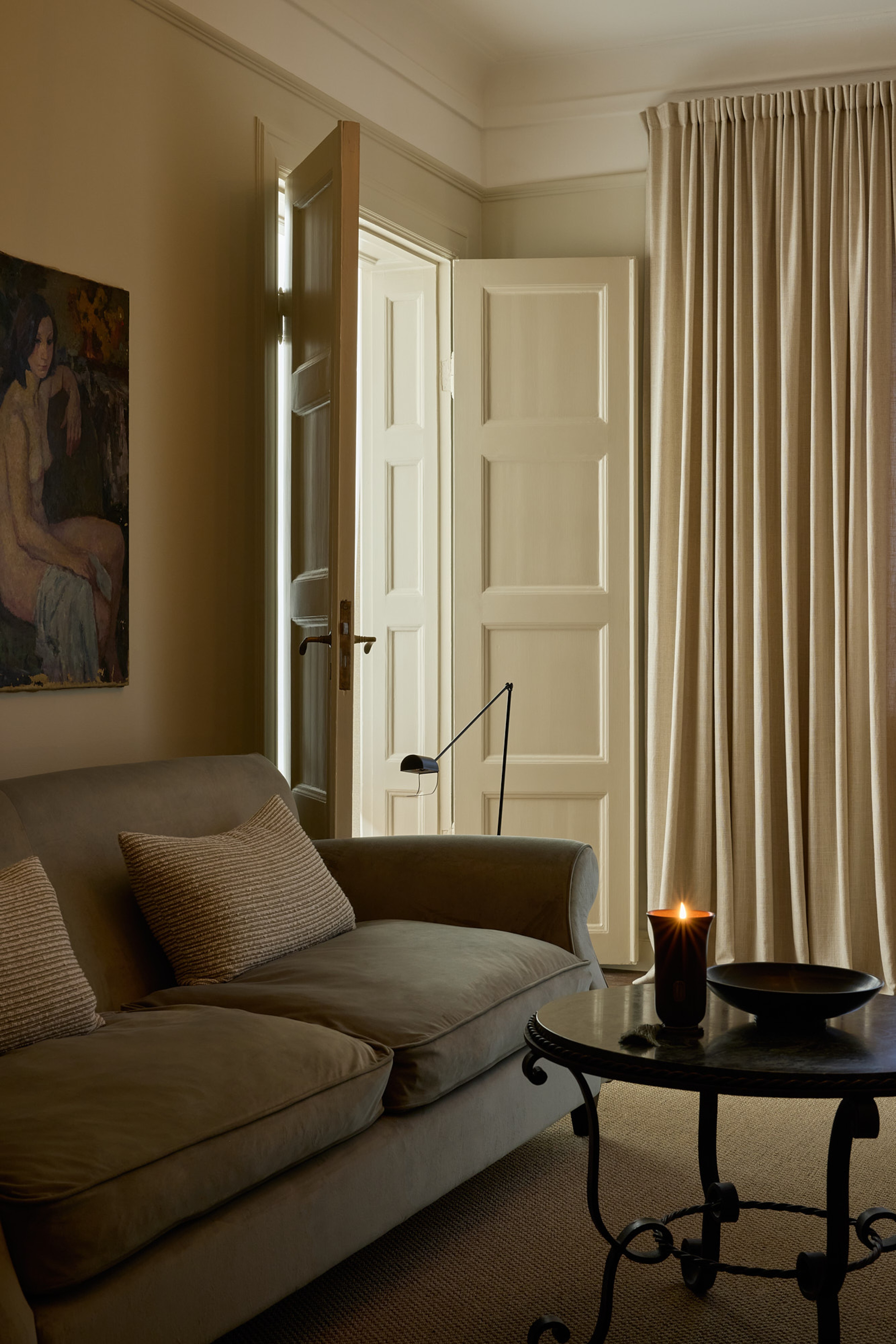 Above the sofa hangs a portrait of a woman, and Mathilda shares that art has become a new and growing interest: “A new interest of mine is art, something that has taken on a much larger role in the interior after the renovation. I’ve always been drawn to older paintings in a classical style but never felt they truly suited our previous homes. Now it’s different, and it feels wonderful to finally let that kind of art take its place. My favourite is a still-life painting with a bold, dark-gold frame that hangs above a doorway.”