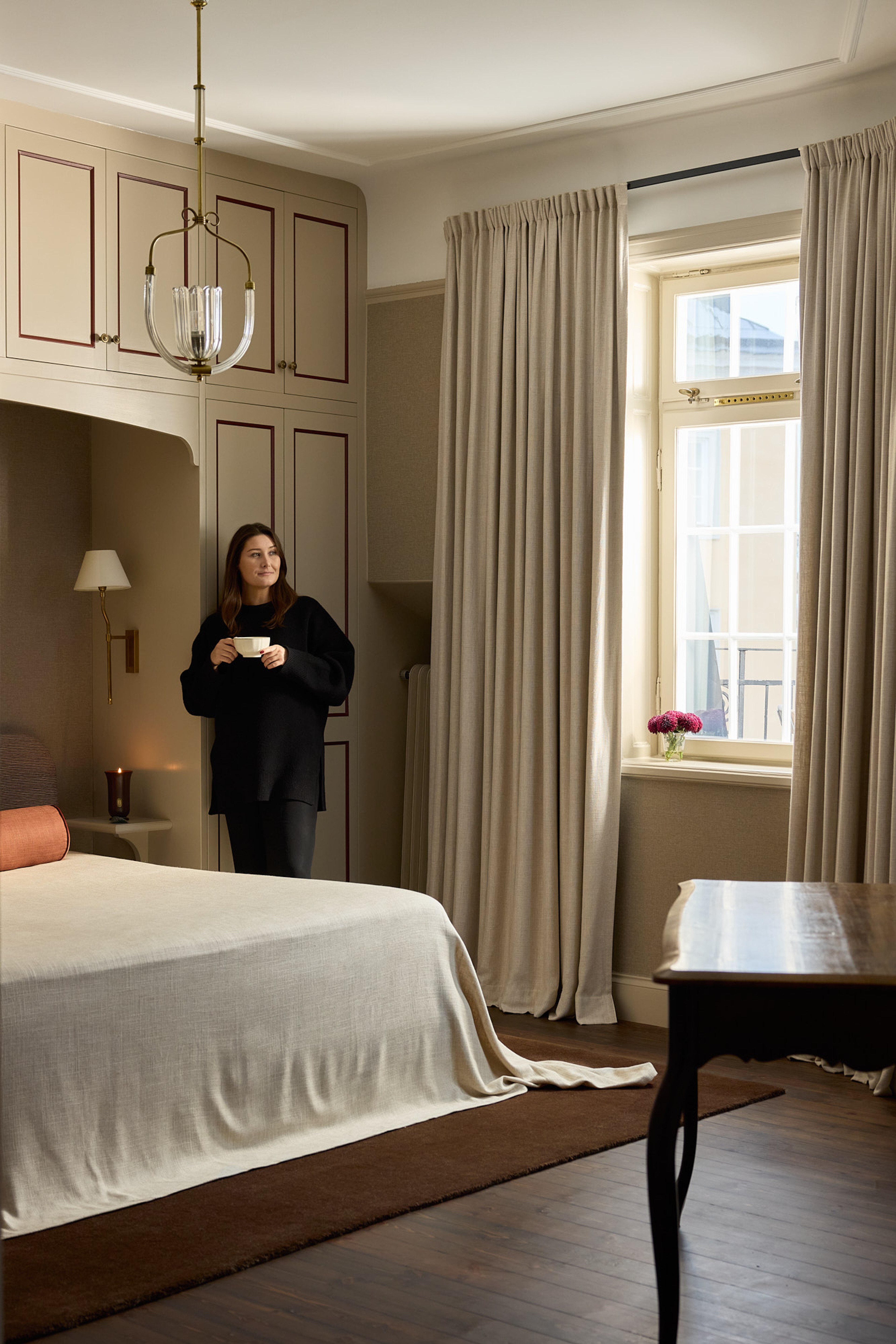 Mathilda explains that the bedroom is one of her favourite places, fitting for someone who works daily with indoor shoes. The bed has been built into a generous niche with smart storage, and throughout the apartment runs a thoughtful palette where burgundy details, including the lines of the hand-painted wardrobe doors, meet warm, light beige tones that form the foundation of the interior.