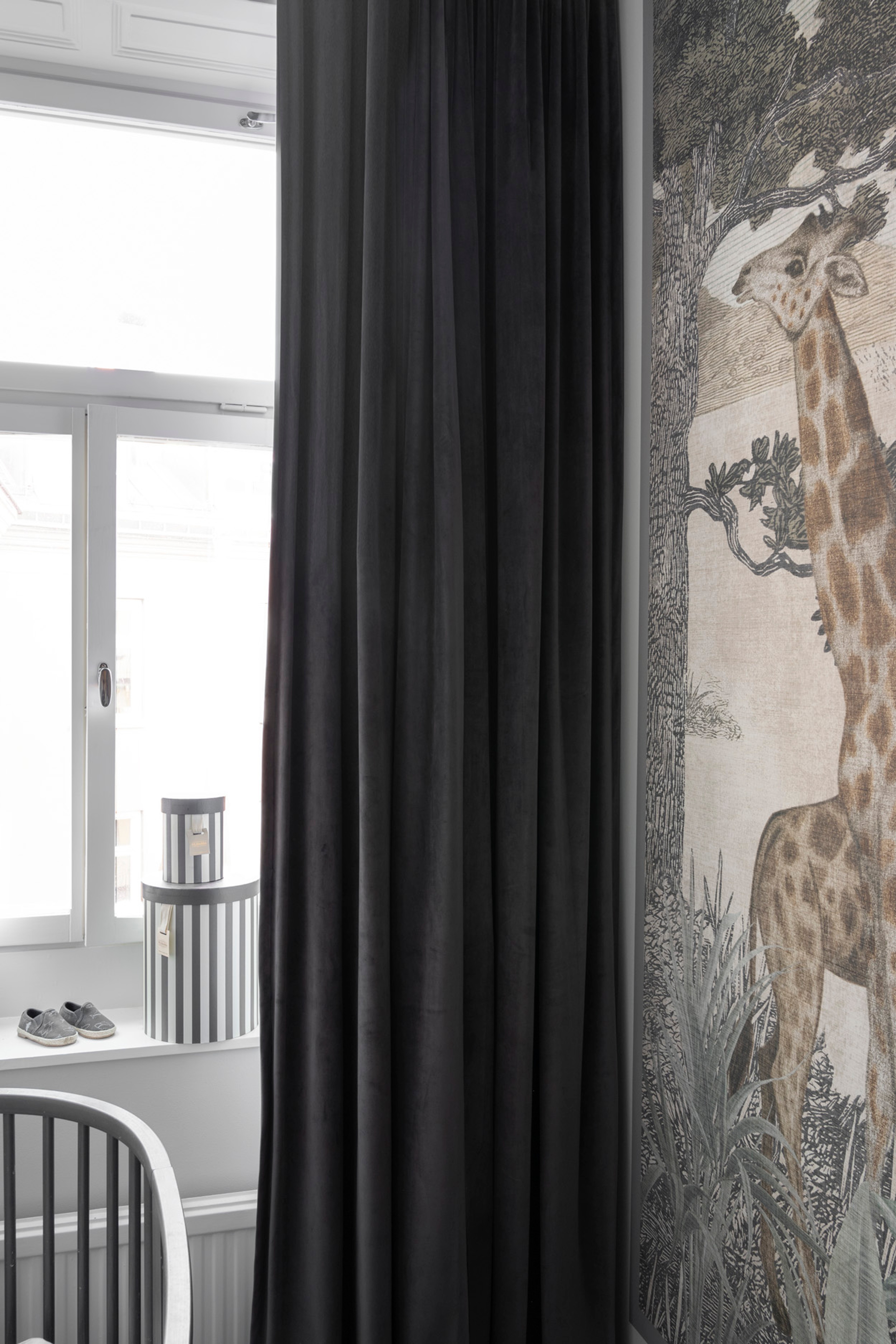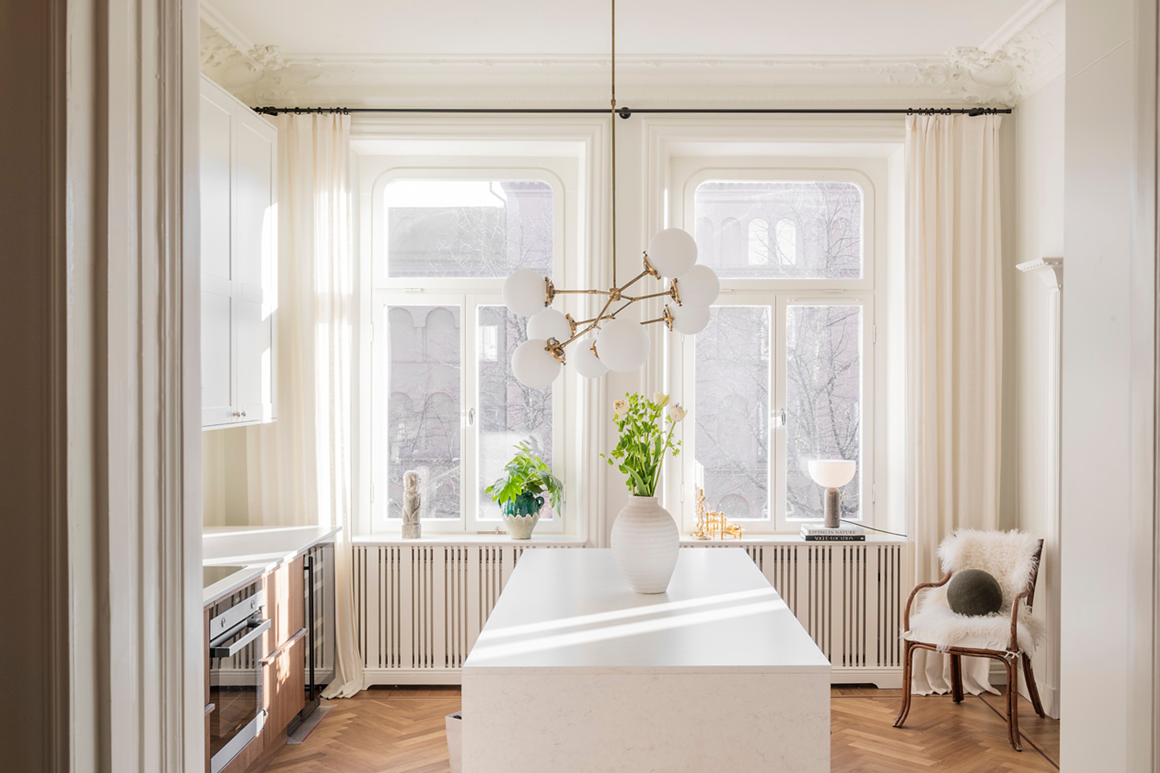 The apartment is centered around the kitchen and living room, with an open floor plan where the family has chosen an arched, time-typical, opening between the two sections. Decorating open spaces comes with it its own challenges, and uniformity in floors, wall colors and curtains is often the key to achieving a distinct style. A warm, white tone embraces both rooms and is nicely complemented by black curtain rods in wrought iron that give contrast and depth. It is easy to forget black in an interior, where even the smallest detail in black is a simple trick to anchor and enhance the impression of other colors and details. In both rooms, Gotain's woven linen curtains hang in off-white, where the fabric creates warmth and dimension without stealing attention within the interior. Wherever we look, we find small details that make us smile a little in secret, like playful sculptures in shapes of animals and details with hints of nature which seem to be Stephanie's hallmark - all of course purchased in vintage stores over the years.
