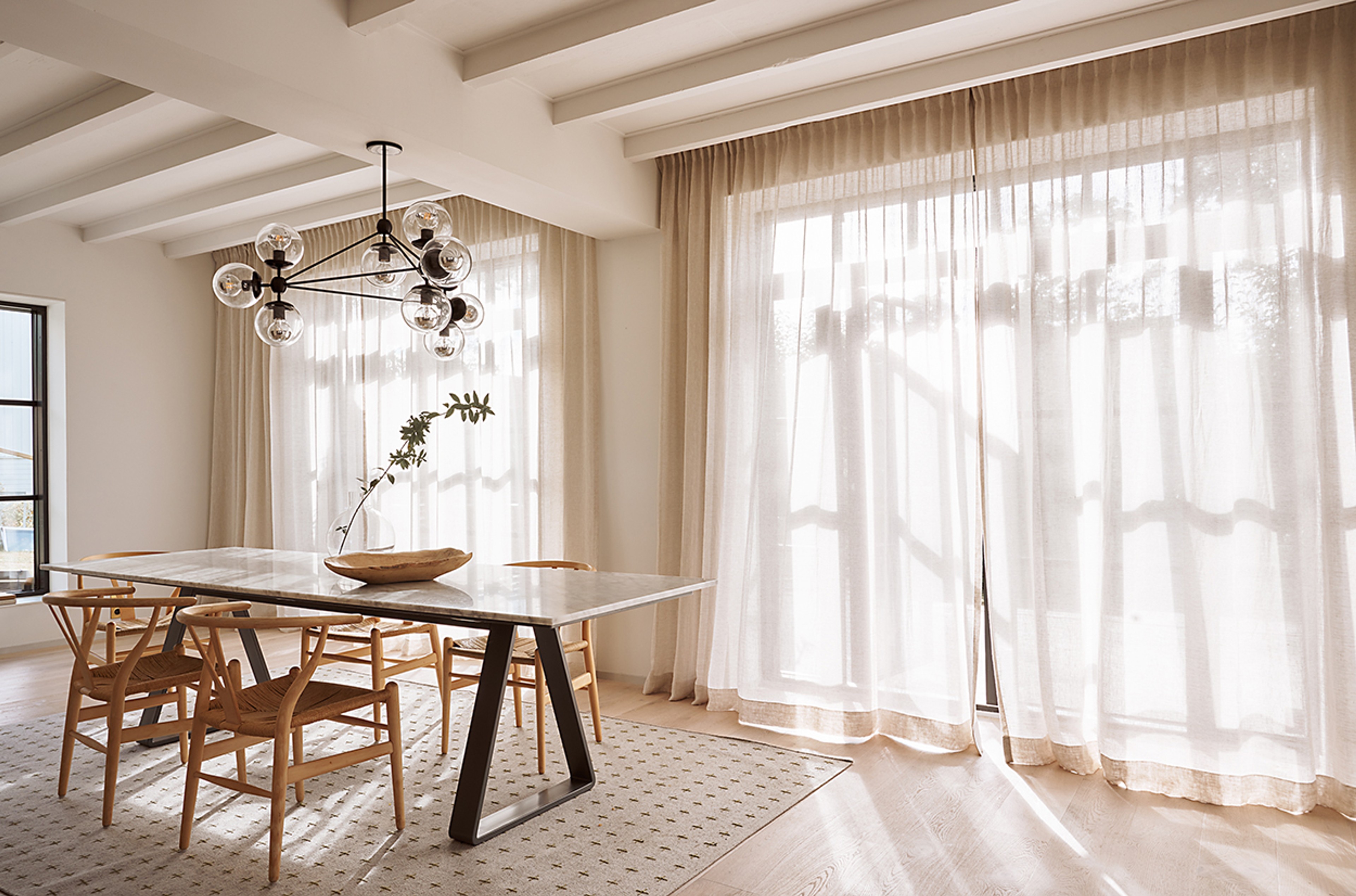That contrasts are a cornerstone in interior design goes without saying, but it is rare to see such a clean textbook example as this home created by Valerie and her family. The sharp shapes of the architecture together with the black, industrial windows are complemented by thin linen curtains in sand tones that give a textured, natural feel. By choosing double-width curtains, you get the most generous and billowing waves. The thin fabric brings warmth to both the dining area and kitchen, without compromising on the lush landscape outside.