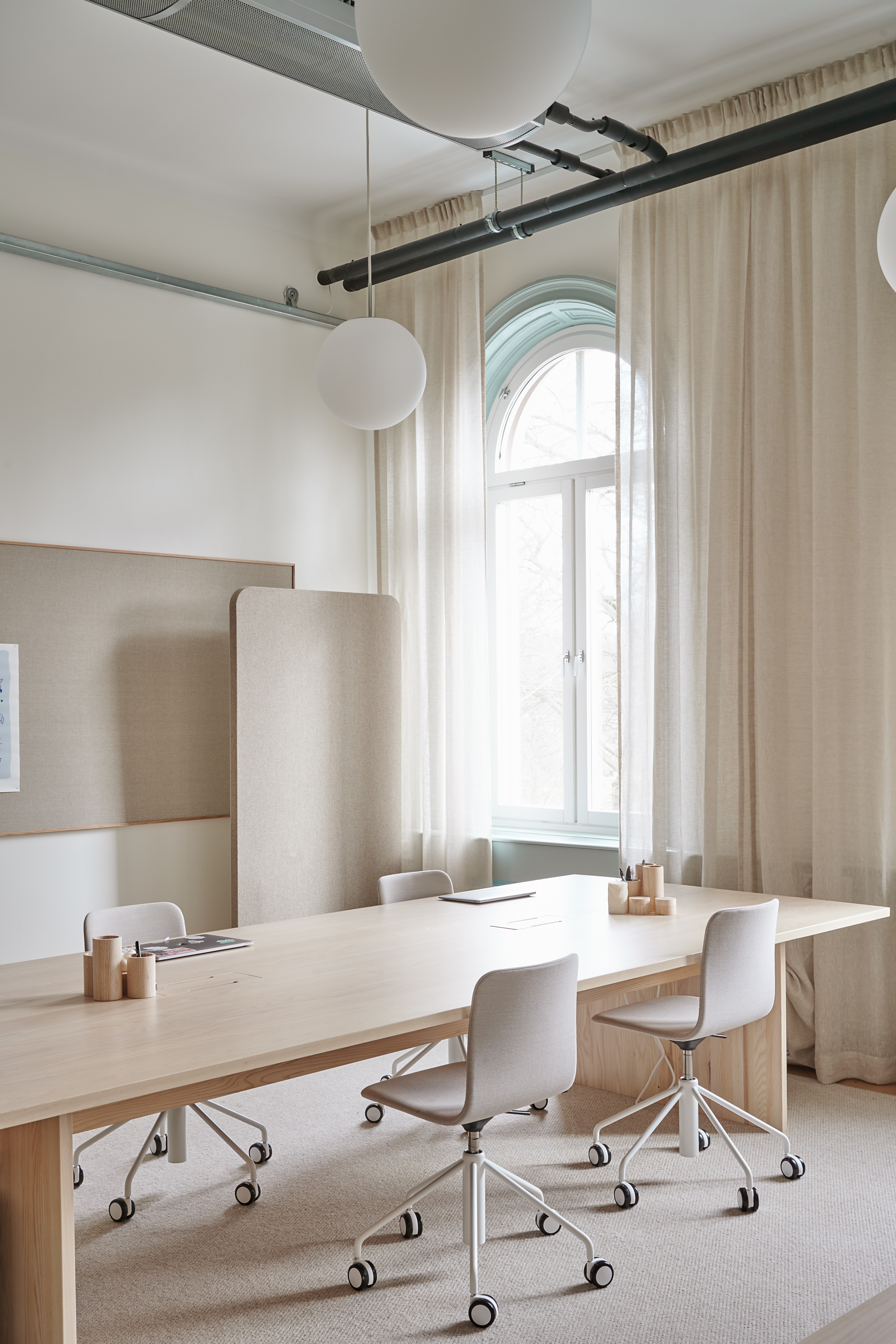 In the conference rooms, the curtains hang in two layers, a thin linen curtain in Sand and a woven linen curtain in Sand, depending on how brightly the sun shines in.