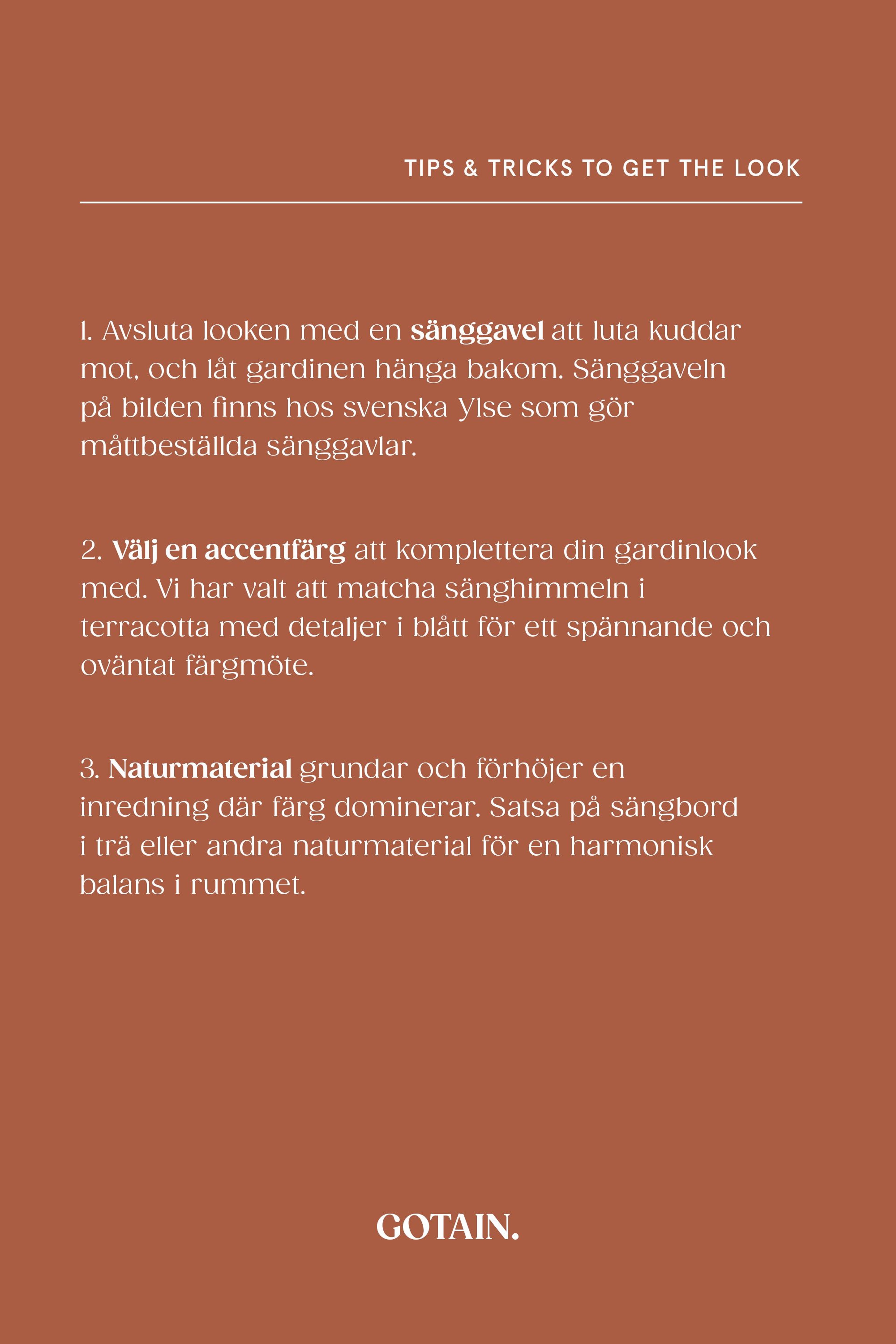 The Nest look is a flowing bed frame that, with its simple yet impactful design, can transform any bedroom into a dreamlike oasis. Depending on the room's ceiling height, you can easily adjust how much the drapery hangs down above the bed.
