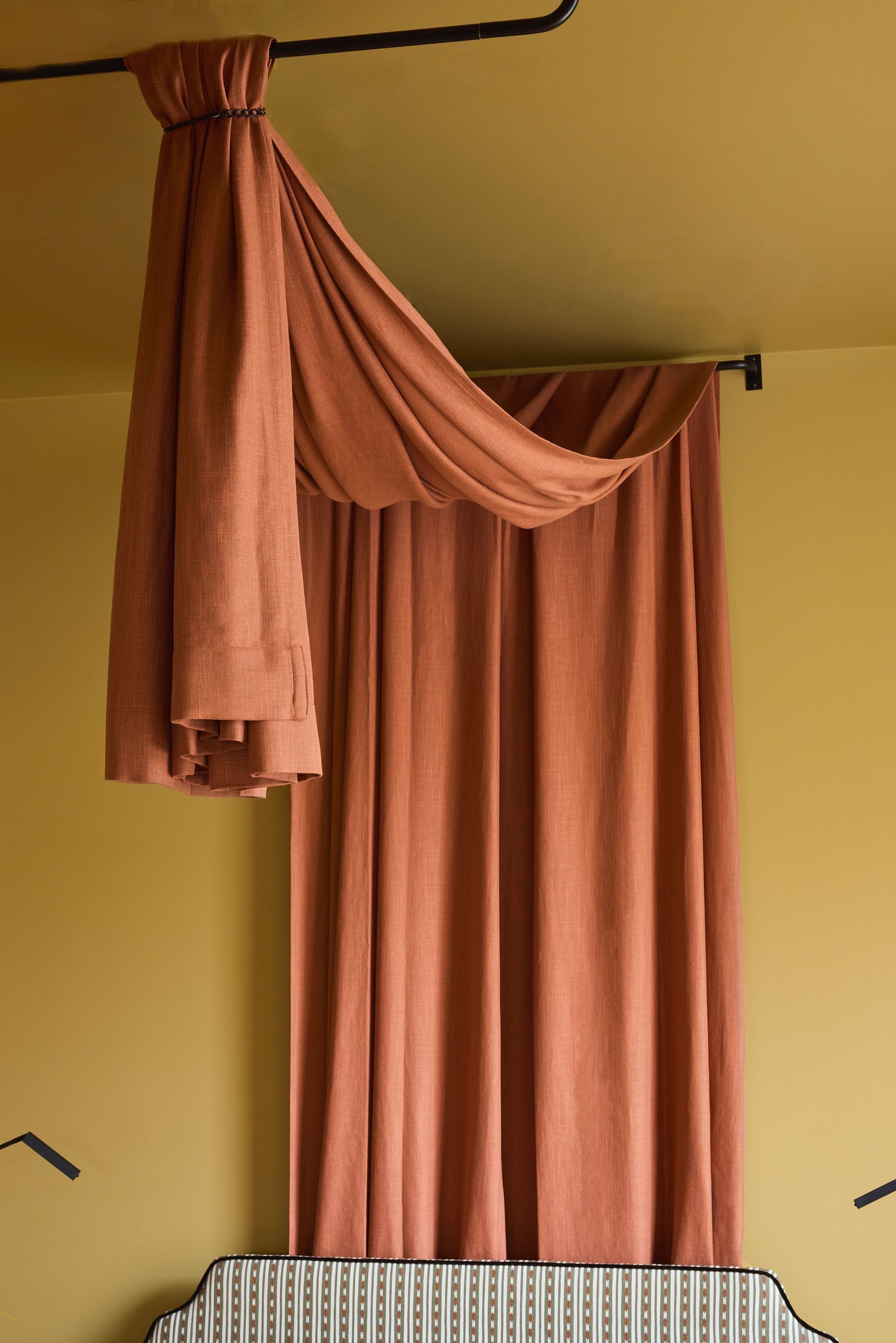 In this room, a woven linen curtain in double width hangs from a black curtain rod that has been cut into two parts and finished with French rod ends.