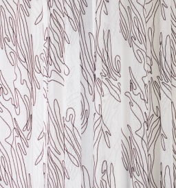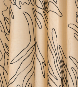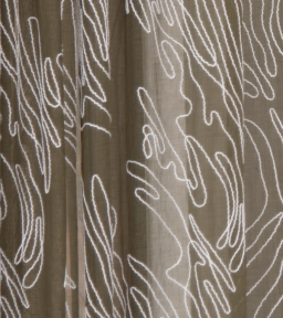 En flortunn gardin med stilsäker brodyr i rustik garnväv. Sys för hand till ditt exakta mått i vår ateljé i Sverige, kombineras med en tjockare gardin för lyxig hotellkänsla. Gardinen har ett veckband som passar i både skena och stång.