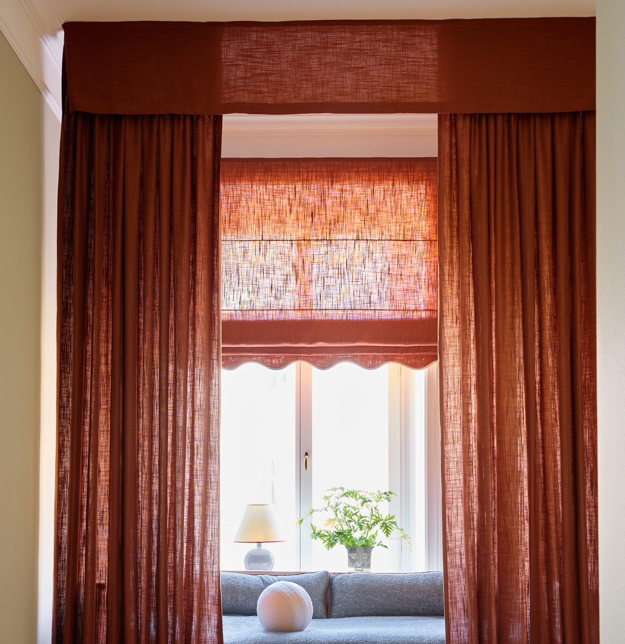 - Gardinkappa vävd linne terracotta med rakt avslut.