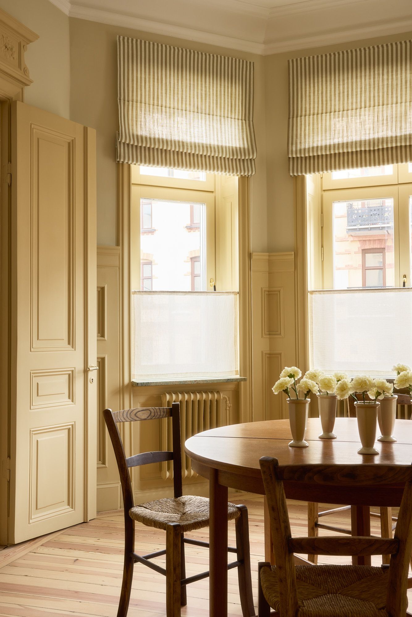 A curtain combination growing in popularity is pairing Roman blinds with café curtains. Roman blinds are positioned over the upper part of the window, allowing for easy adjustment of both light and privacy, while café curtains on the lower part provide a more permanent sense of seclusion.