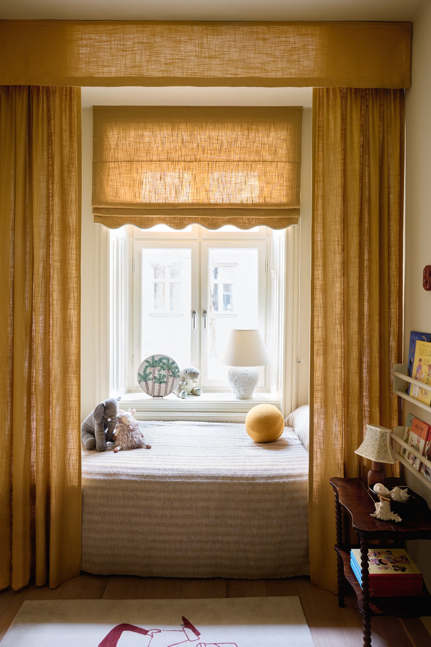 Don't limit yourself to one color or style, try mixing and matching to create a unique kids room. Tone on tone or contrasting, only your imagination is the limit! Here you can see Terracotta roman blinds in woven linen, in combination with Mustard colored curtain lengths in woven linen.