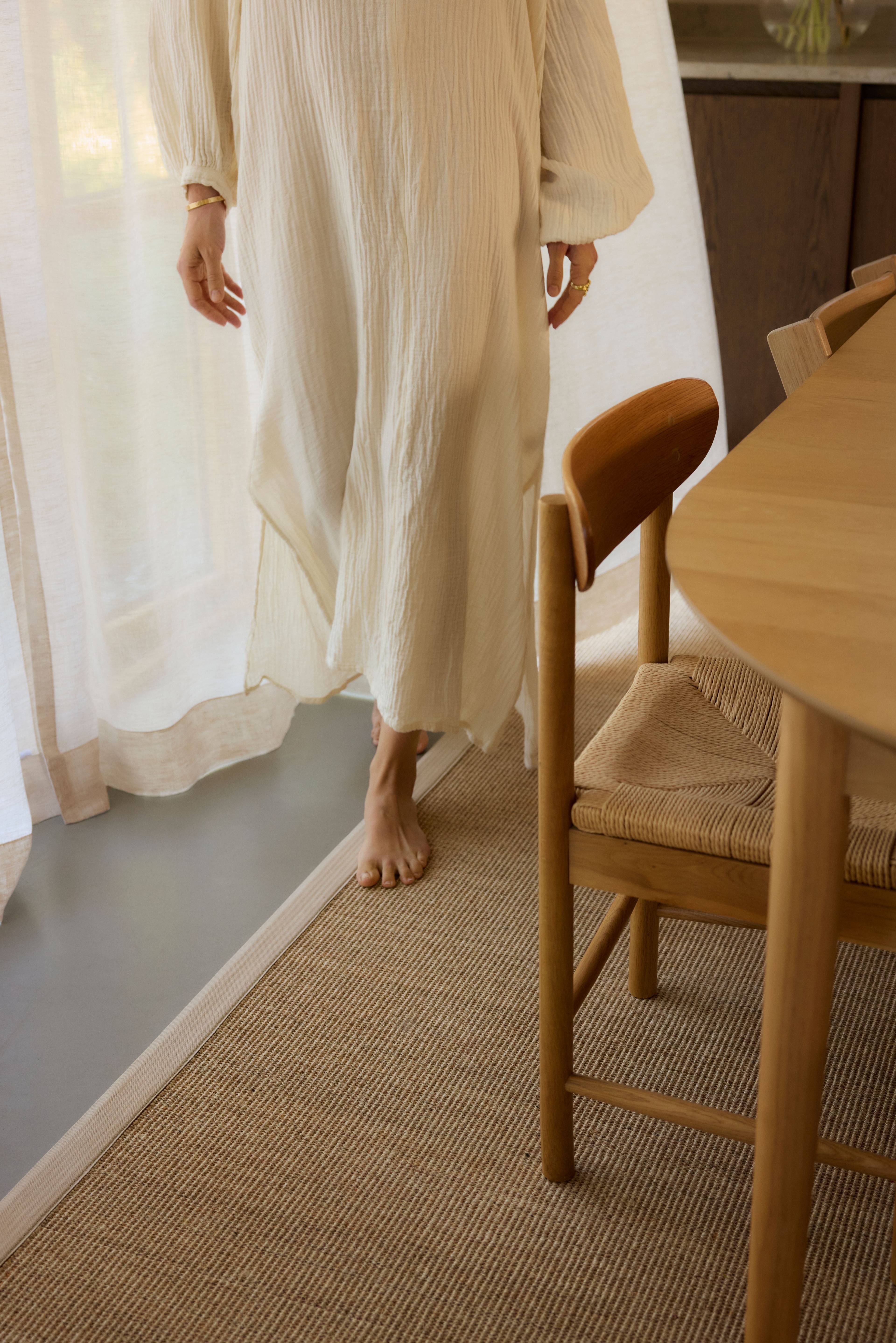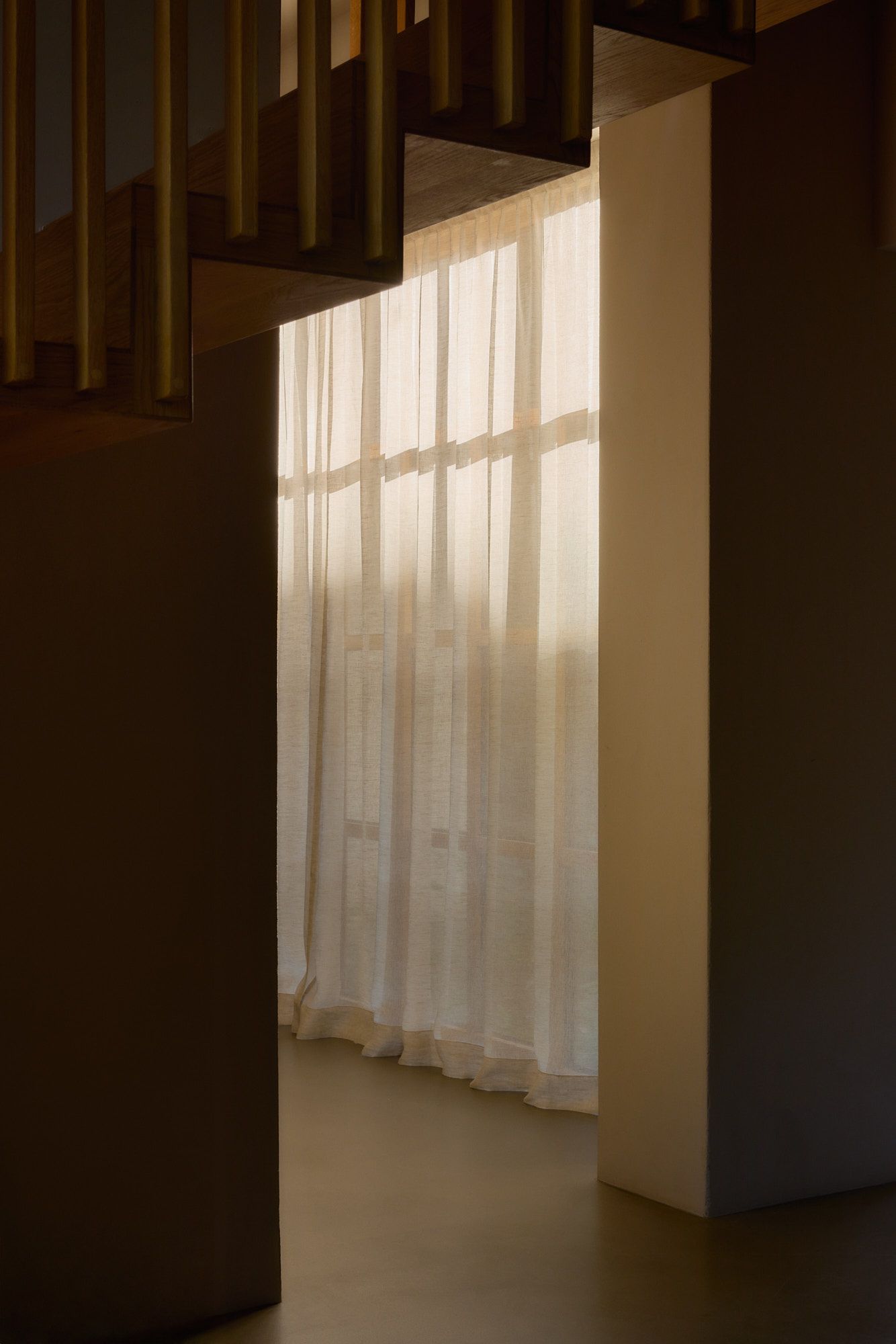 Throughout the home, Sheer linen curtains in the color Sand appear in the kitchen, living room, and bedrooms. Amanda explains that she had long had a clear vision of how she wanted the home to feel – almost like a cinematic scene, with doors and windows open and curtains gently floating in the air. The sheer linen curtains therefore became a natural choice. They also pair beautifully with the other natural materials throughout the home.