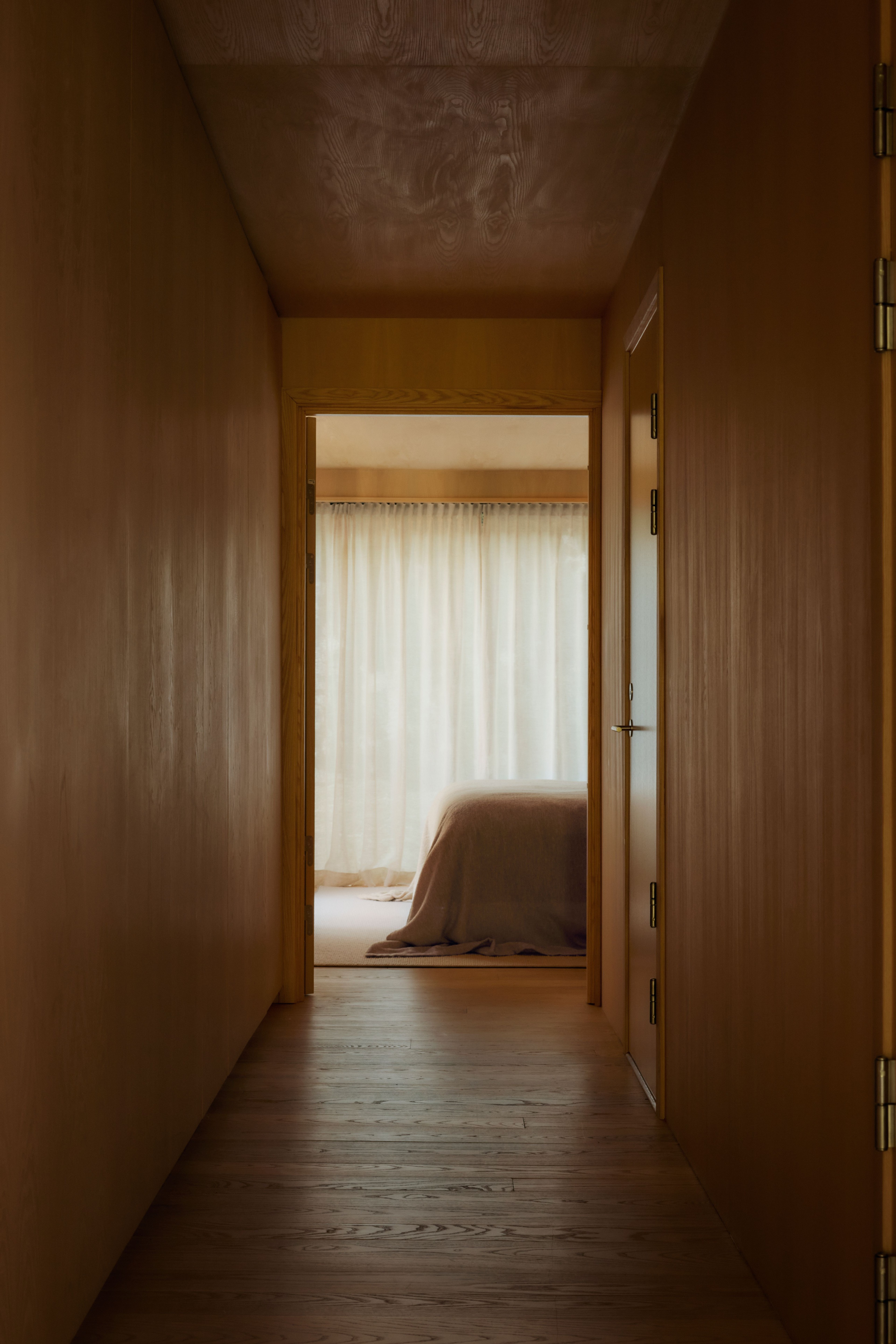 At the end of an oak-clad hallway on the upper floor are the bedrooms. Here, a large window covers an entire wall, functioning almost like a living forest painting to fall asleep and wake up to. The sheer linen fabric acts like a soft curtain against the stone behind it. In the bedroom, the sheer linen curtain is paired with a woven linen bedthrow in the same natural tone.