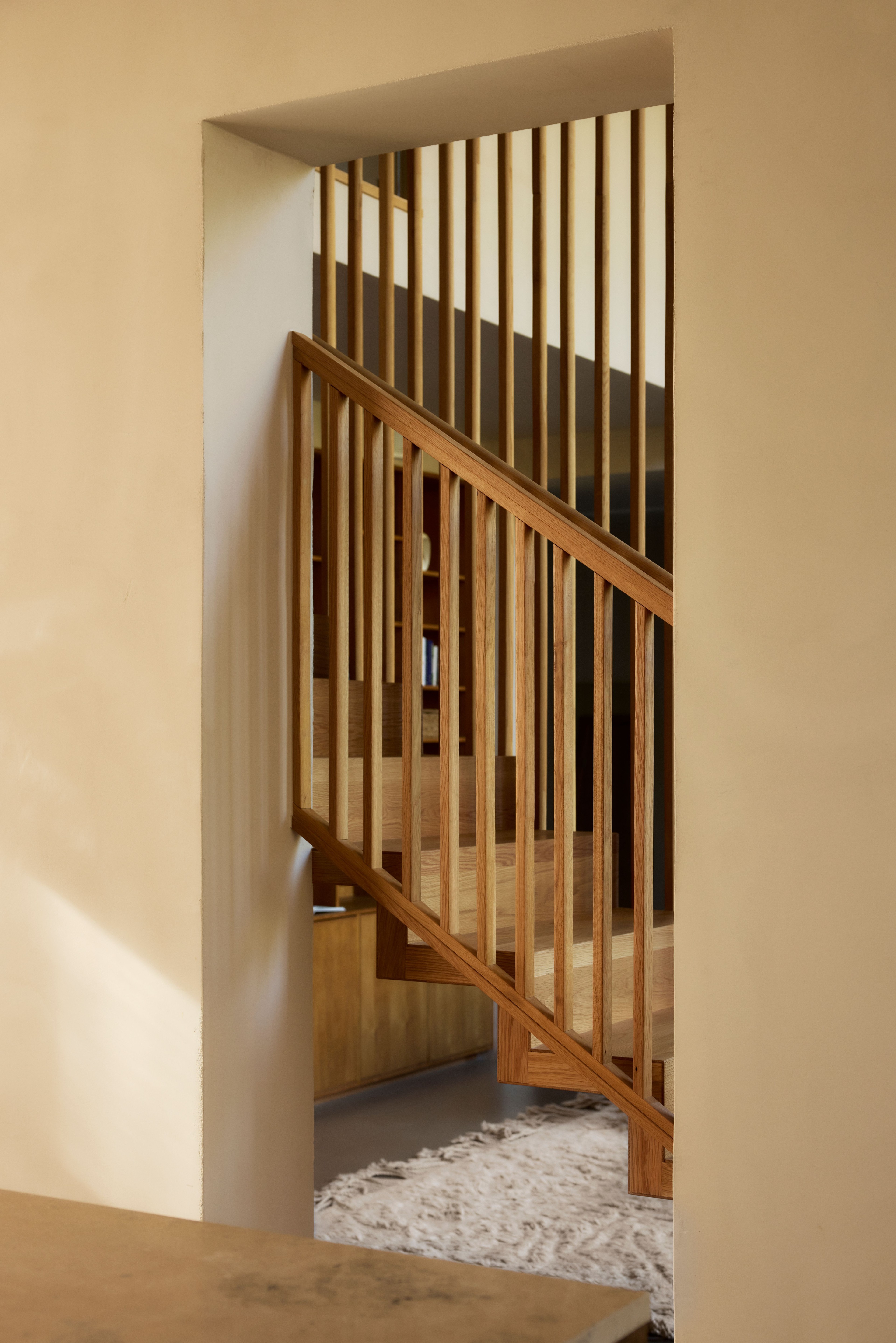Amanda and her husband Marcus immediately fell in love with the character of the house – and we completely understand why. The stone walls, the six-meter-high window section in the living room, and the many oak details – the built-in bookshelf, the staircase balustrade, and the upper floor clad in wood from floor to ceiling. The contrast with the stone materials on the ground floor creates a beautiful balance throughout the home.