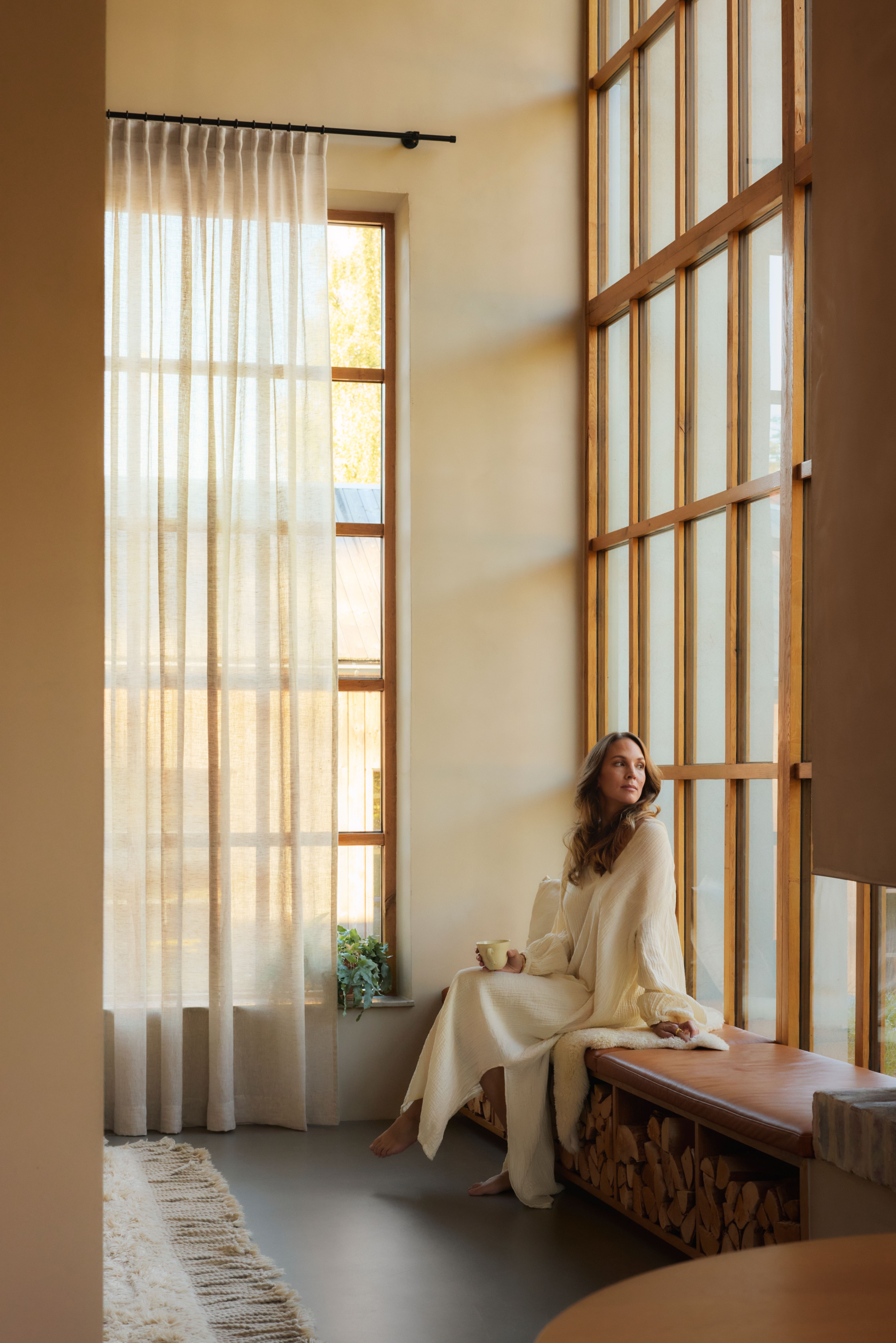 We visit Amanda on a sunny autumn day out on Ingarö, in the Stockholm archipelago. Here she lives with her family in an architect-designed home that brings a sense of calm to the soul. Large windows and generous natural light are softened by Sheer linen curtains in Sand. The house is surrounded by greenery and tranquility. Nature is constantly present, both outside and inside, where the forest almost feels like an extension of the home’s rooms.