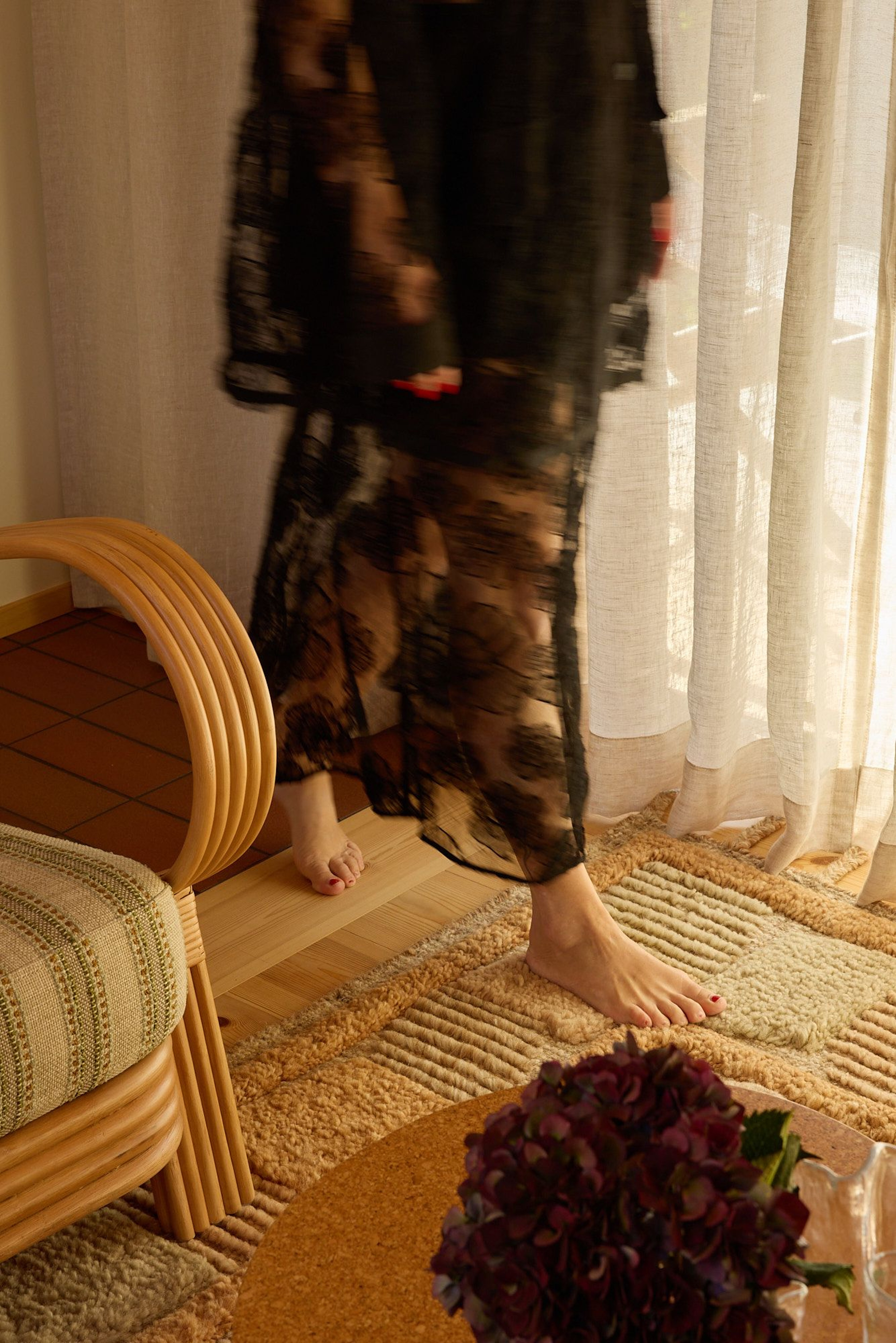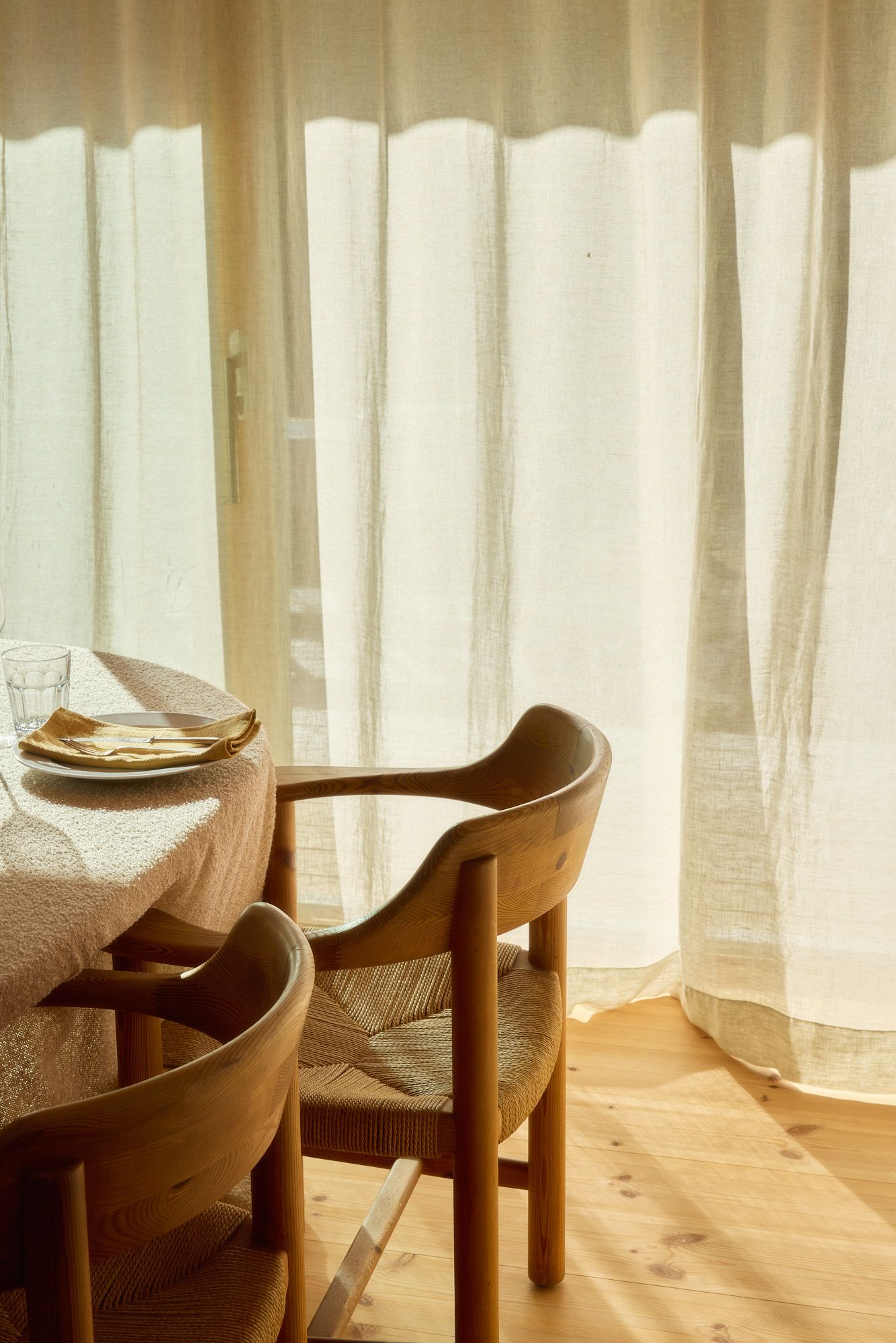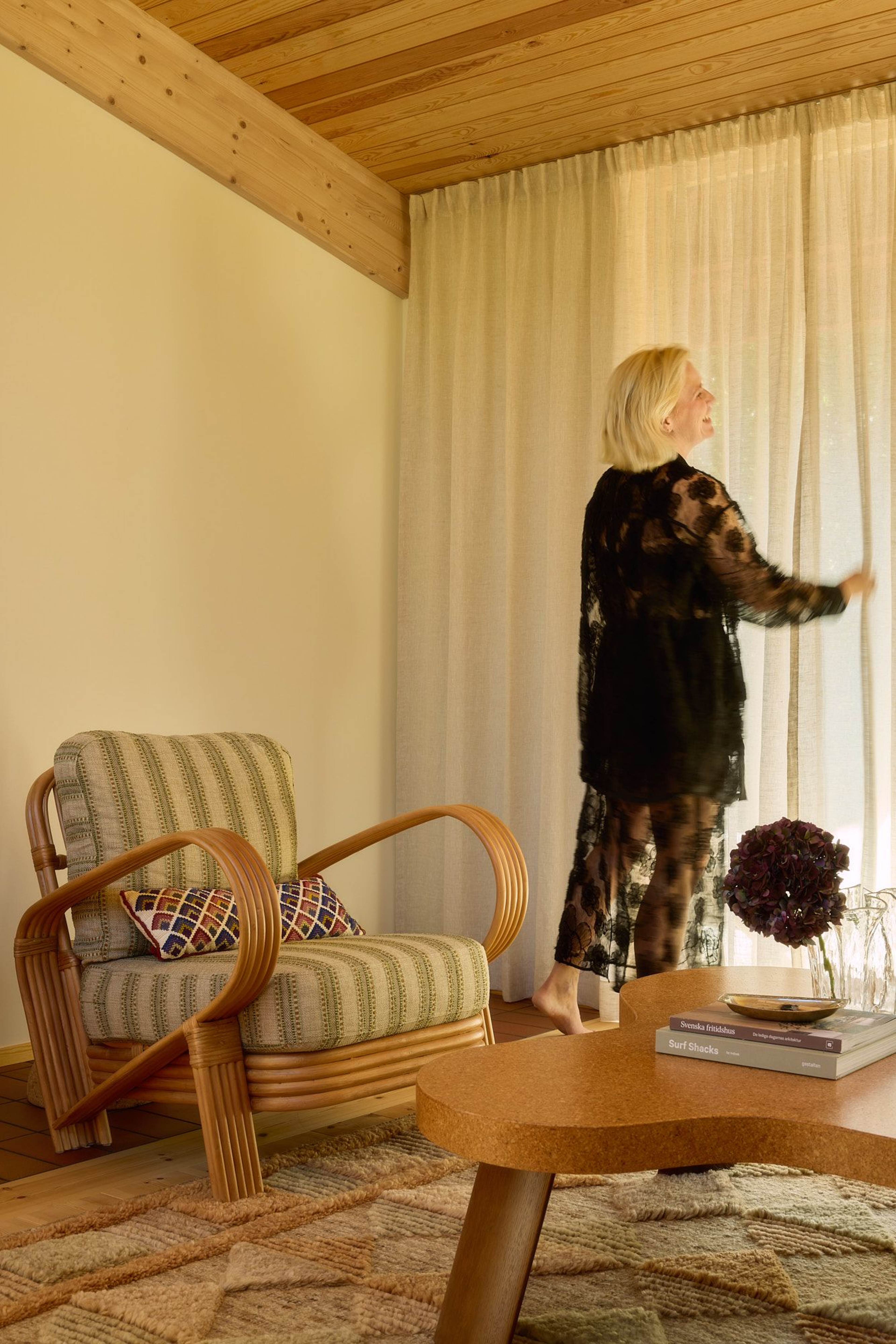“I went with sheer linen curtains in the living and dining rooms because I love how the light changes throughout the day,” says Frida. The room, with its large windows and doors opening onto the terrace, is dressed in sheer linen curtains in Sand. They lend an airy feeling, just like the house itself, which seems to float above the rock. The curtains move softly when the door is open and the breeze drifts in.