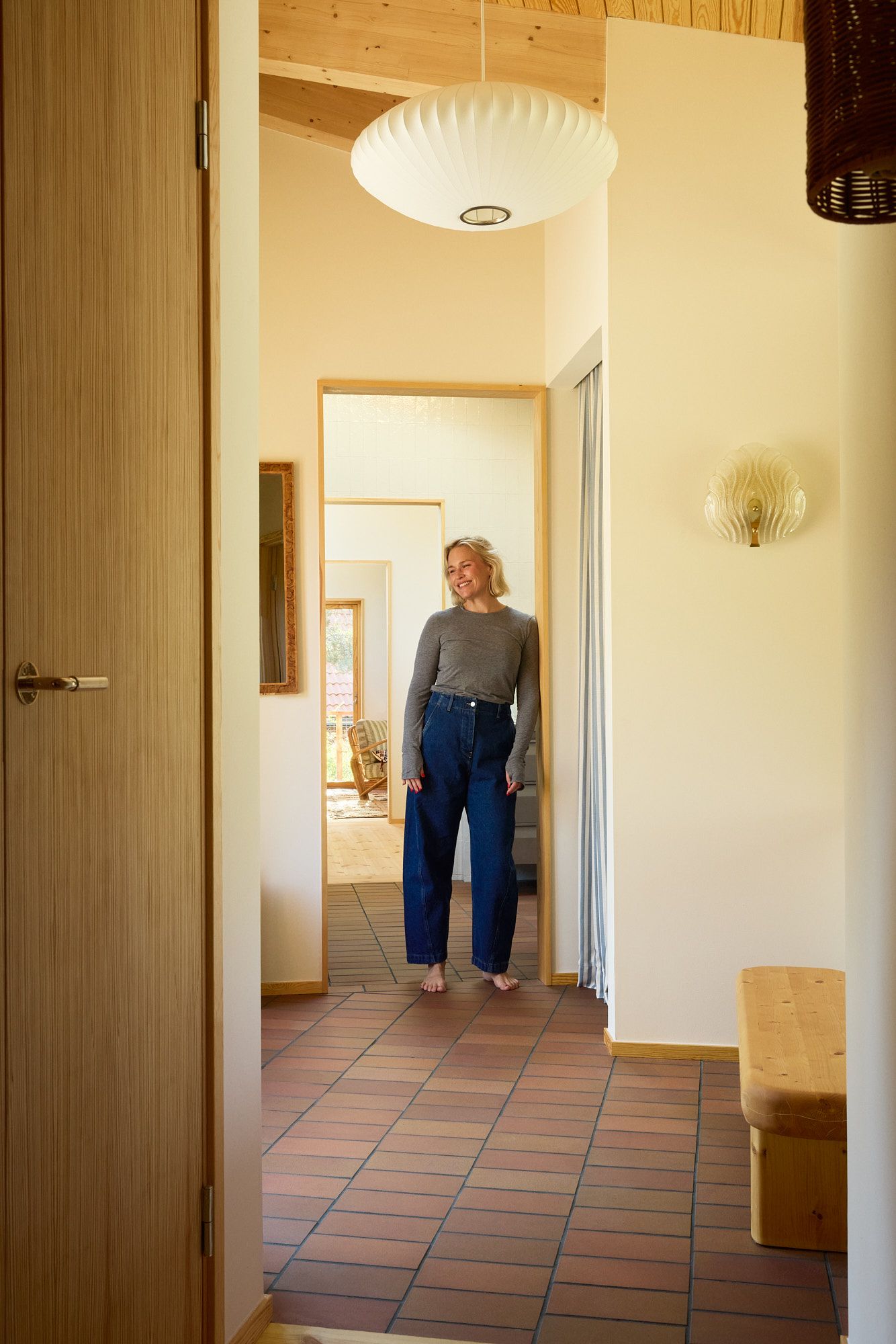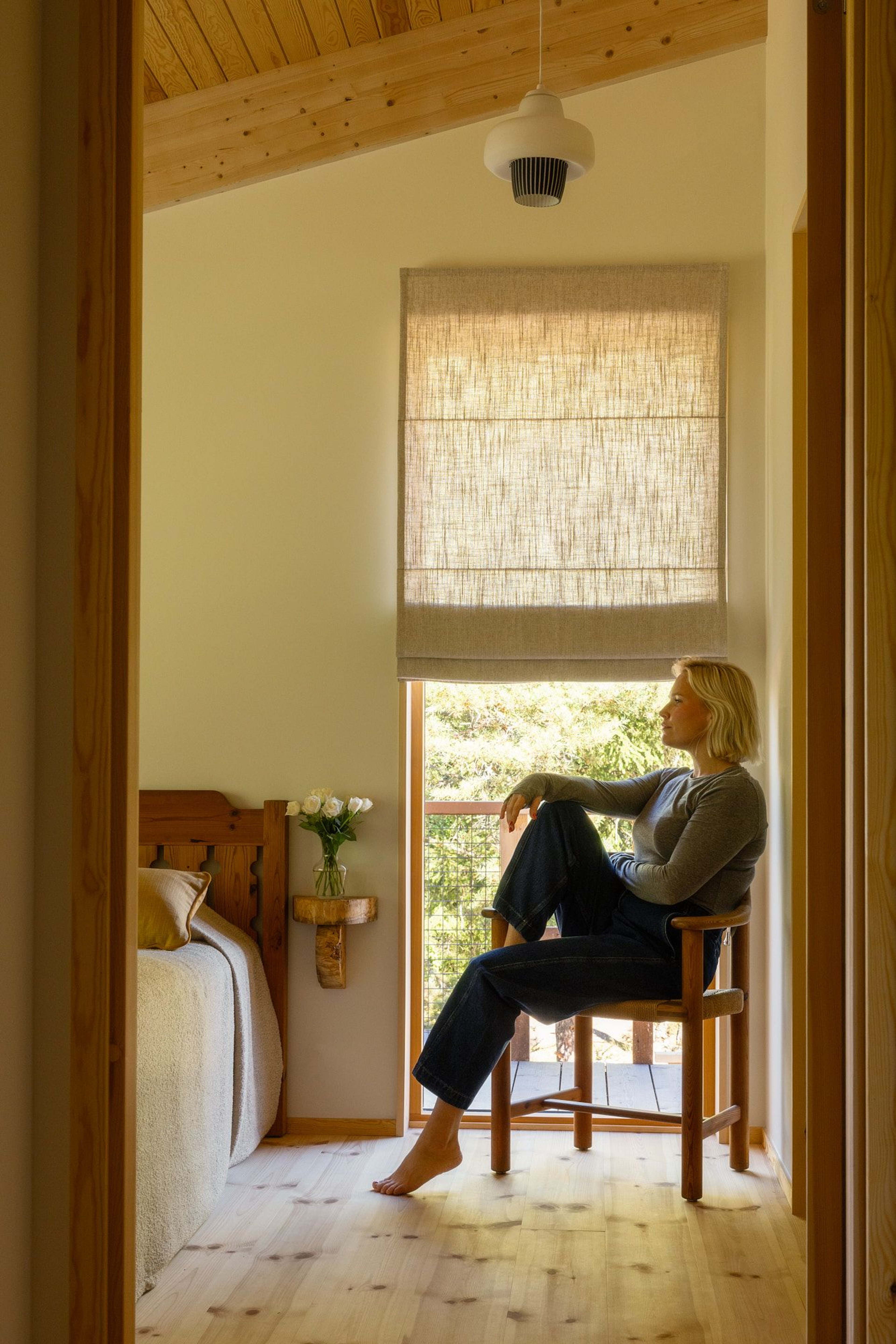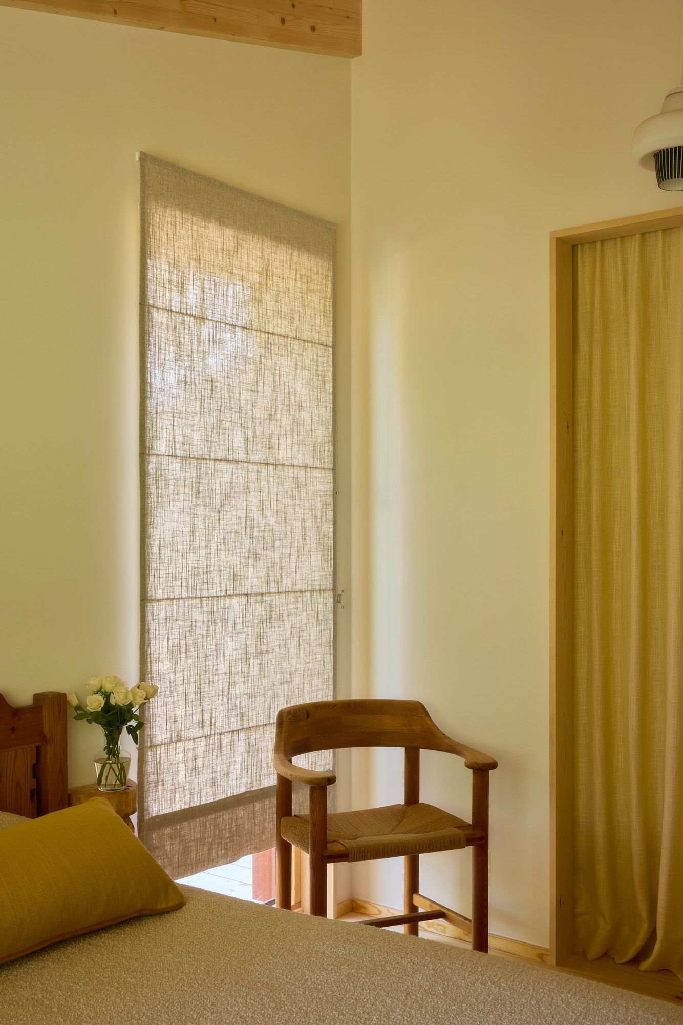 At the far end, the master bedroom comes into view. Here, the window is dressed with a Roman blind in woven linen in the color Sand, a perfect tone that harmonizes beautifully with the wood details throughout the house. The open wardrobe features Woven linen curtains in Oat Yellow, which both conceal storage and add a warm note to the room.