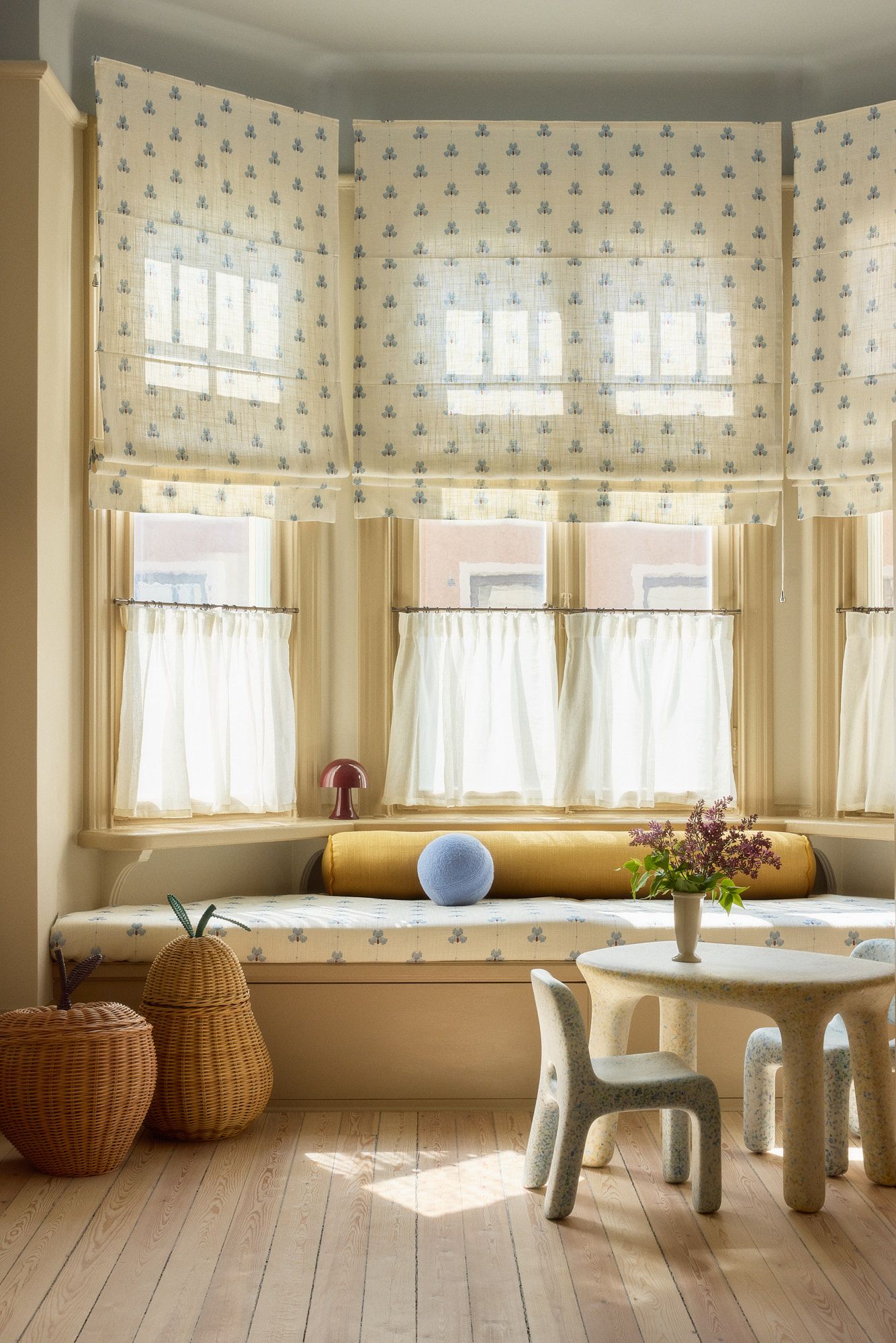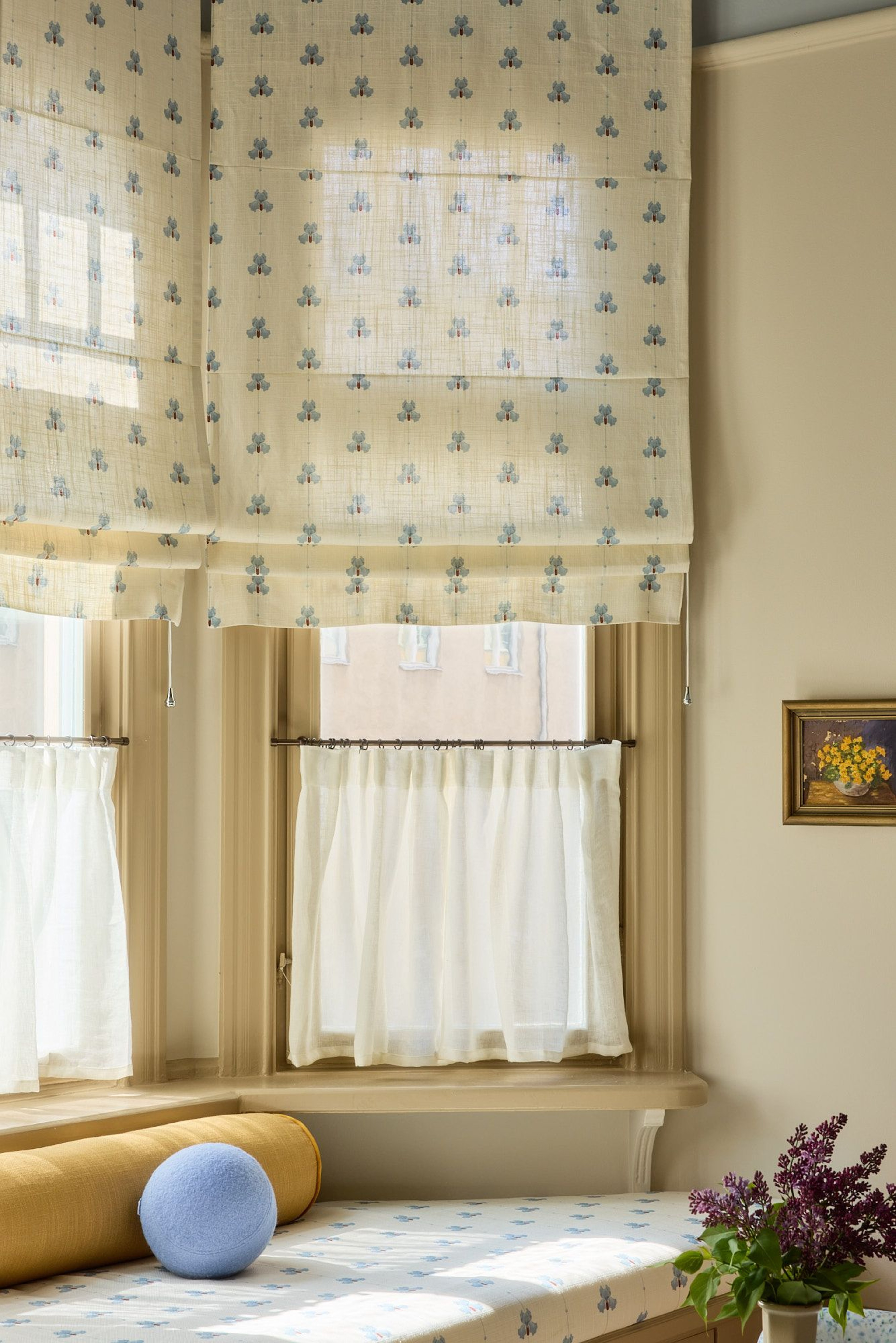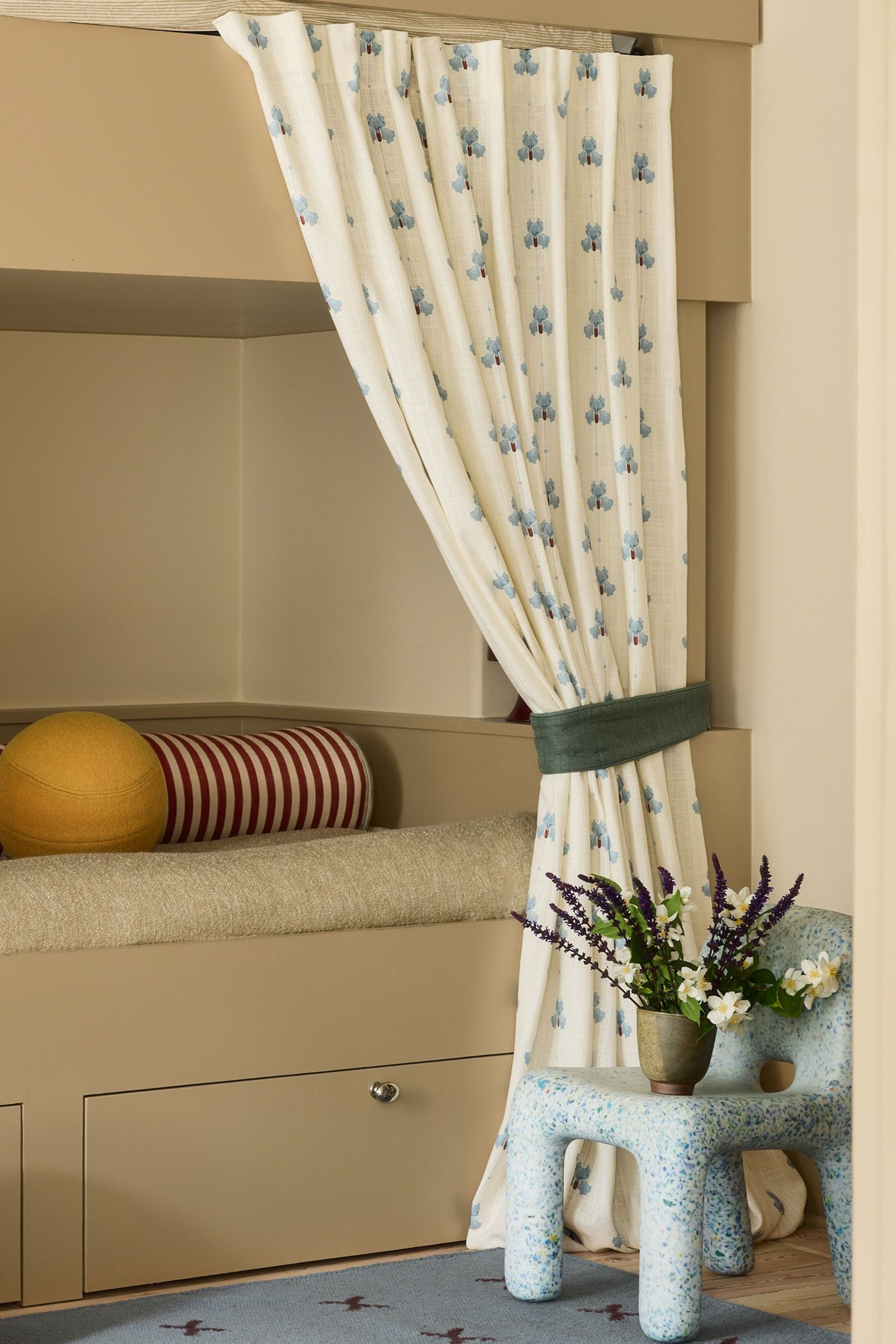 The kids’ room became one of the spaces where color really took the lead – and where the textiles laid the foundation for the rest of the decor. Roman blinds in Sweet Pea meet café curtains in sheer linen in a combination that feels playful, bold, and airy. “The children’s room is everyone’s favorite!” says Hanne. “We love the blue flower pattern and the stripe in the bay window, and how they tie in with the ceiling. We often curl up in the built-in bench, all four of us, to read a book or watch a movie.”