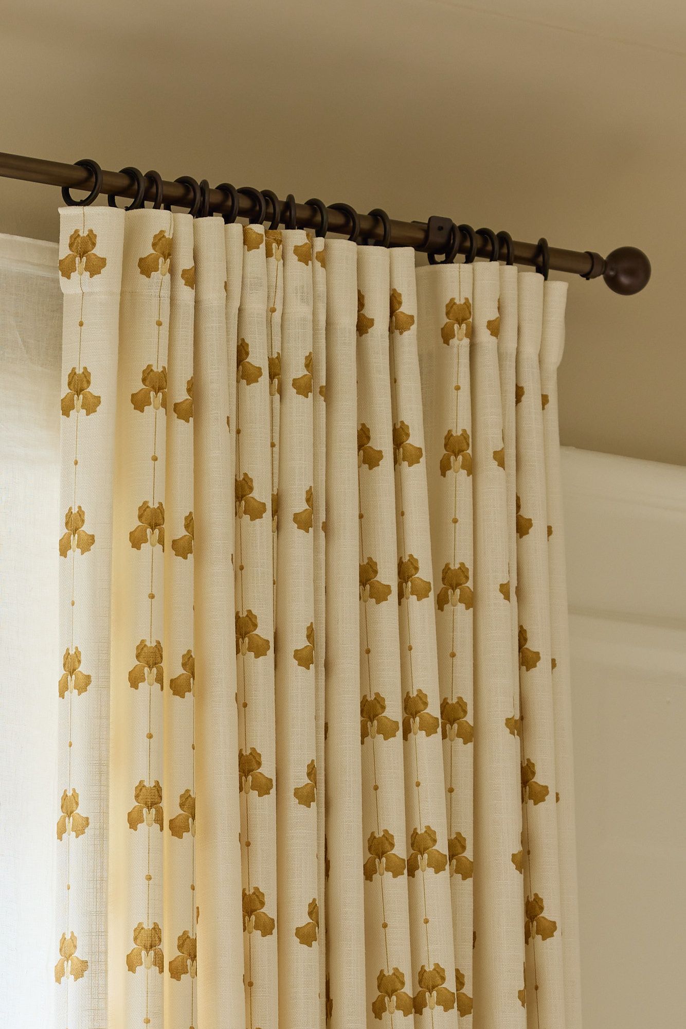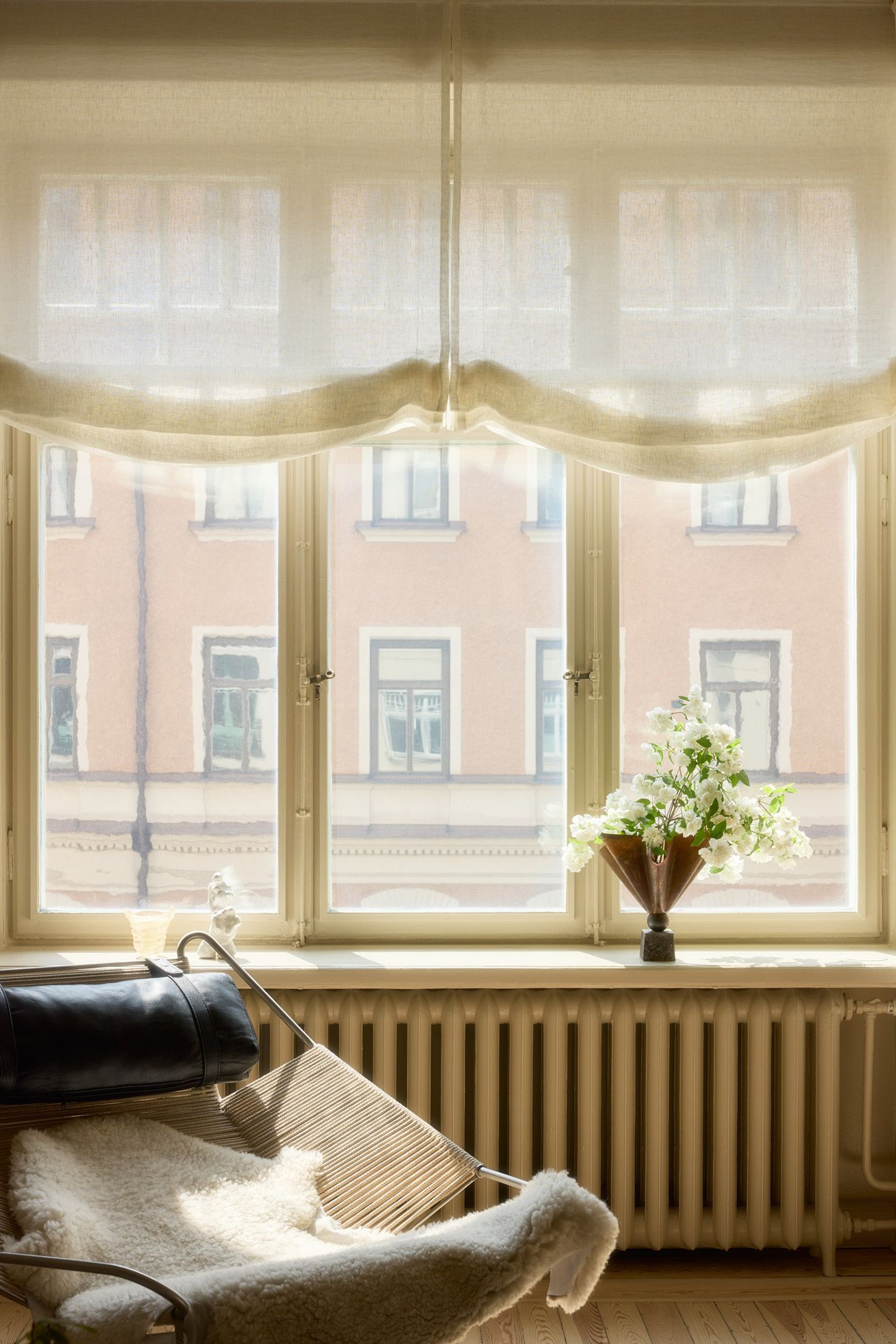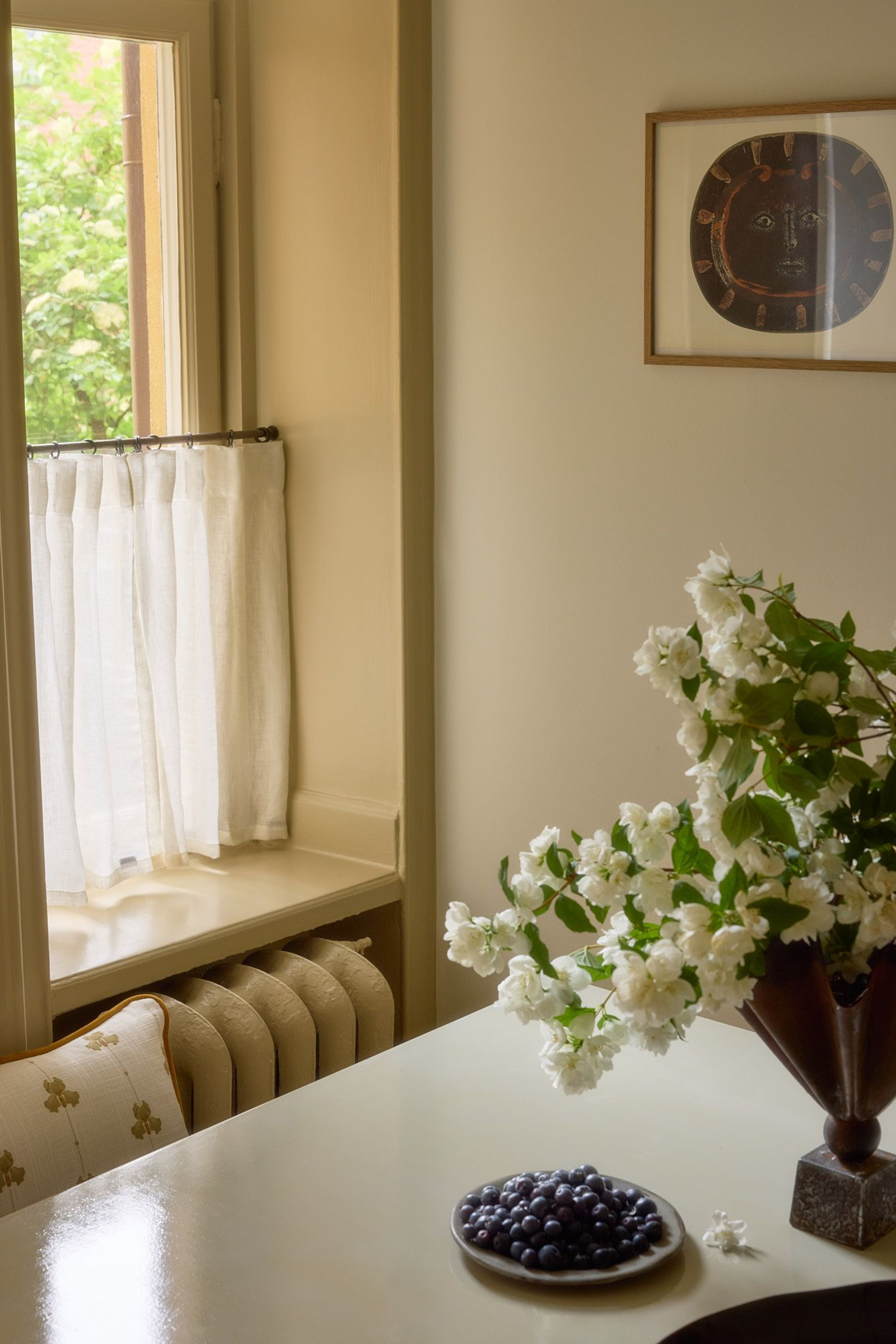 In the living room, you're met by a striking, south facing, wall of windows where the sunlight floods in, bathing the space in warmth and brightness. It’s here that Hanne surprised us with her curtain solution - an unexpected and personal interpretation of the window’s potential. Because of its size, the Roman blind was split into two sections. The result? A gently undulating hemline that adds a soft, elegant movement to the room. A seemingly simple choice that turned out to be one of the space’s most impactful design details.To complement the Roman blinds, Hanne chose full-length curtains in Cottage Sweet Pea, in a soft mustard tone – a warm, muted color that adds depth and character. The floral pattern, with its subtle rhythm, paired with the cleaner lines of the blinds, creates a dialogue between the graphic and the organic. It’s a composition that allows Hanne’s keen sense for contrast – in both color and form – to shine through.