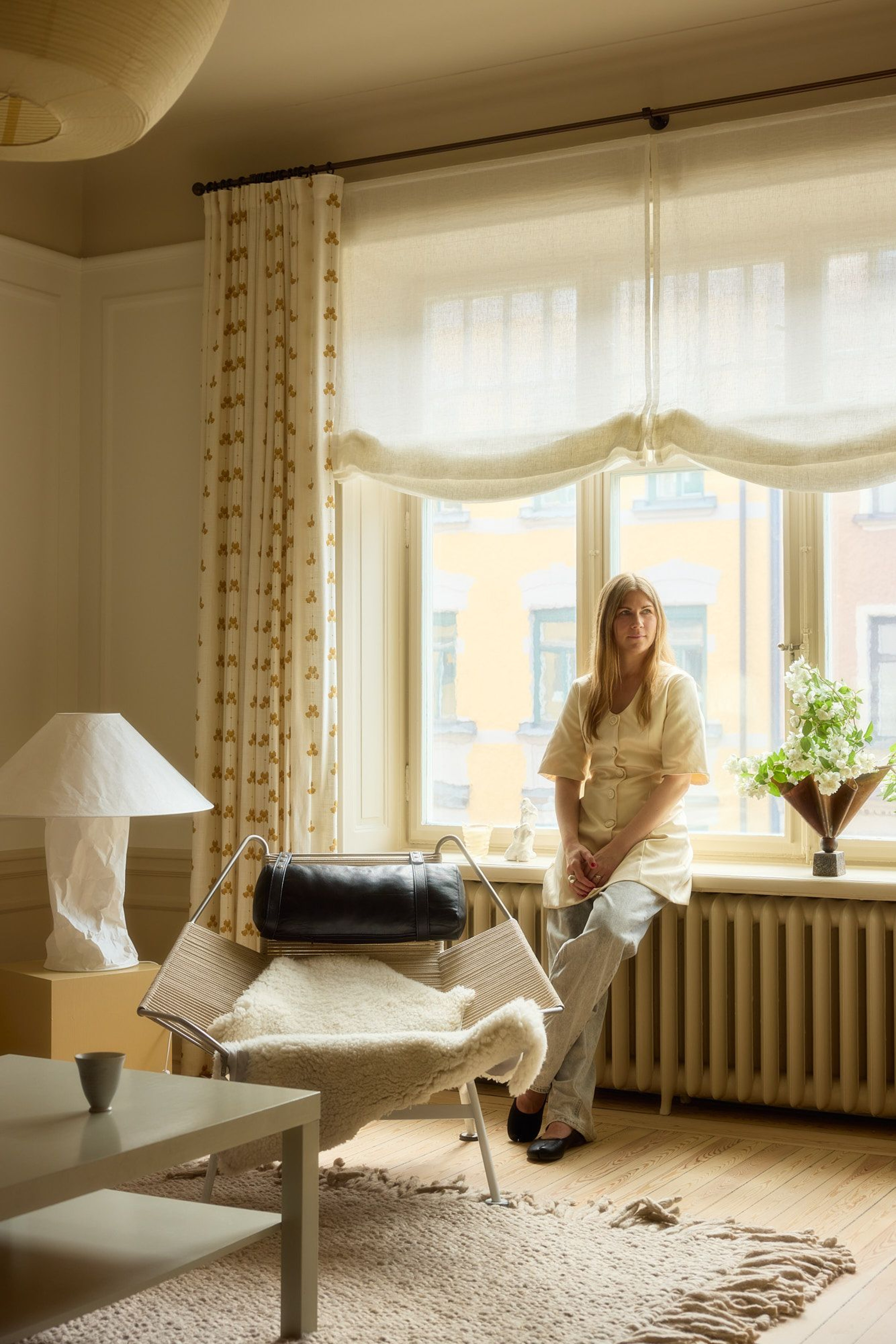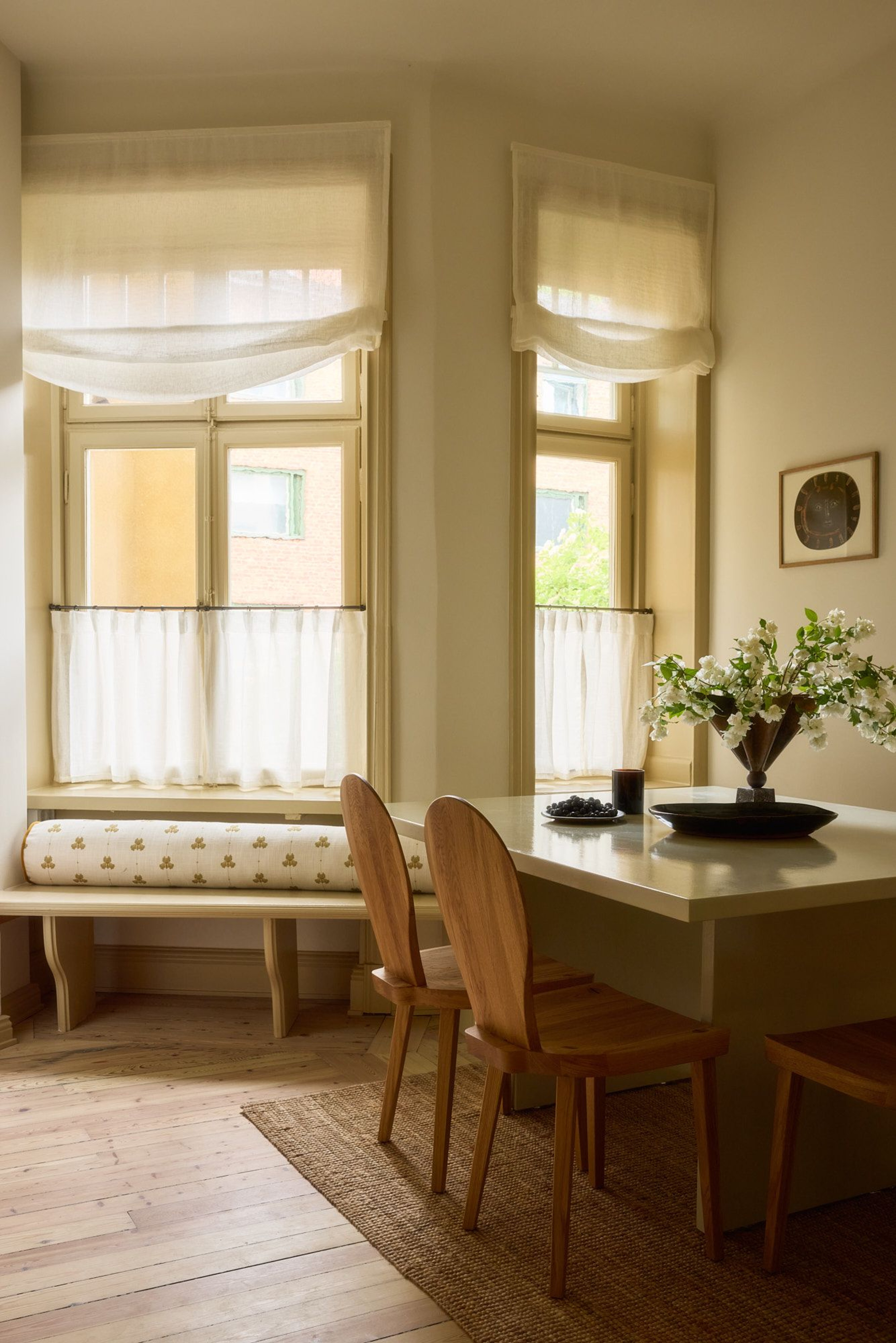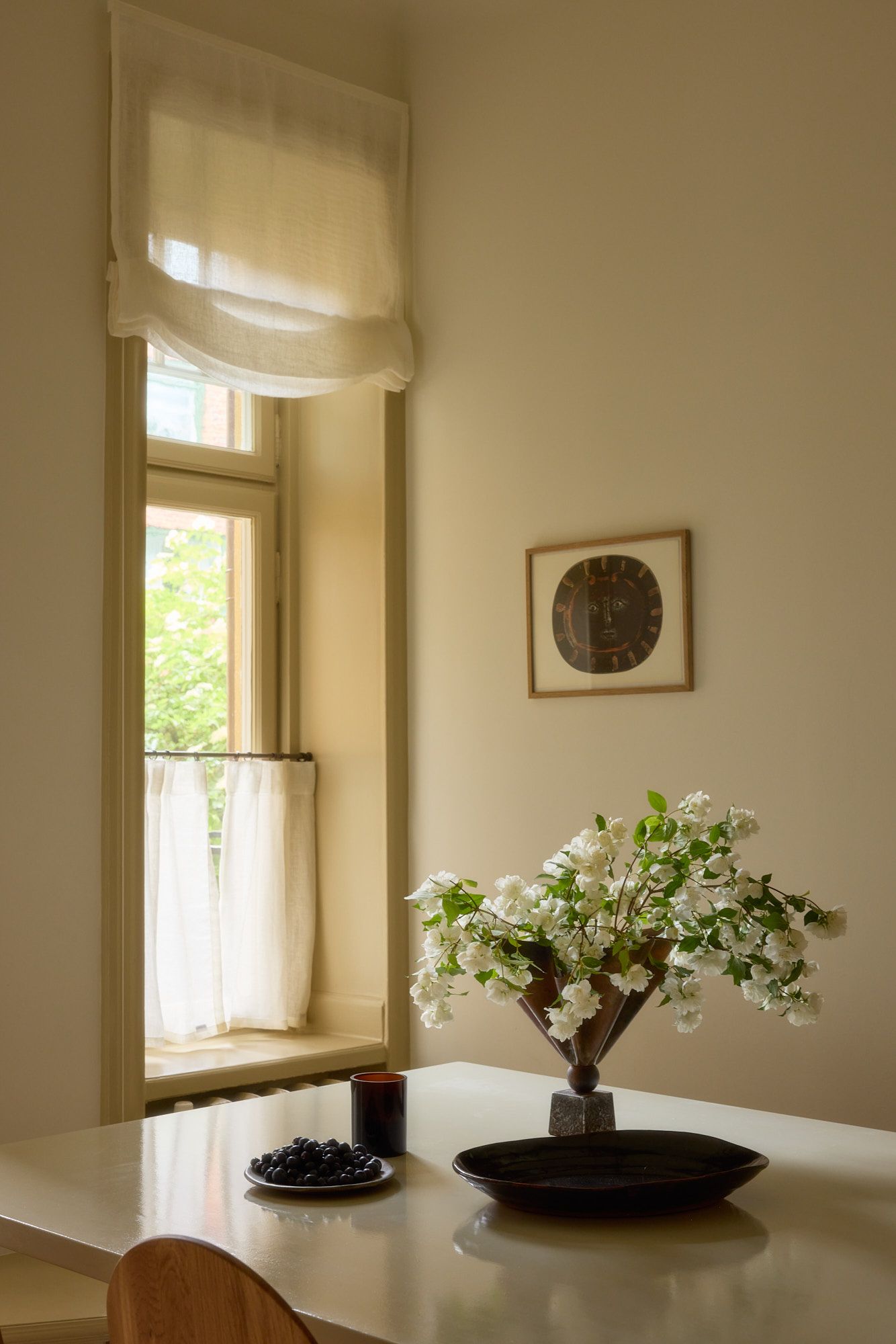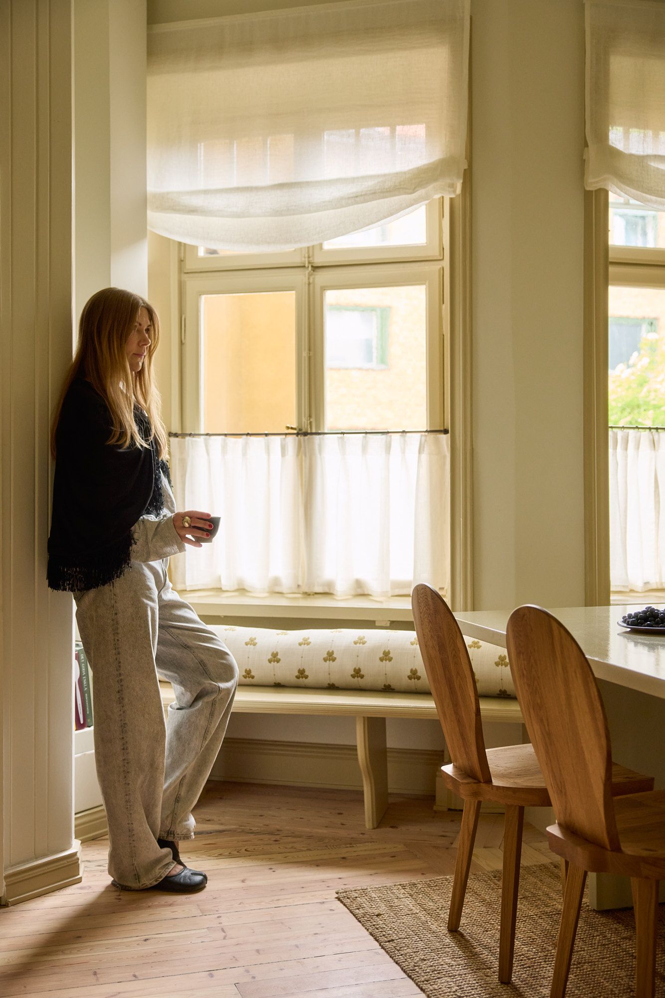 The kitchen windows are dressed in sheer off-white linen - both as Roman blinds and matching café curtains - letting the light in while maintaining a soft connection to the outside. At the dining area stands a large table designed by Hanne herself and built with the help of a carpenter. Around it, wooden chairs by Carl Malmsten - a meeting of contemporary design and Swedish furniture heritage. On the table, a collection of envy-inducing ceramics by Birgitta Waltz. Hanne smiles and tells us she gifted the pieces to herself when her first child was born.